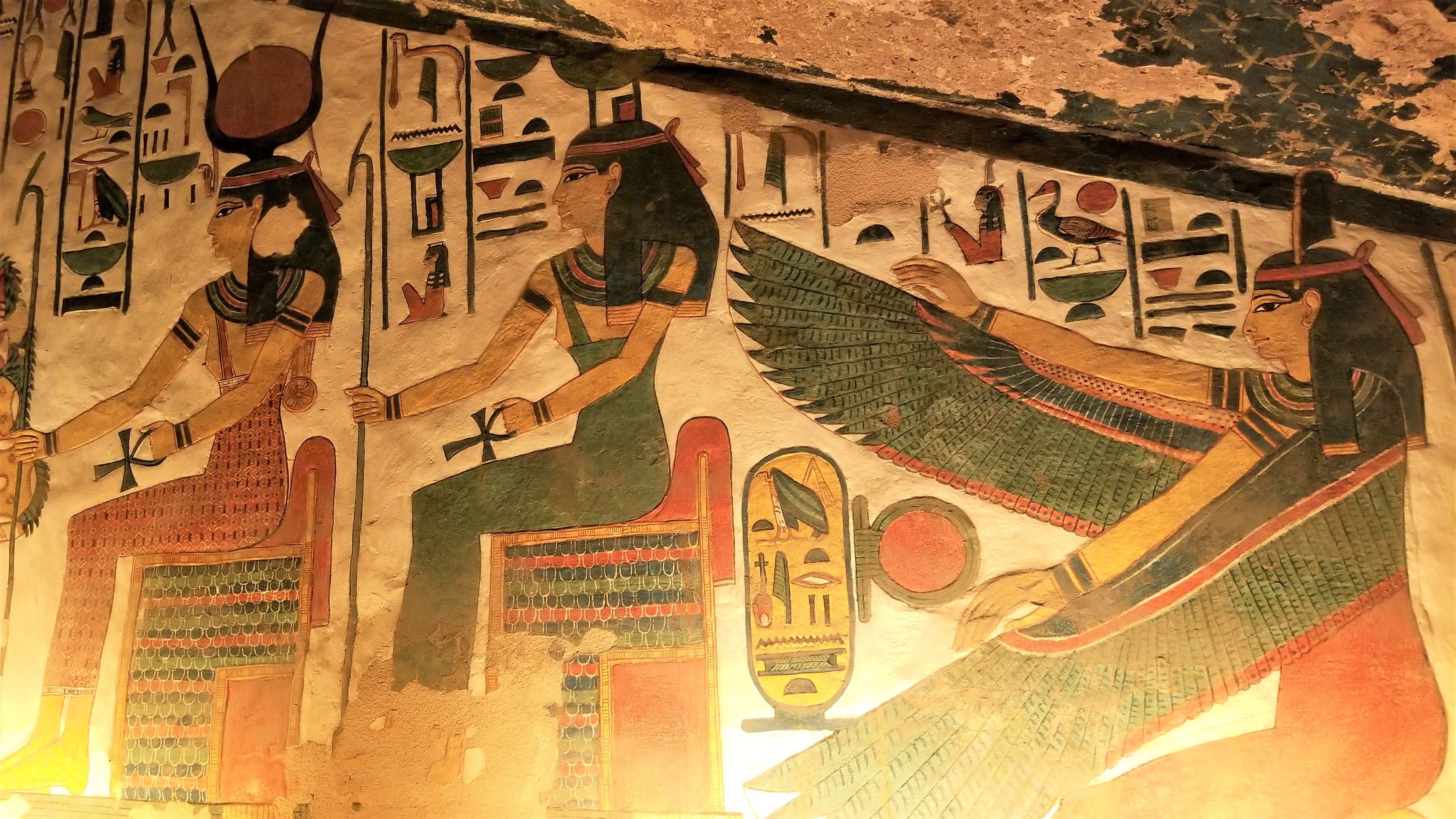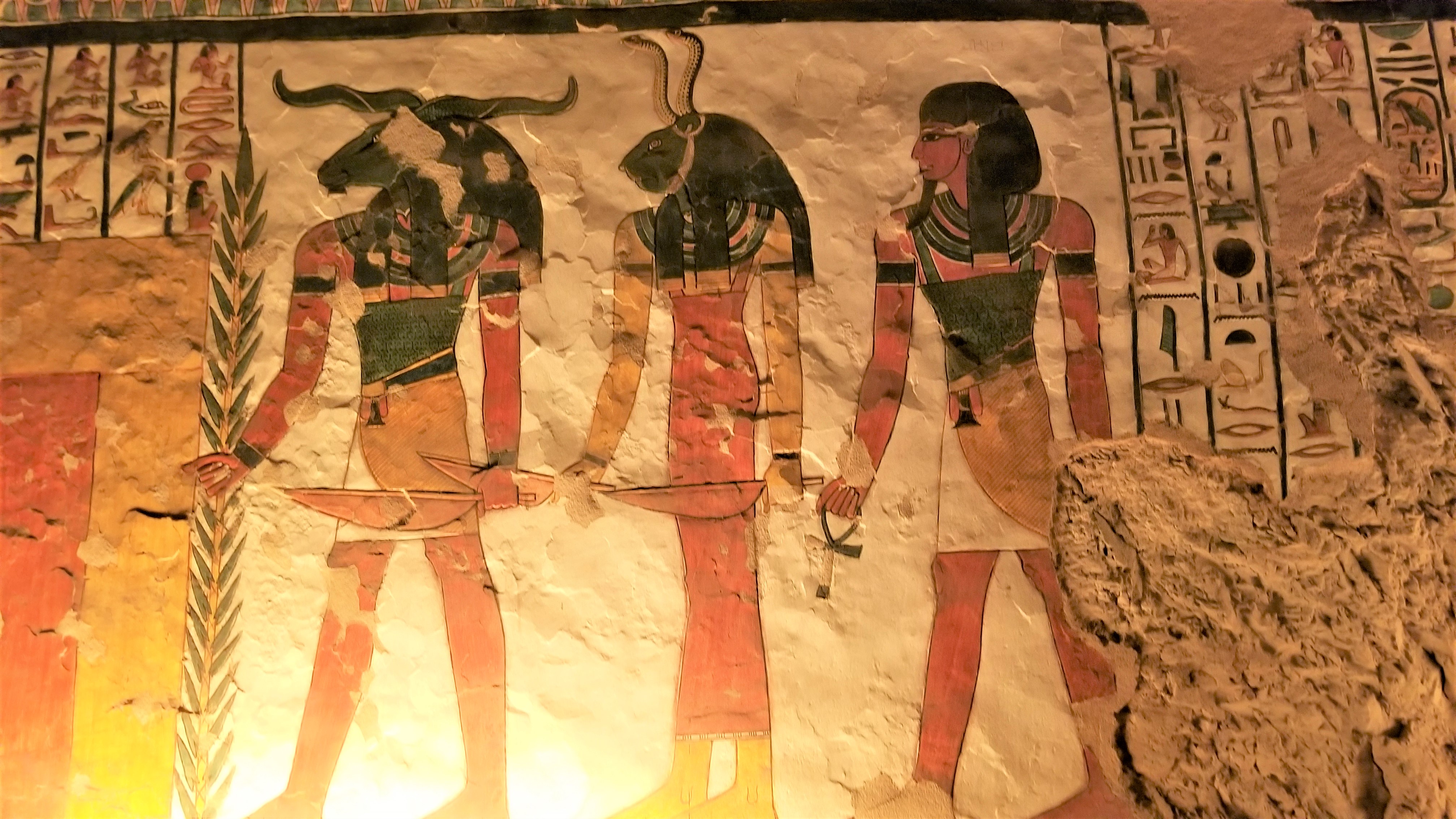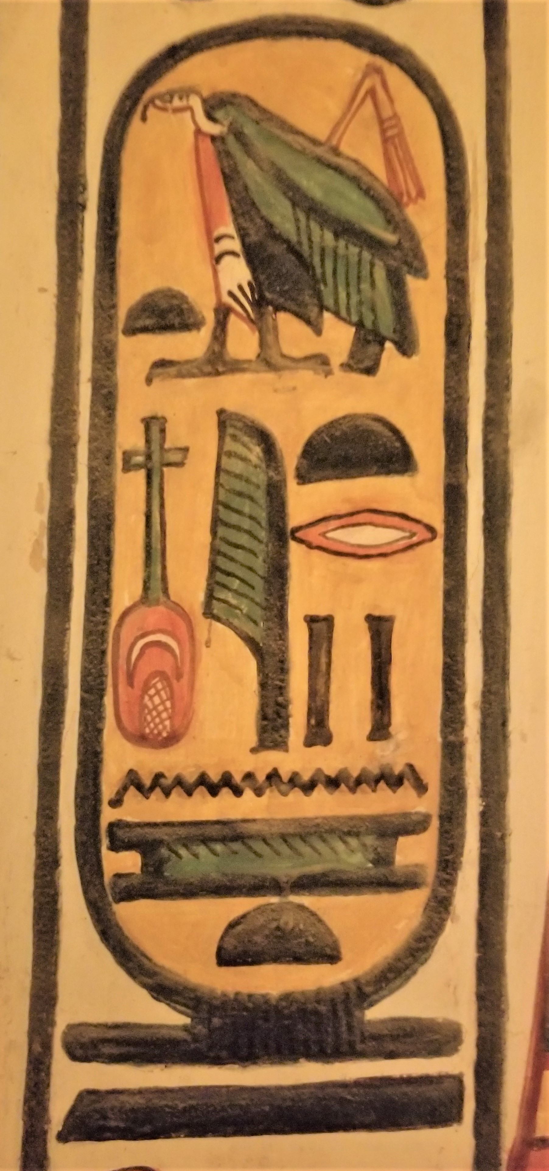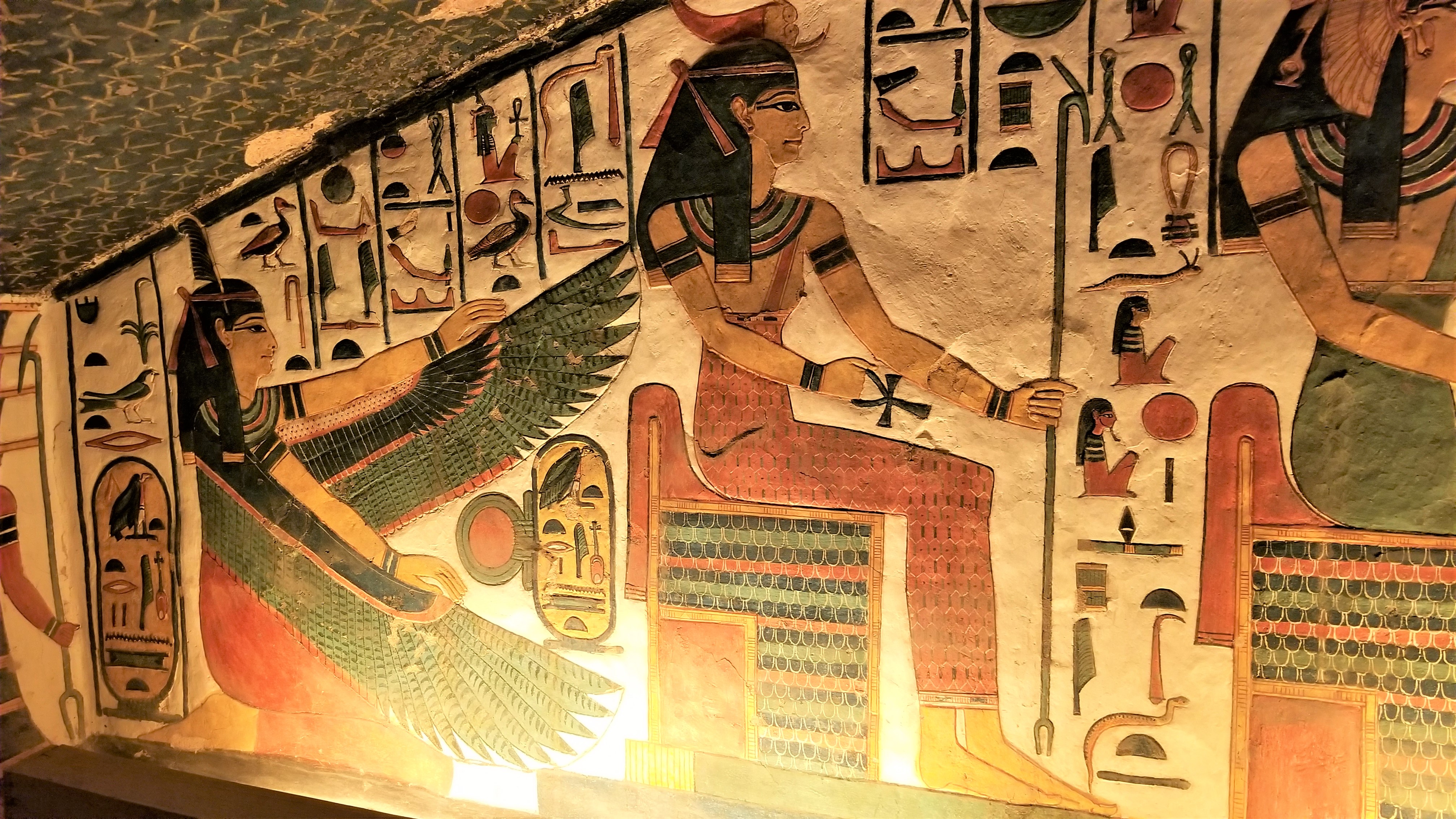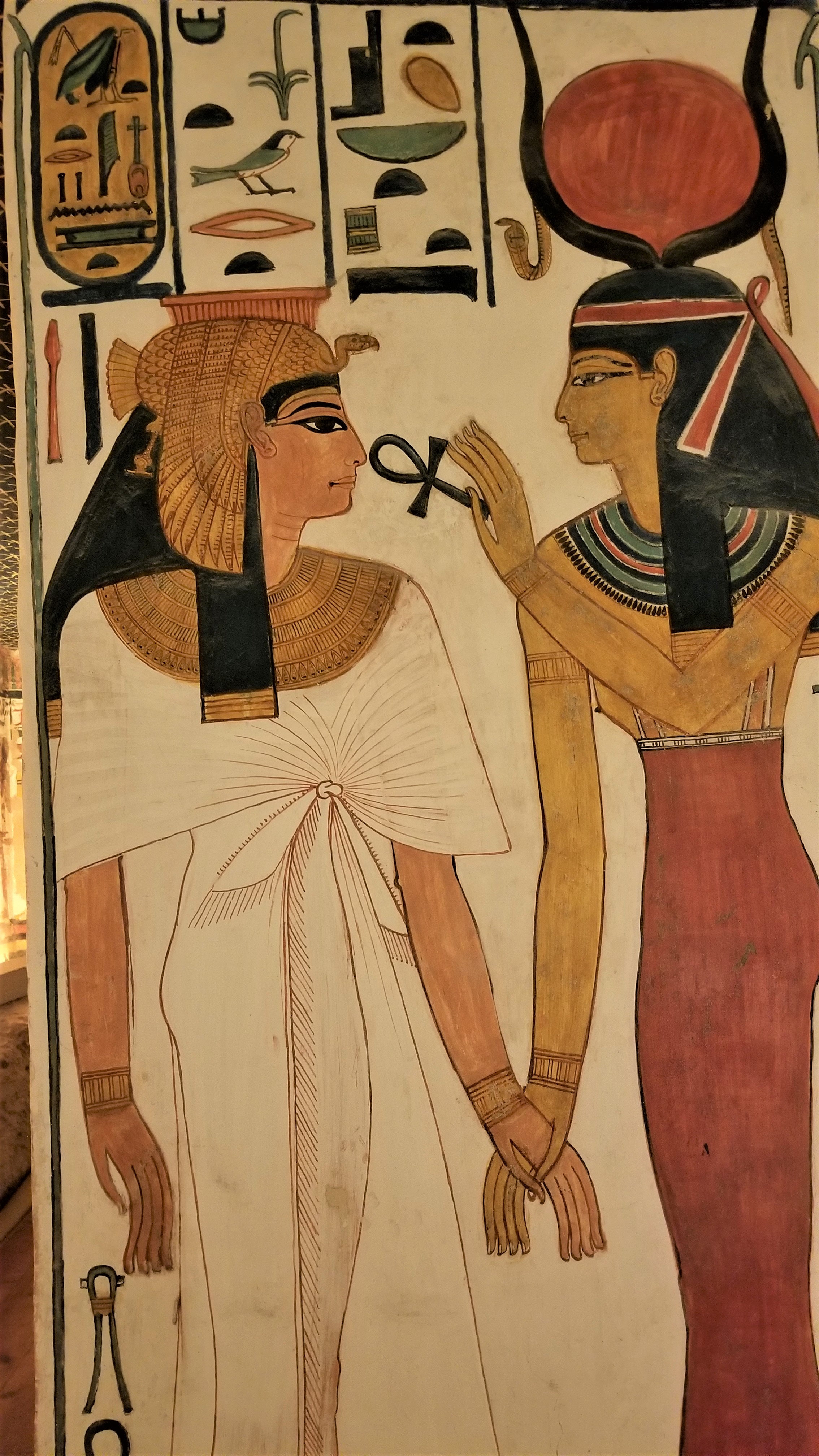 Her tomb is a display of fantastic color scenes of Gods protecting her on her journey to the after-life. Many of these Gods, Anubis (depicted as a jackal, protector of graves), Horus (depicted as a falcon, God of Sky), Ma’at (depicted as a lady with wings, she is “justice”), and Ptah (depicted as a man holding a long staff, creator of- maker of things / craftsmen) appear in every tomb, both Queen & King. There is also Ra, the sun God depicted as a circle; Sobeck, depicted as a crocodile; Apophus, depicted as a snake with 1 head (not to be confused with Uraeus, the Cobra and sign of nobility). A multi-head snake was the sign of evil or bad and appeared in a few tombs as being defeated by the Queen or King.