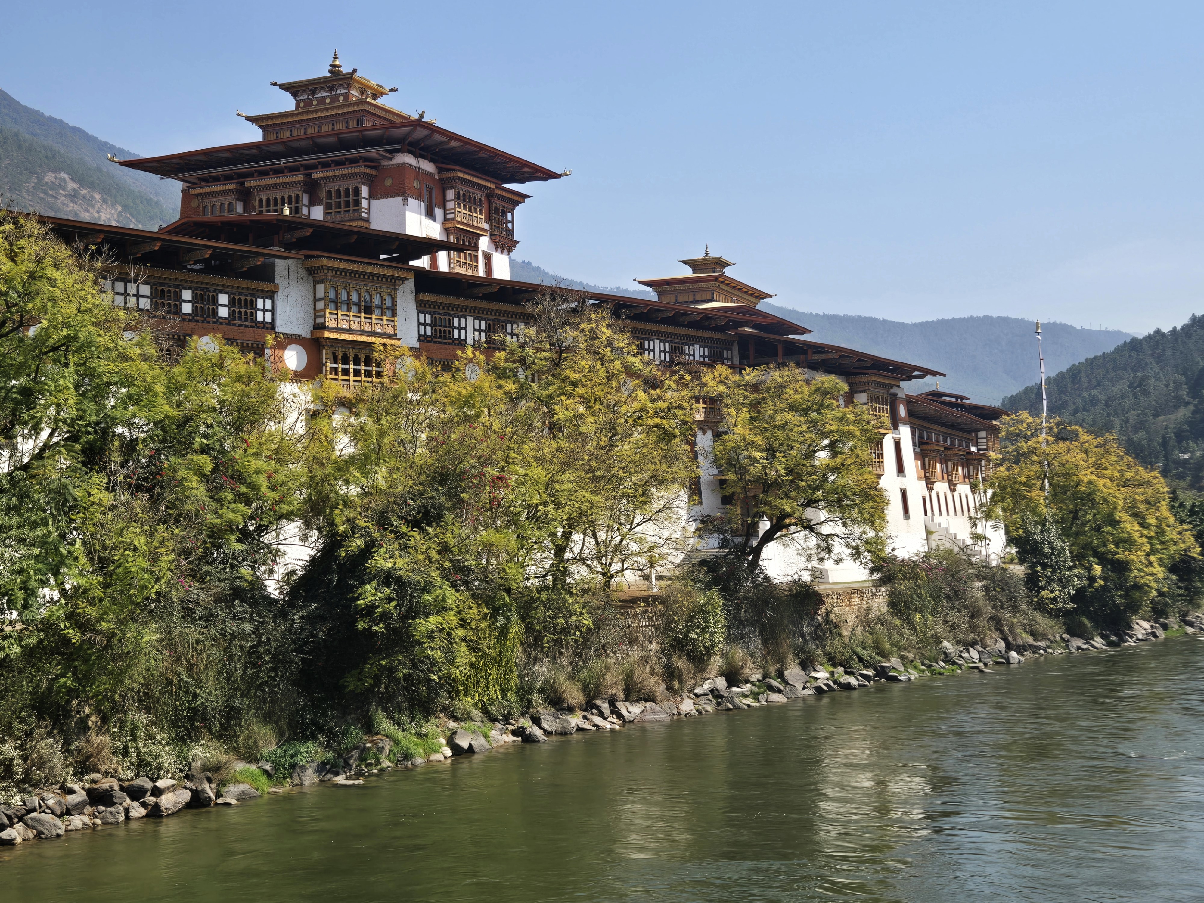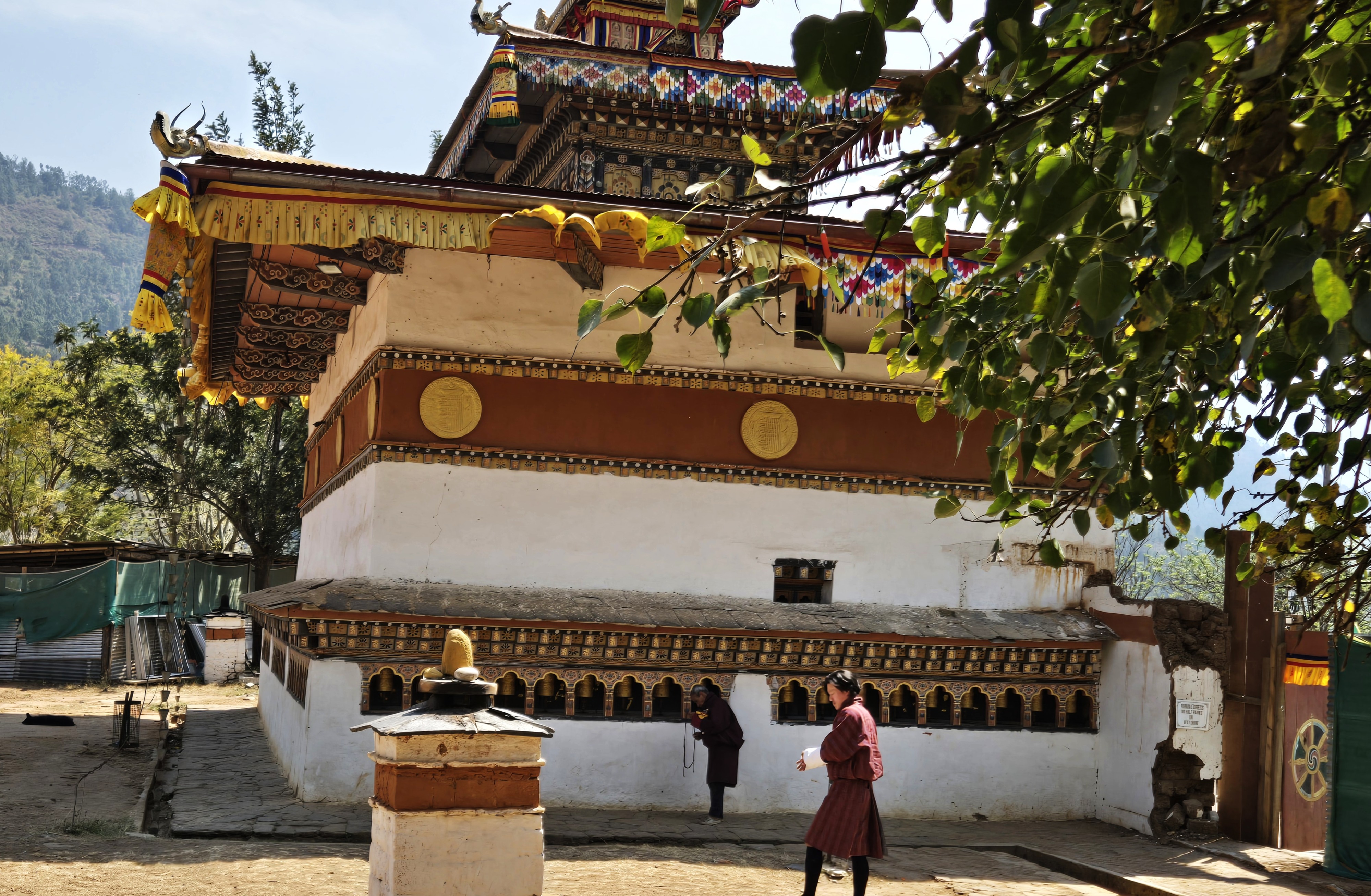 Dragging Collette away, we made our way for a quick lunch then to the next site, Punakha Dzong, the great fortress. One of Bhutan’s oldest, largest and most striking fortified monasteries, the Punakha Dzong holds an important relic over which many wars were fought with the Tibetans. The remains of Zhabdrung Ngawang Namgyel and the small self-created figure of Avalokitesvara from the remains of Tsangpa Gyaray (the founder of Drukpa-Kagyud Buddhist School) are housed in the Dzong. The stupa located in the fortress courtyard is the only stupa in Bhutan that faces north. Sam managed to find the only chicken in the fortress. I think the pigeons talked it into getting on the roof, now it’s stuck there!