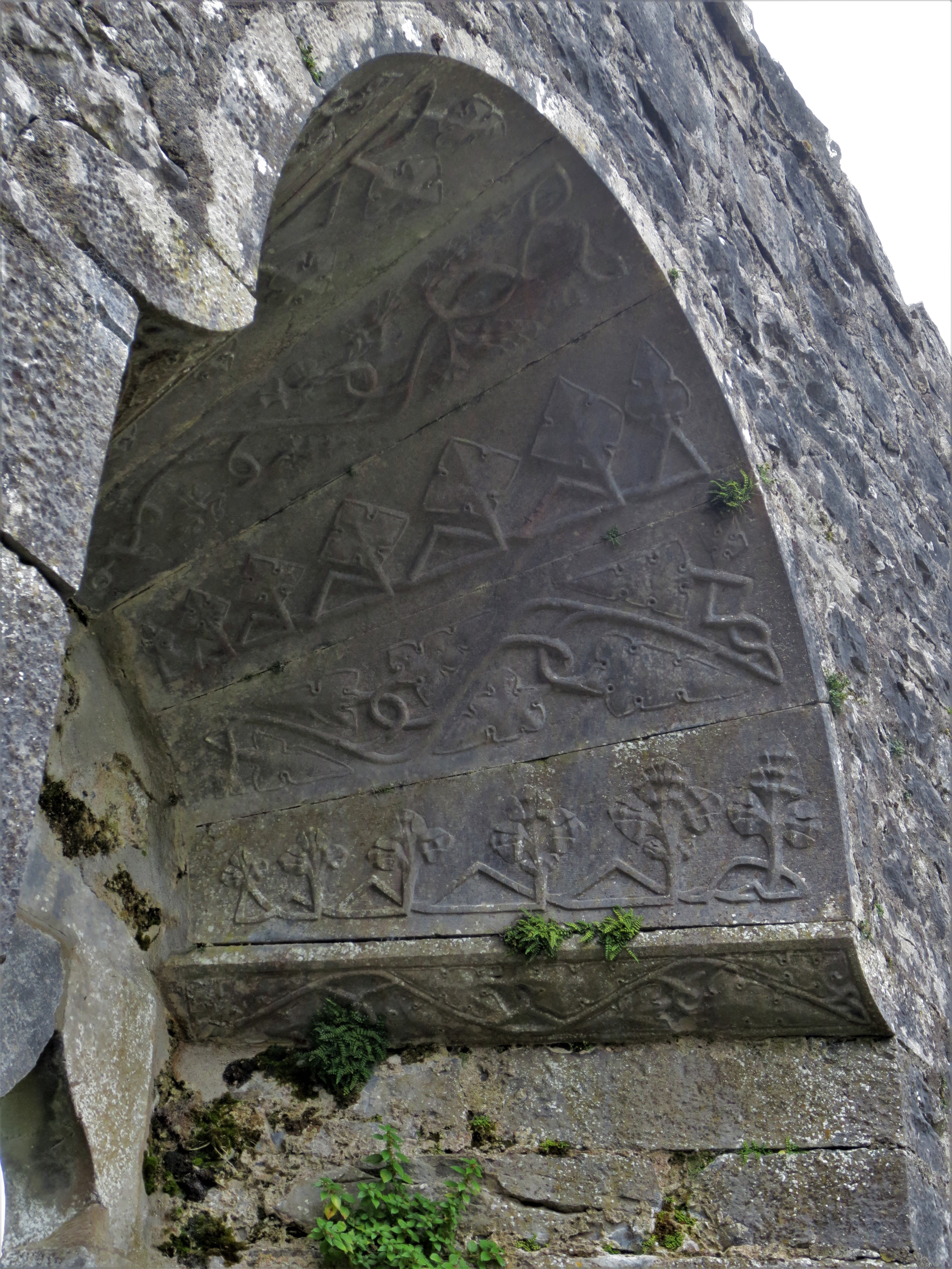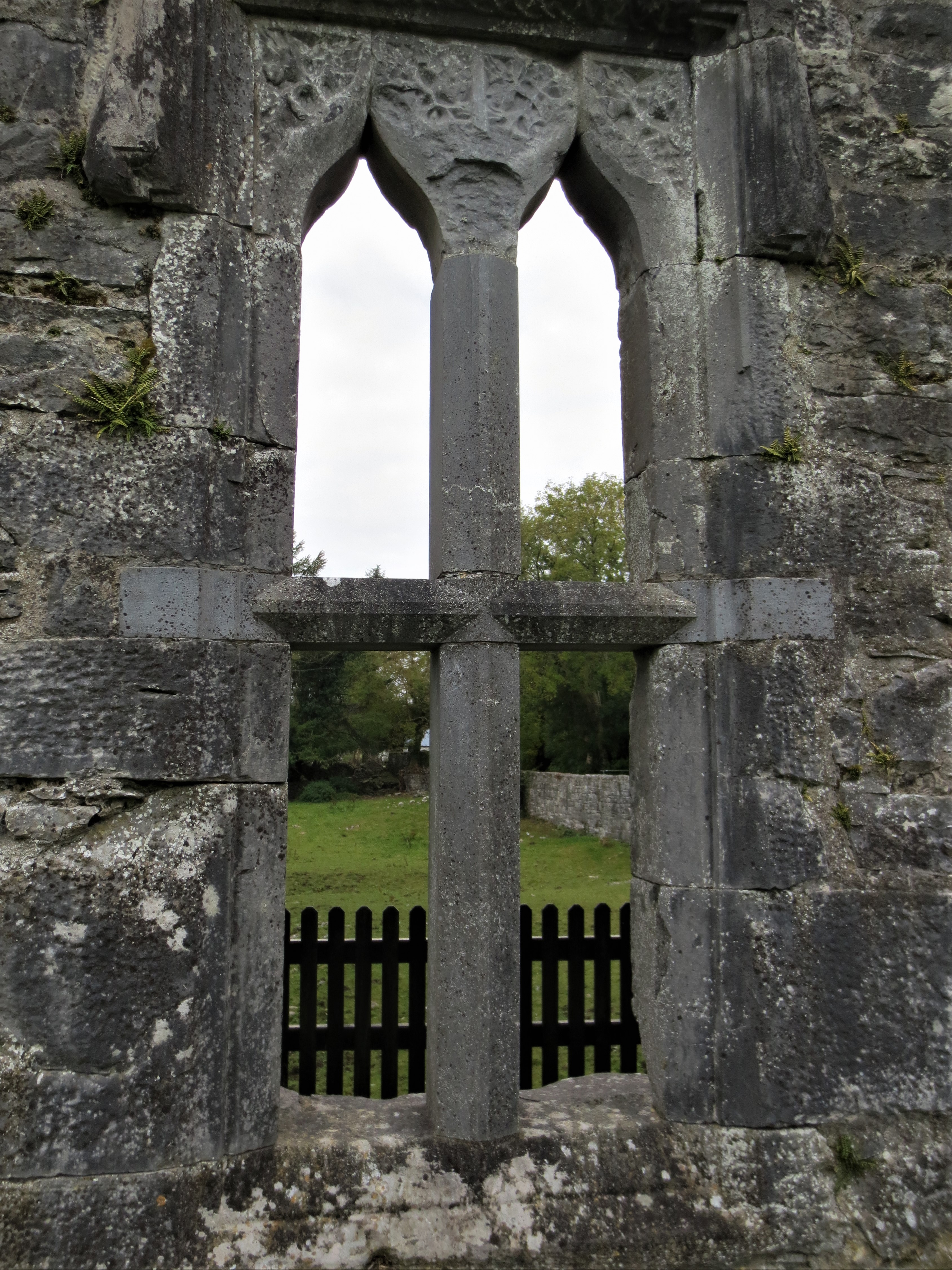 We did find the grounds interesting and took several pictures of some of the detailed carvings in the windows and walls. The banquet room was a separate building adjacent to the tower house within the first bawn, you know-a bawn. The building has long since deteriorated but one wall remains with windows and a doorway. At the top of the windows are impressive carvings of grape vines and leaves whilst the centers are separated by stone carved crosses. Again, pretty nice work for being 700 years old.