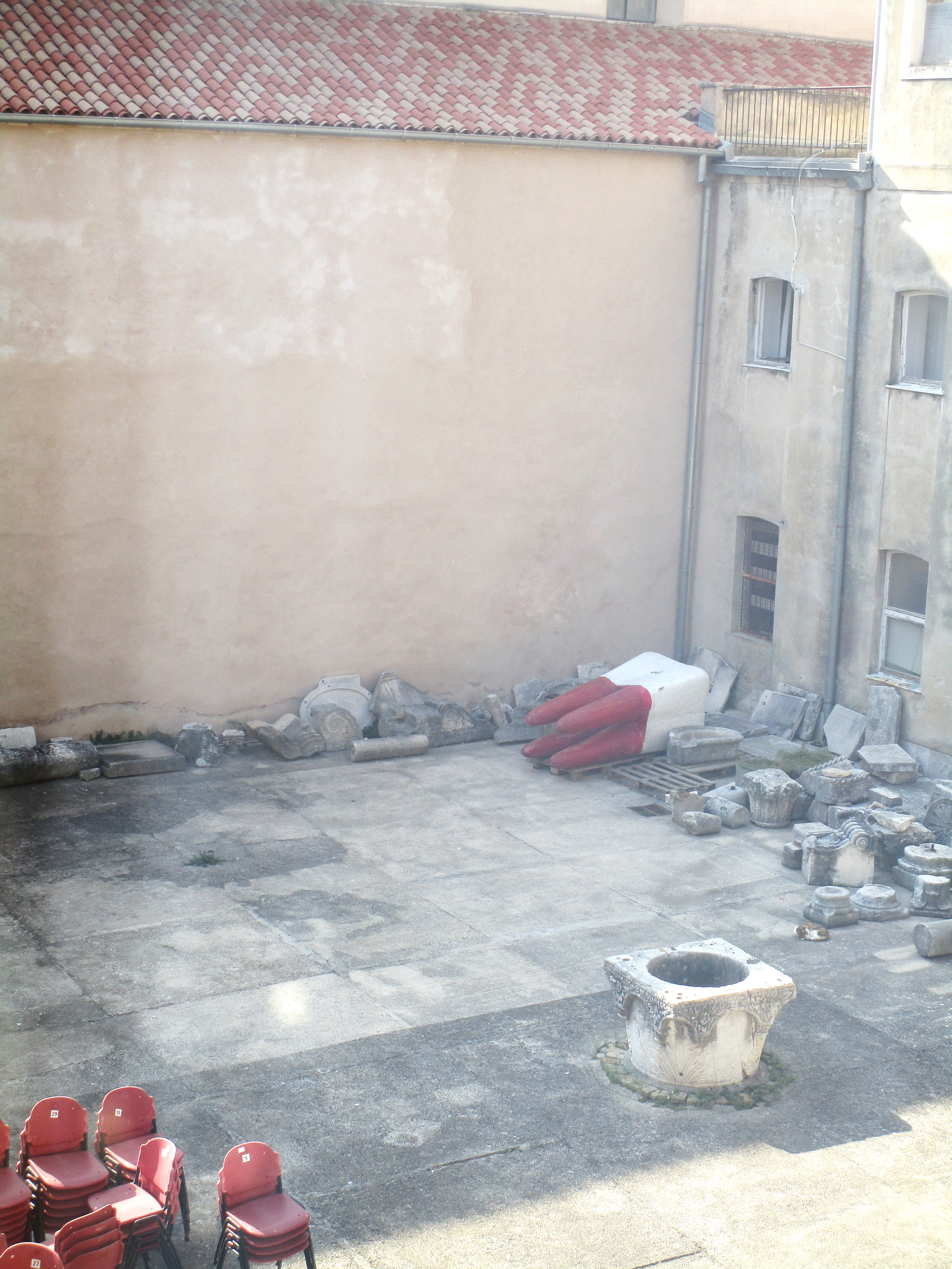 Courtyard in back of the apartment. Ancient ruin colonnades and a giant plaster tooth from a failed dental service. Huh?