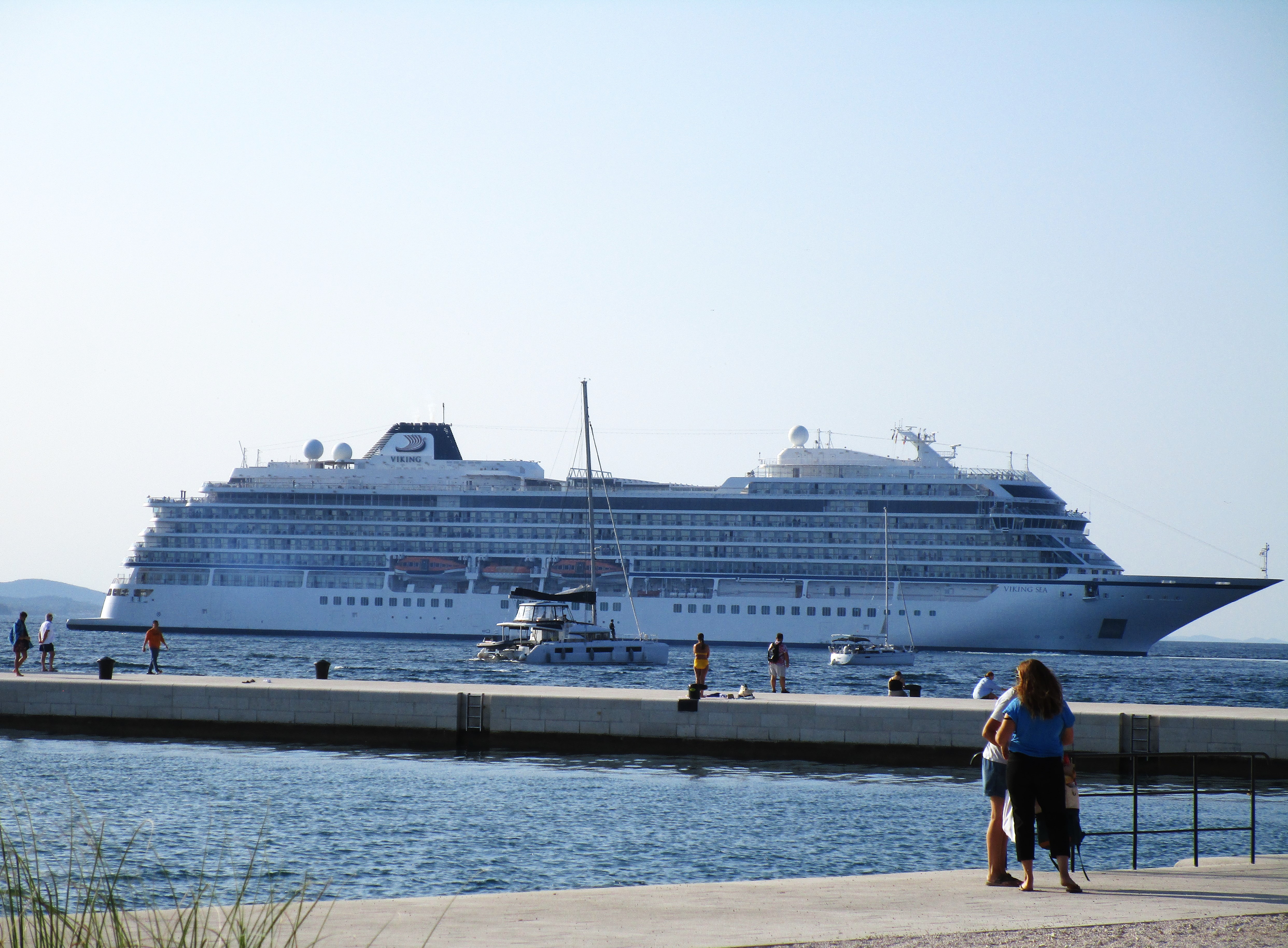 Checked in, unpacked and decided to head out for an initial walk around the neighborhood. This quickly became a stroll to the ocean, Zadar sits on the shores of the Adriatic Sea, to see what’s there. We were a little surprised to see a Viking cruise ship just at the end of the promenade. Didn’t realize we would have to contend with crowds from cruise ships, but so be it. Guess we’ll find a small restaurant on the beach, have a glass of wine, and let the day pass by.