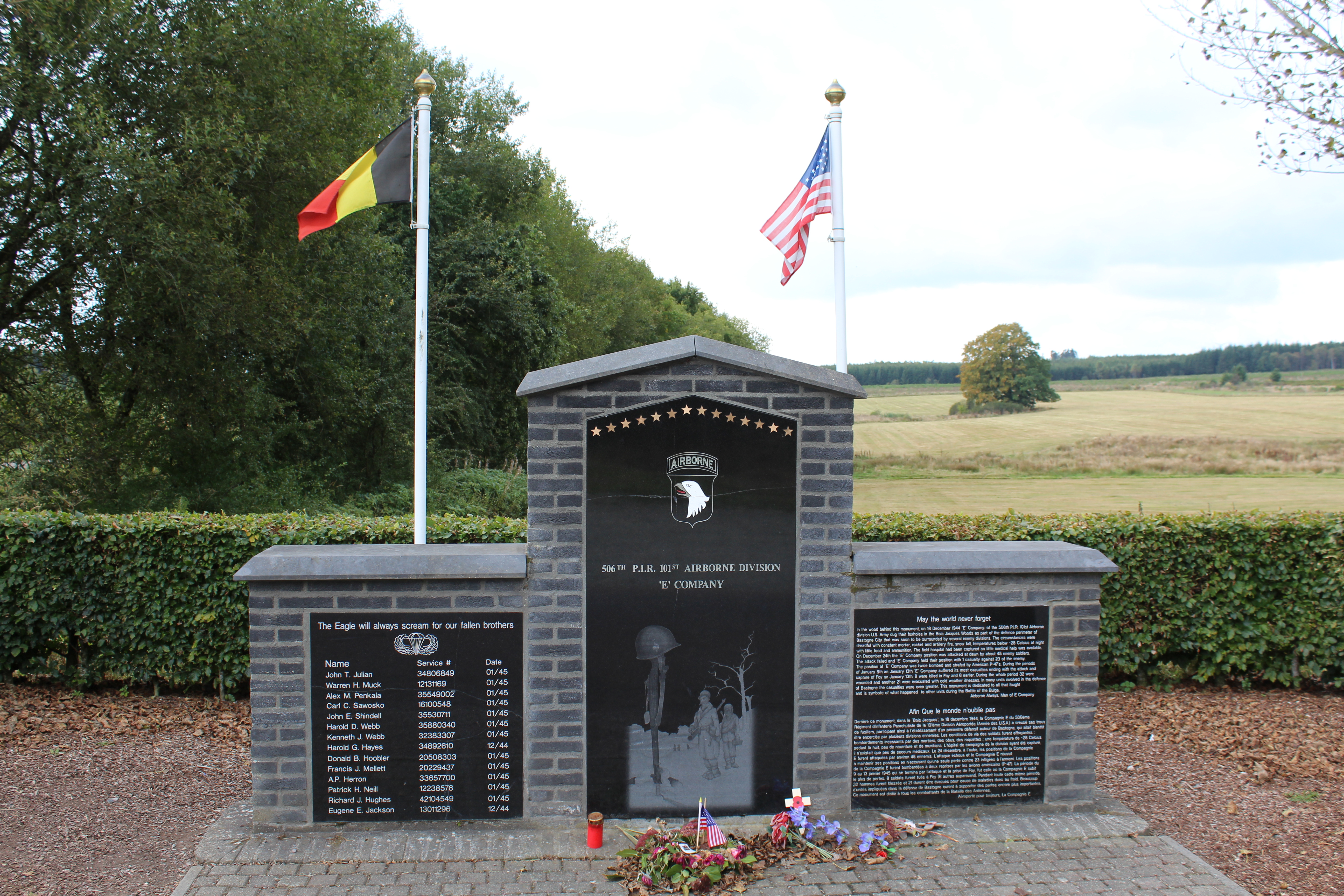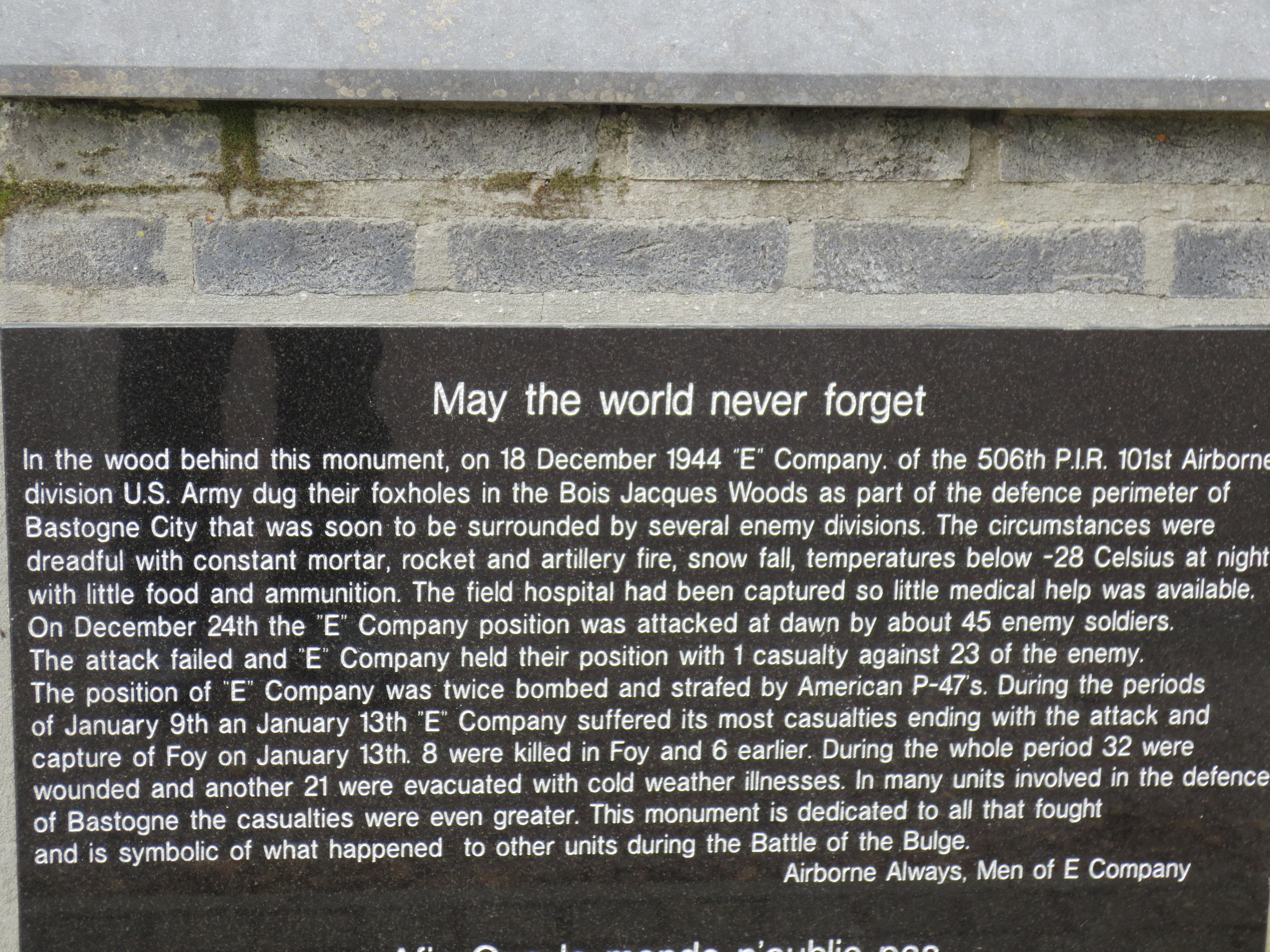 From December 1944 to January 1945, Easy Company fought German forces in the Ardennes with no winter clothing, limited ammunition and low food supplies. From January 1 to January 13, 1945, Easy Company took control of the woods and turned their action towards taking Foy. This completed the Allied action to take Bastogne.