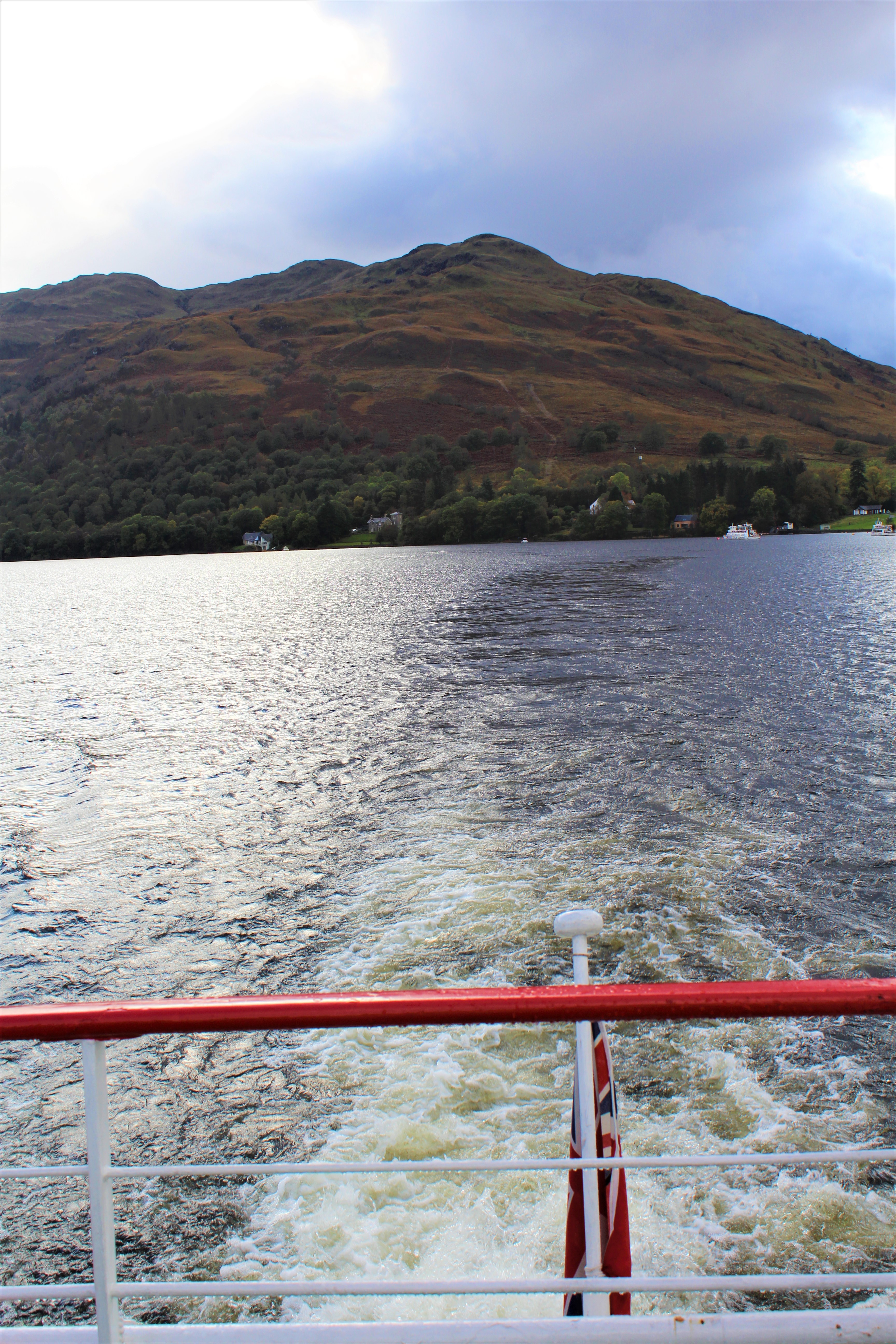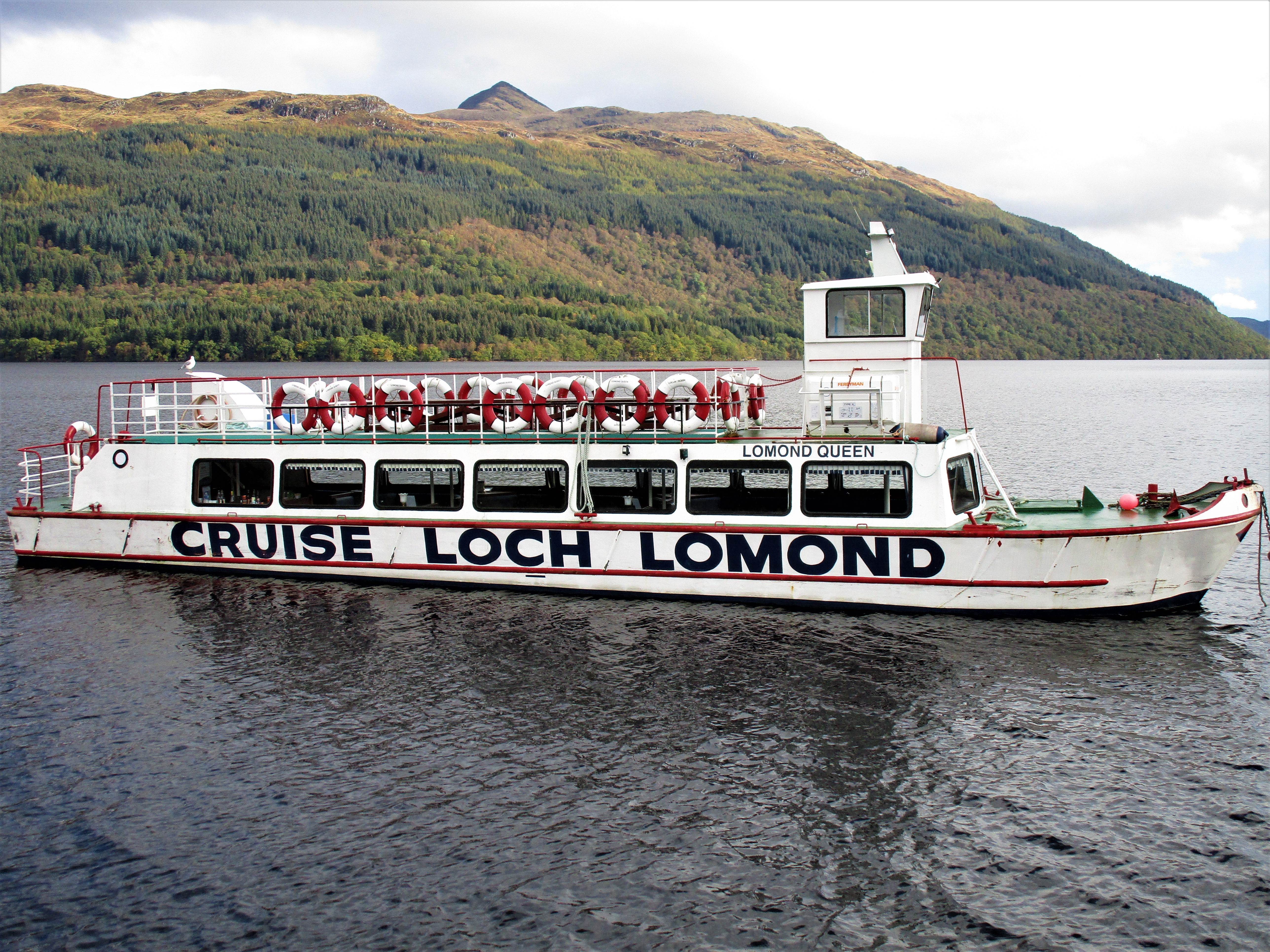 Just across the street from the café there is a boat tour of the loch. “Cruise Loch Lomond” tours offers a nice 1-hour cruise around the mid-point of the loch and a couple of the islands. All this for only 10GBP, what a deal! We got on board just in time as another squall to came through and drenched an already soaking parking lot. Wouldn’t be a very good ride if the rain continued but as luck would have it, the skies cleared a bit and the rain stopped. Time to go to the upper deck for some pictures.