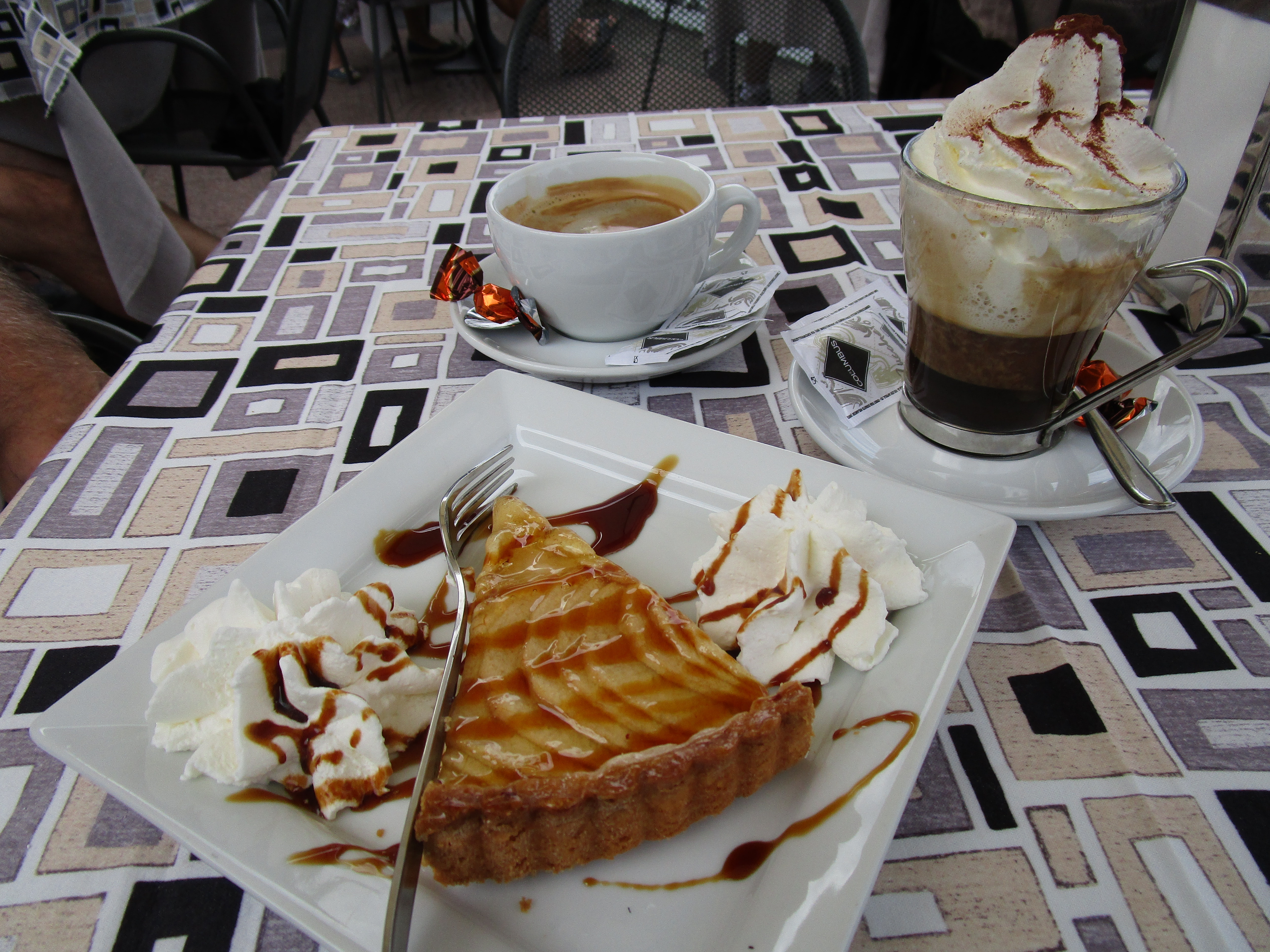 We walked for a couple of hours so time for a meal, or at least something to drink. As with most European cities, the common practice is to find a table at a small bistro, order the strongest, smallest cup of coffee known to man and a pastry. Relax at the table and enjoy your drink and food while watching the tourists hustle to the next stop. It’s really kind of fun except you do have to water down the java!