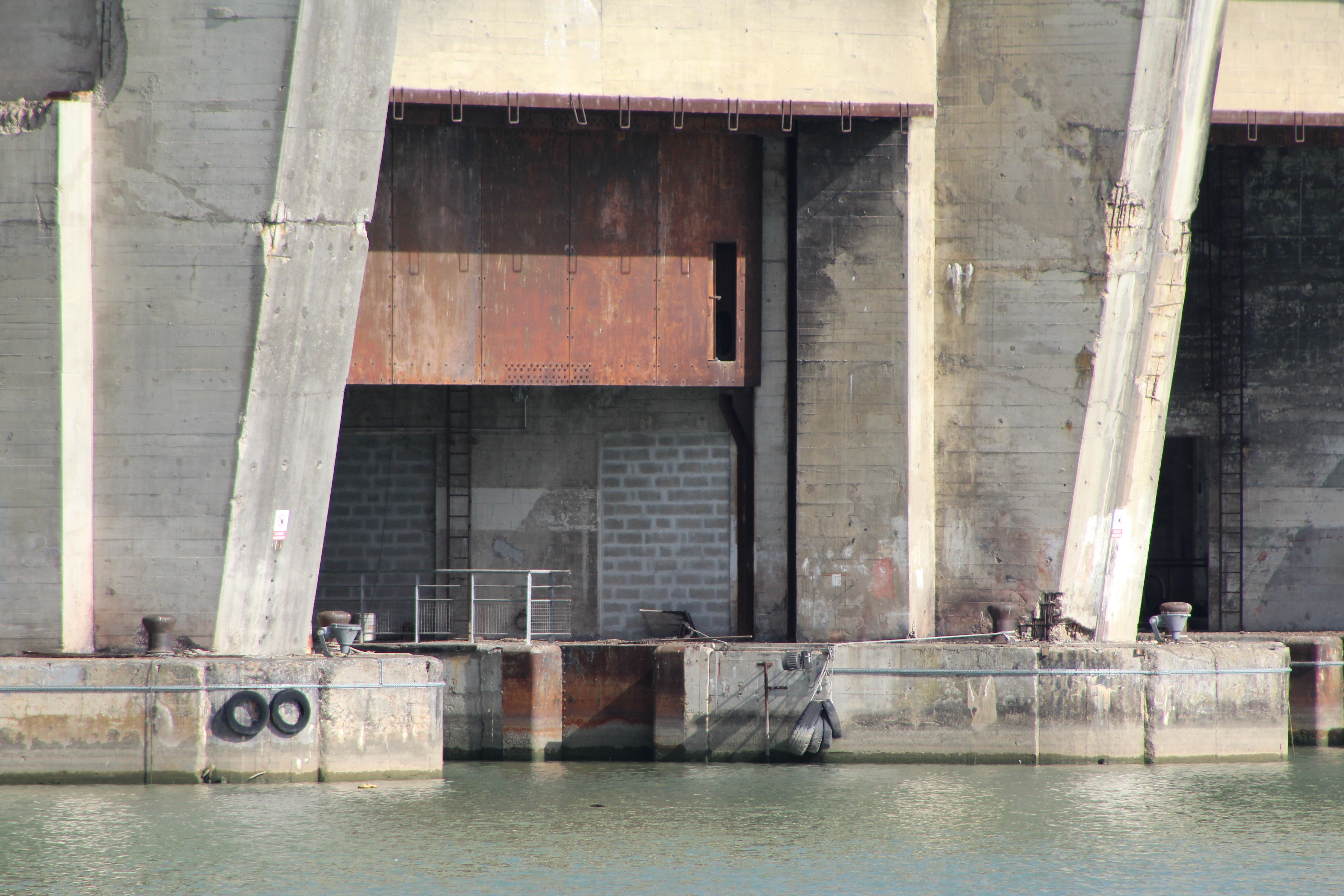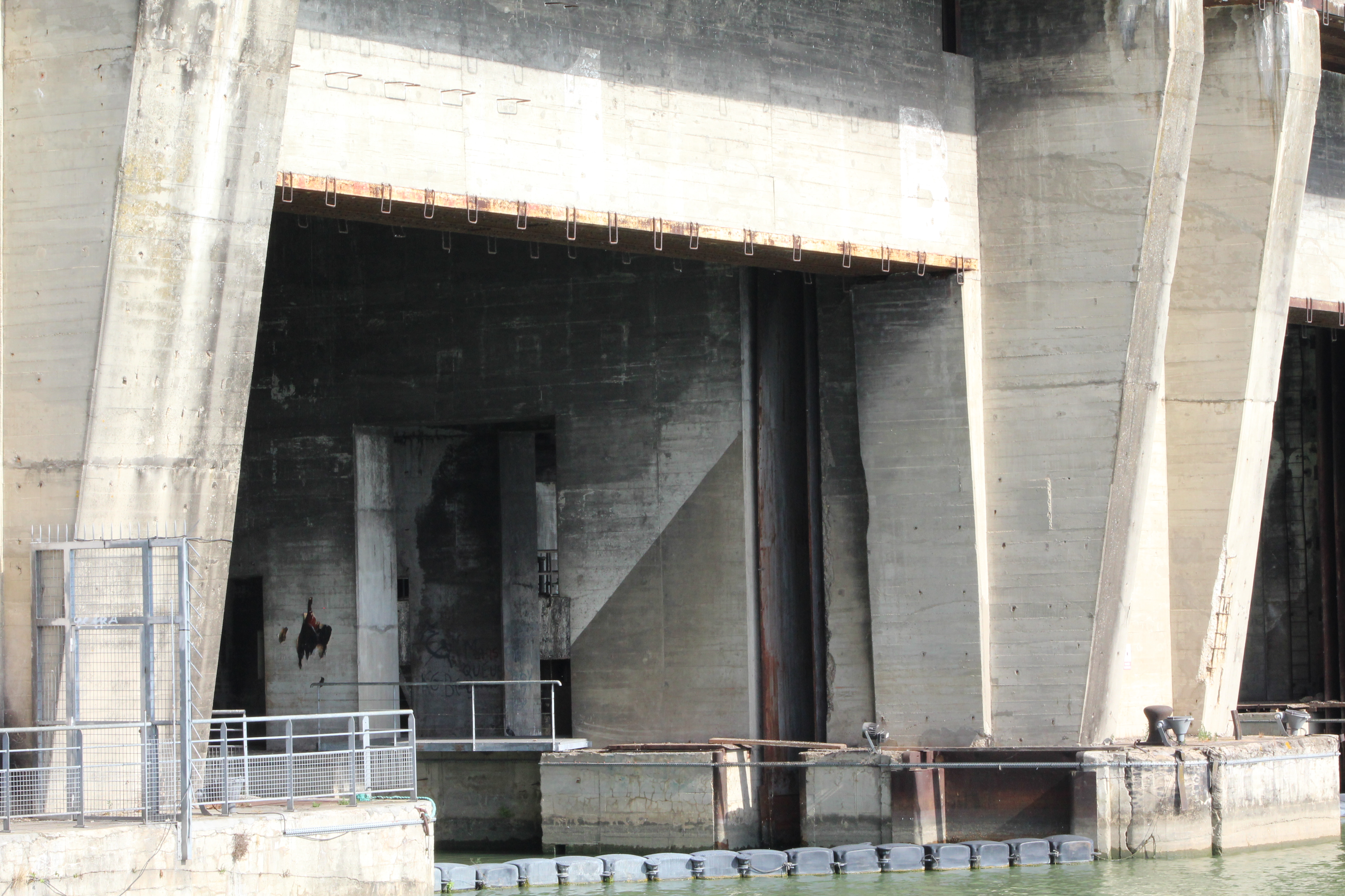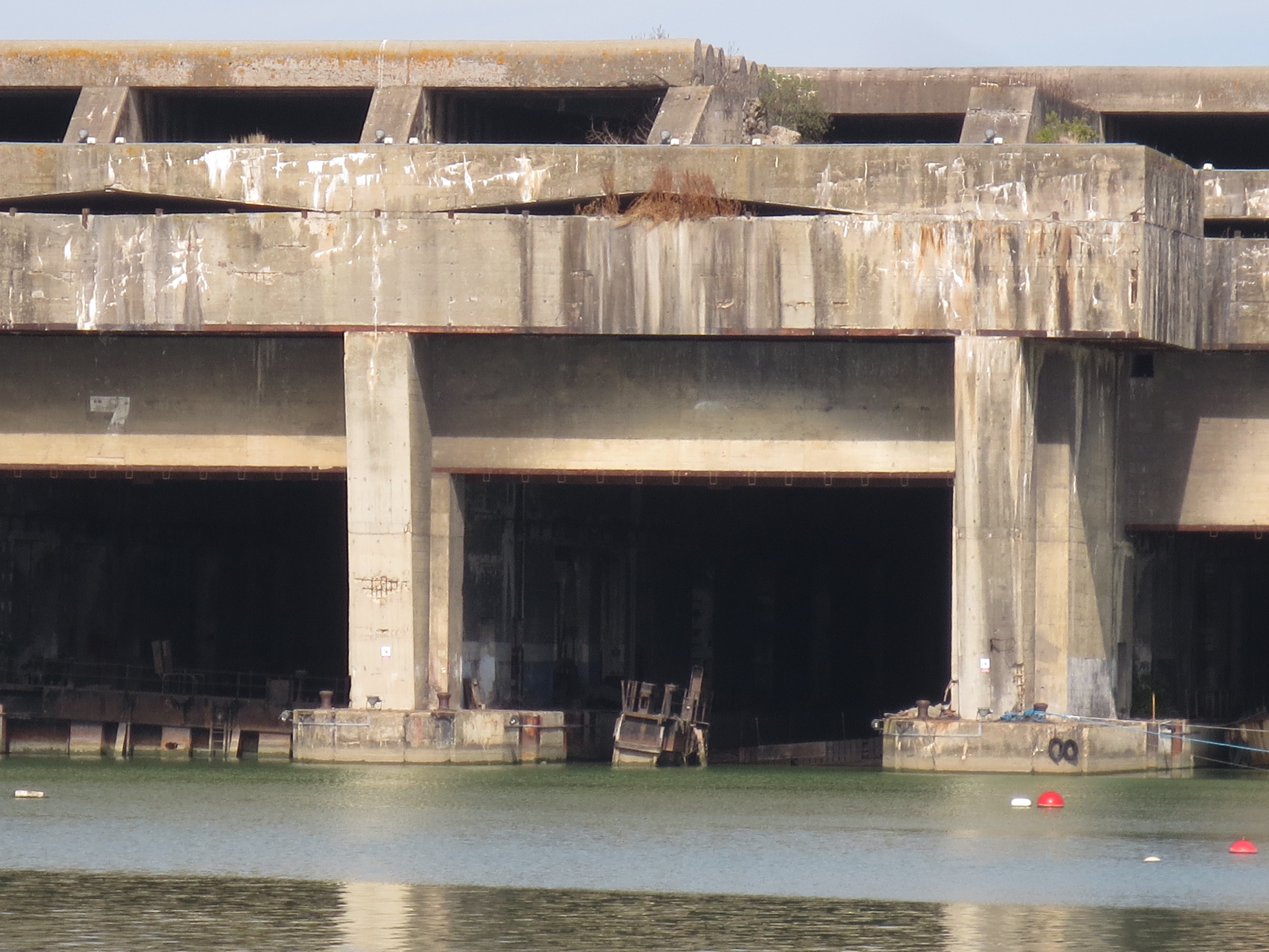 Building of the bunker began in 1941 and was designed for both refit and servicing. The 11 docks were divided into 4 “wet” and 7 “dry”, with the total building being some 800′ long, 530′ deep and 60′ high. The roof is steel reinforced concrete 30′ thick in a “fangrost” design, large half-round beams that would “trap” or deflect a bomb between them so as not to allow a direct hit on a flat roof.