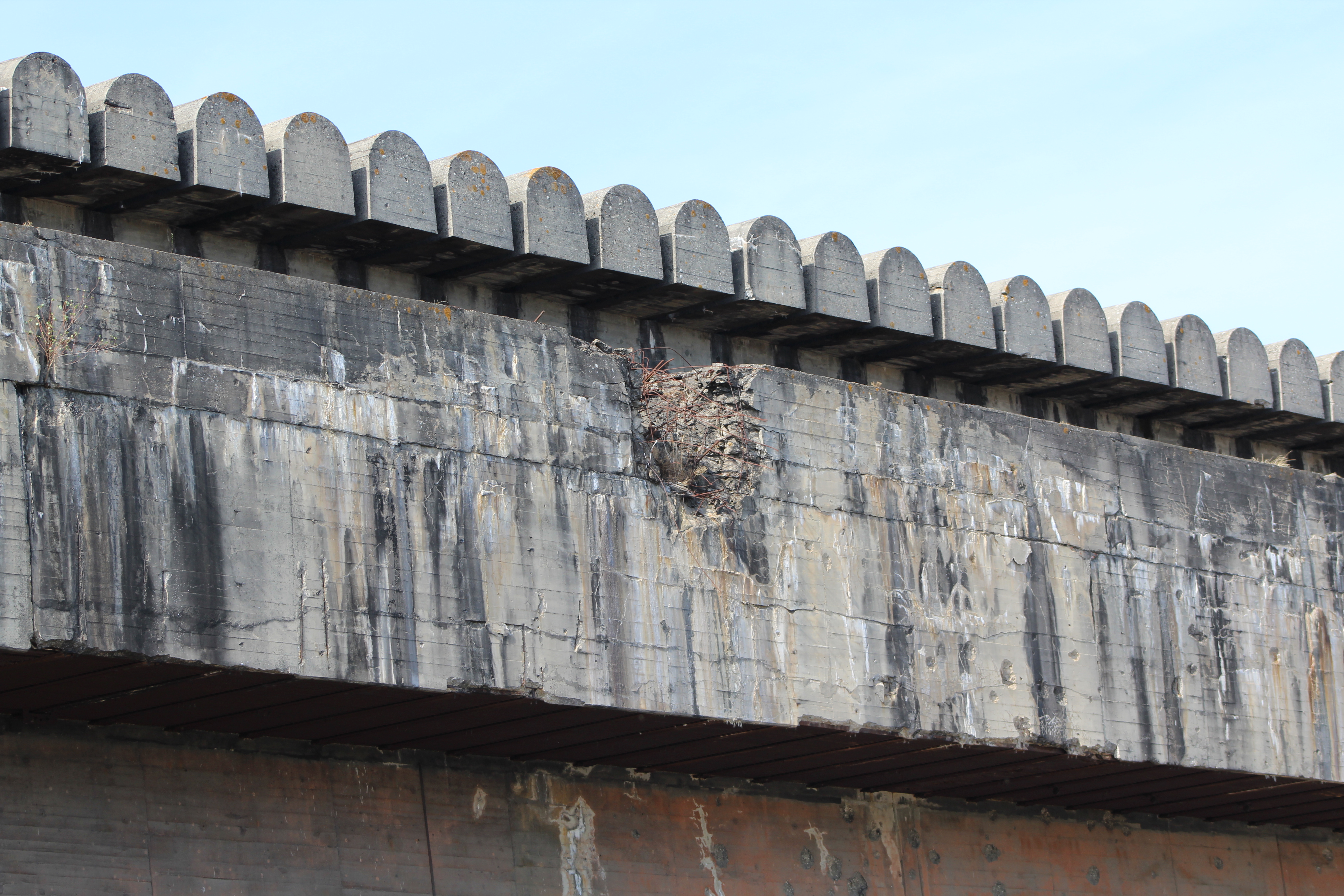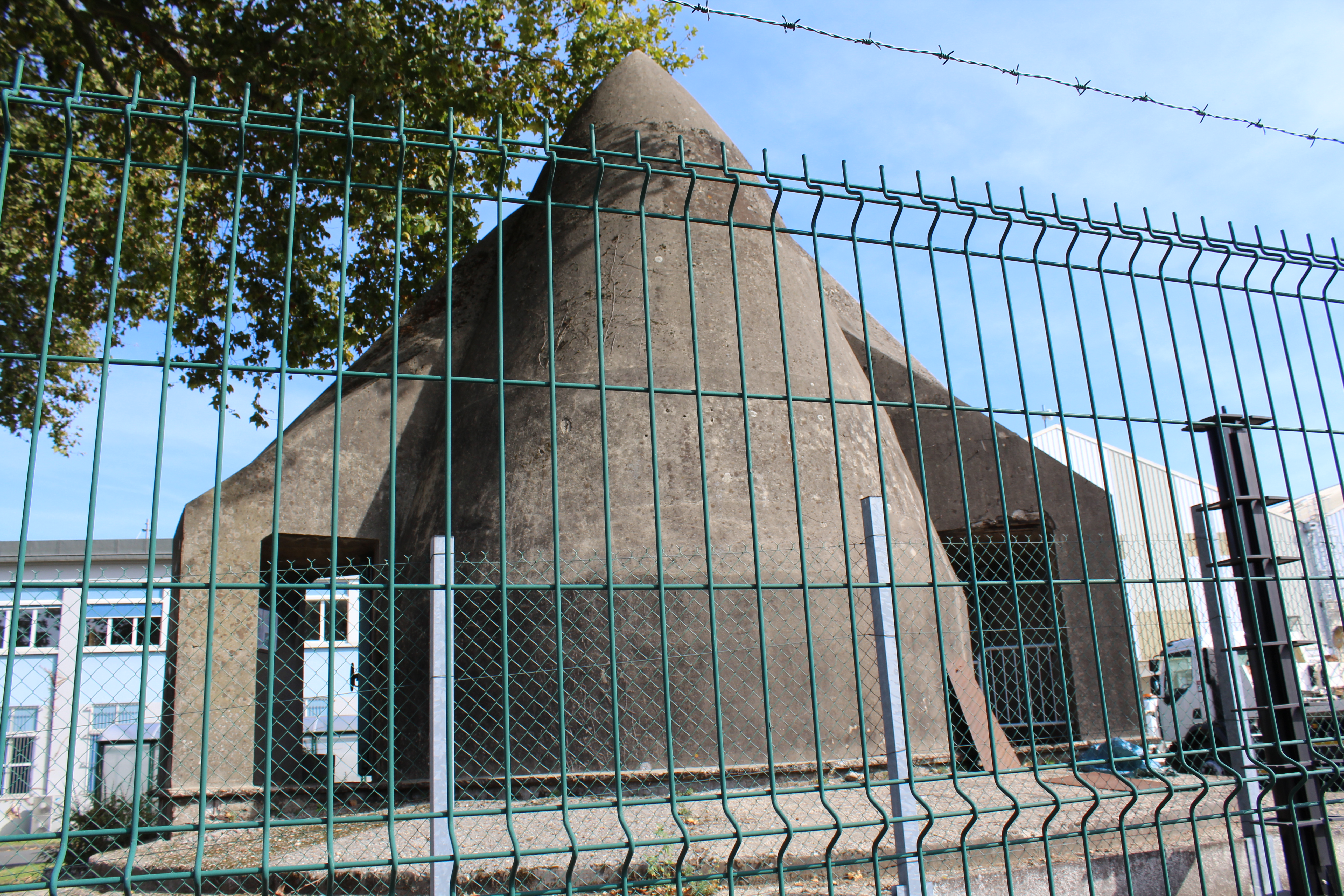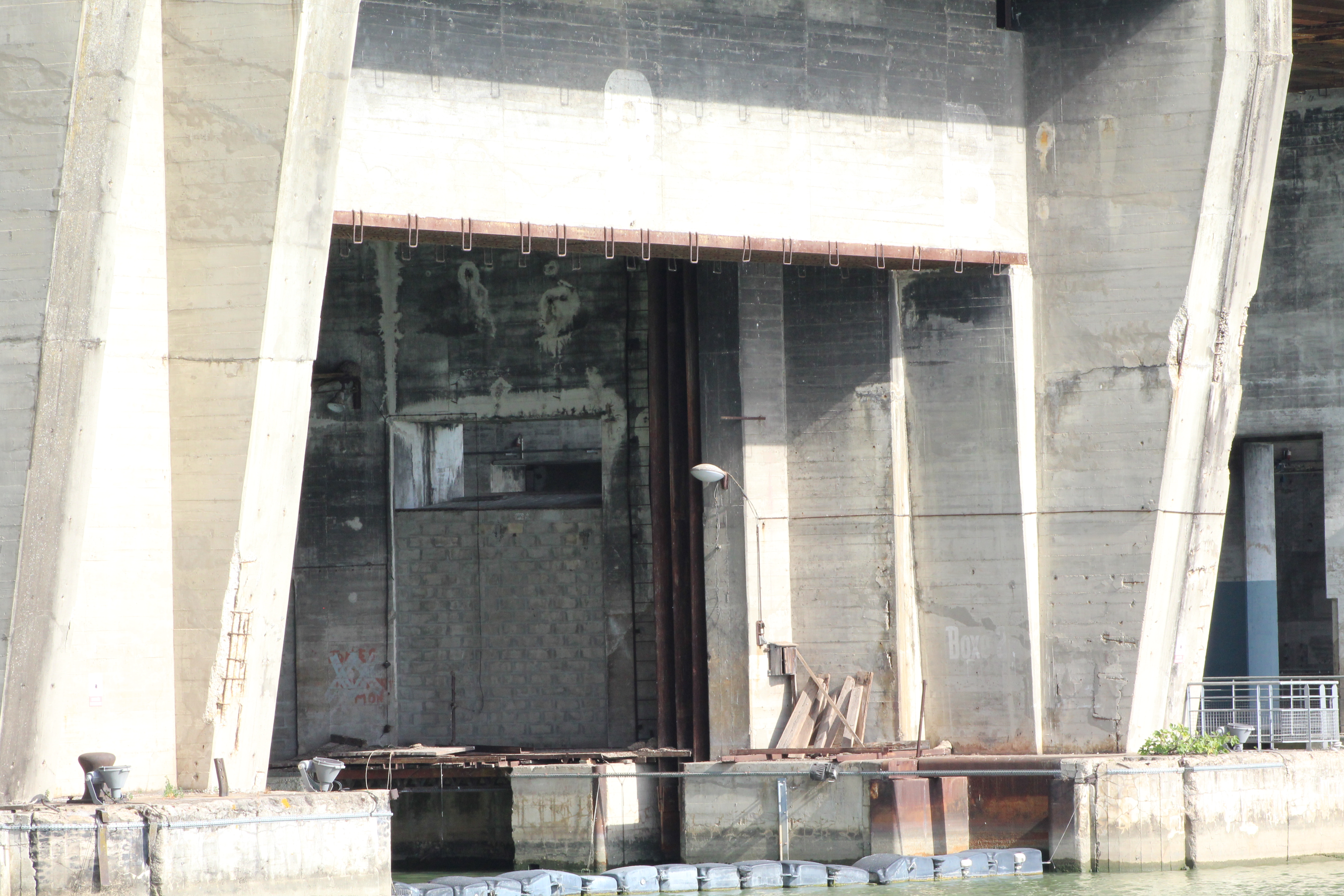 Building of the bunker began in 1941 and was designed for both refit and servicing. The 11 docks were divided into 4 “wet” and 7 “dry”, with the total building being some 800′ long, 530′ deep and 60′ high. The roof is steel reinforced concrete 30′ thick in a “fangrost” design, large half-round beams that would “trap” or deflect a bomb between them so as not to allow a direct hit on a flat roof.