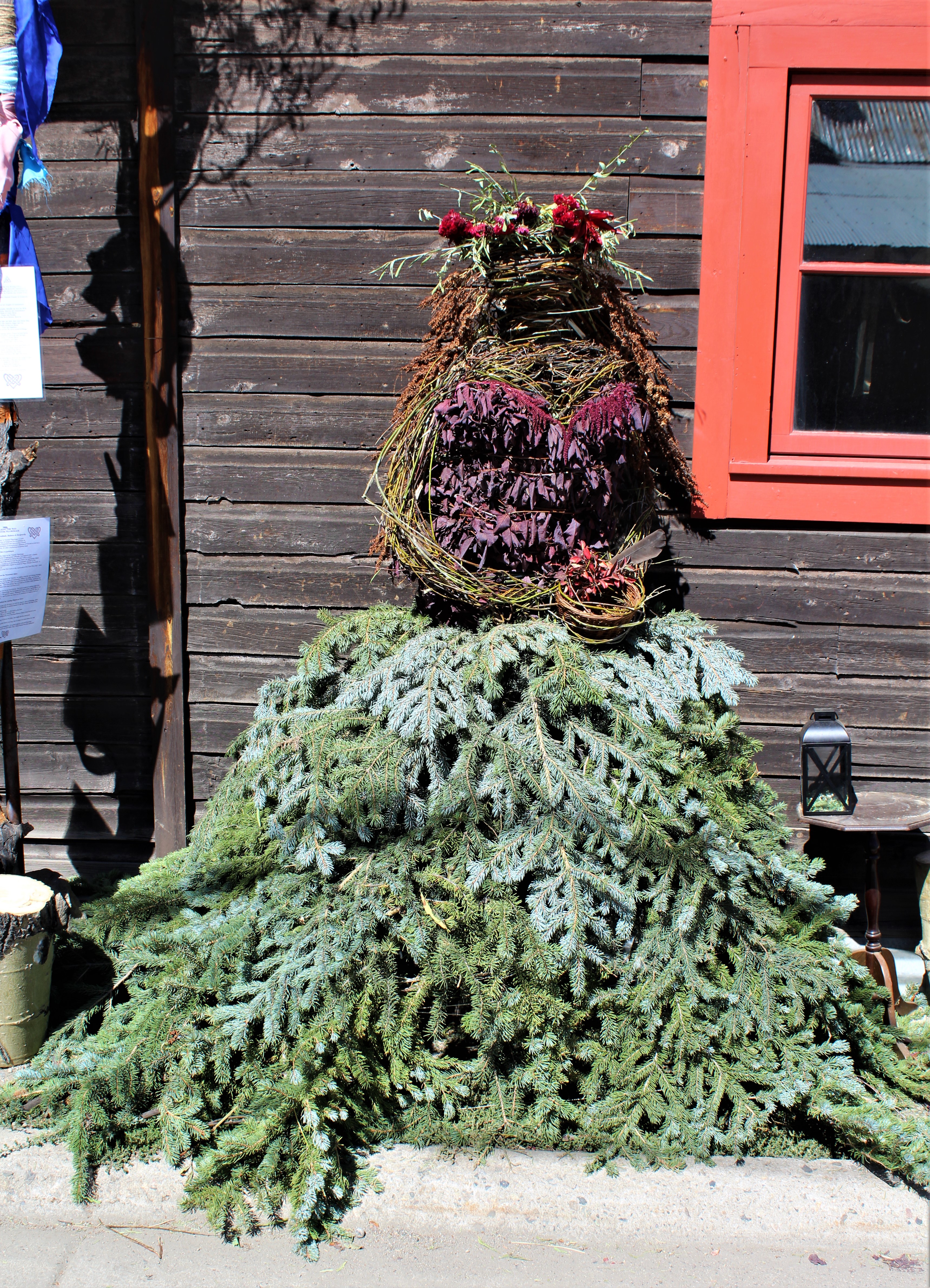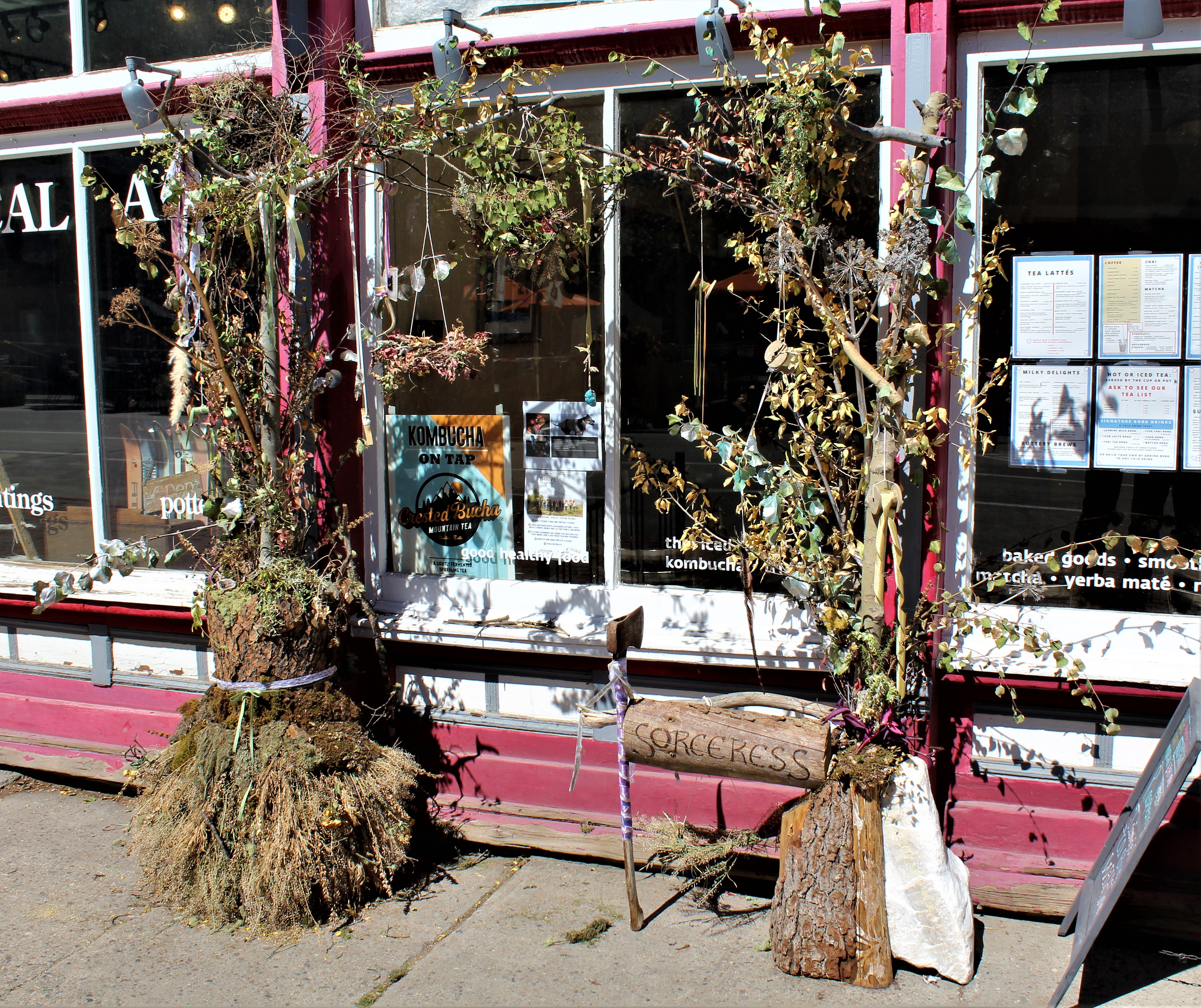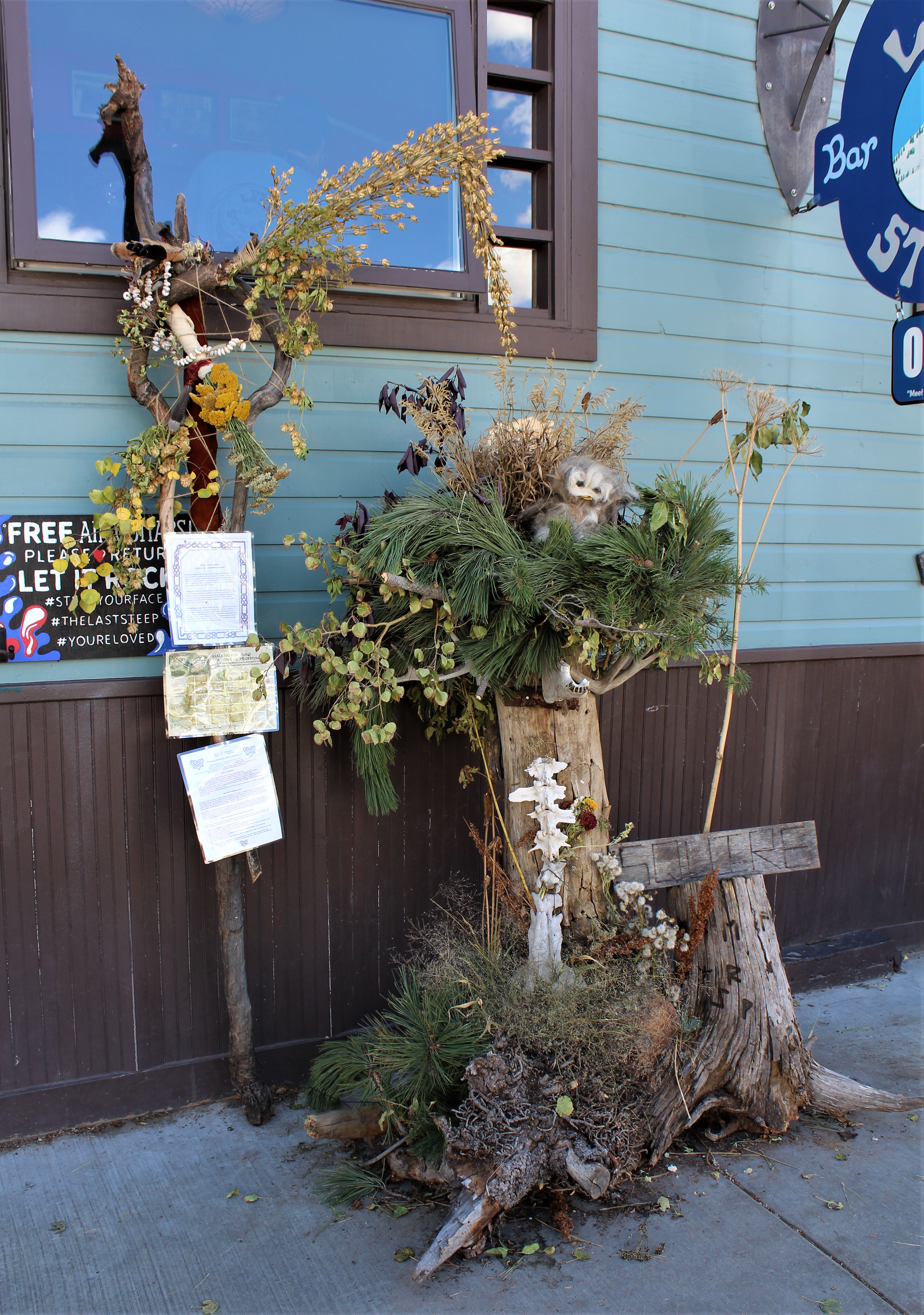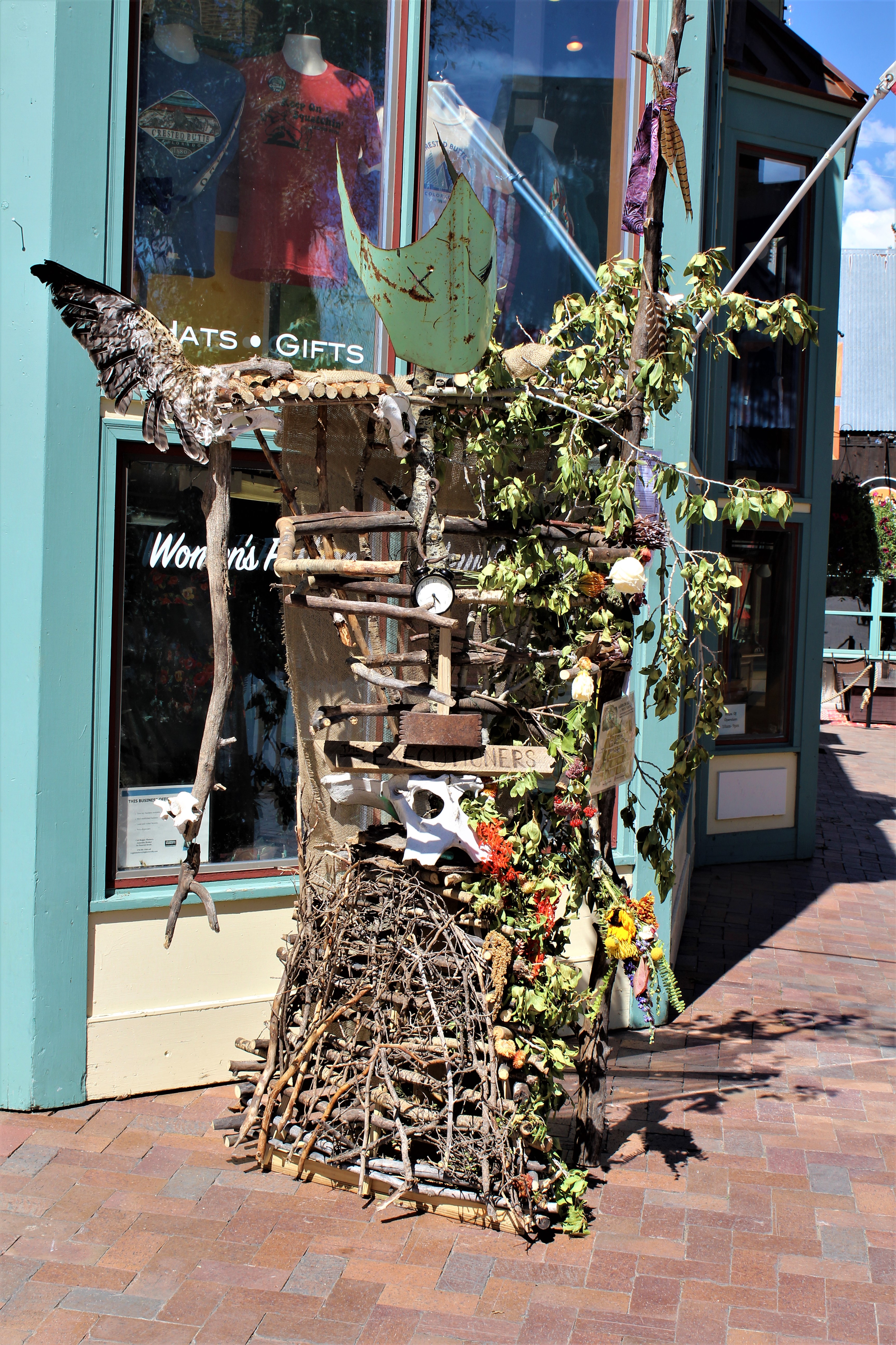 After finishing off our ‘supreme’ pizza, need to do a little walking around town and see what’s going on today. Didn’t take long before Collette noticed that several stores had a form of ‘natural’ sculpture on their storefronts. Twigs, branches, leaves, some odd pieces of metal and plastic tied into very rough shapes of people or fairy goblins. No idea what they could mean but had to check it out.