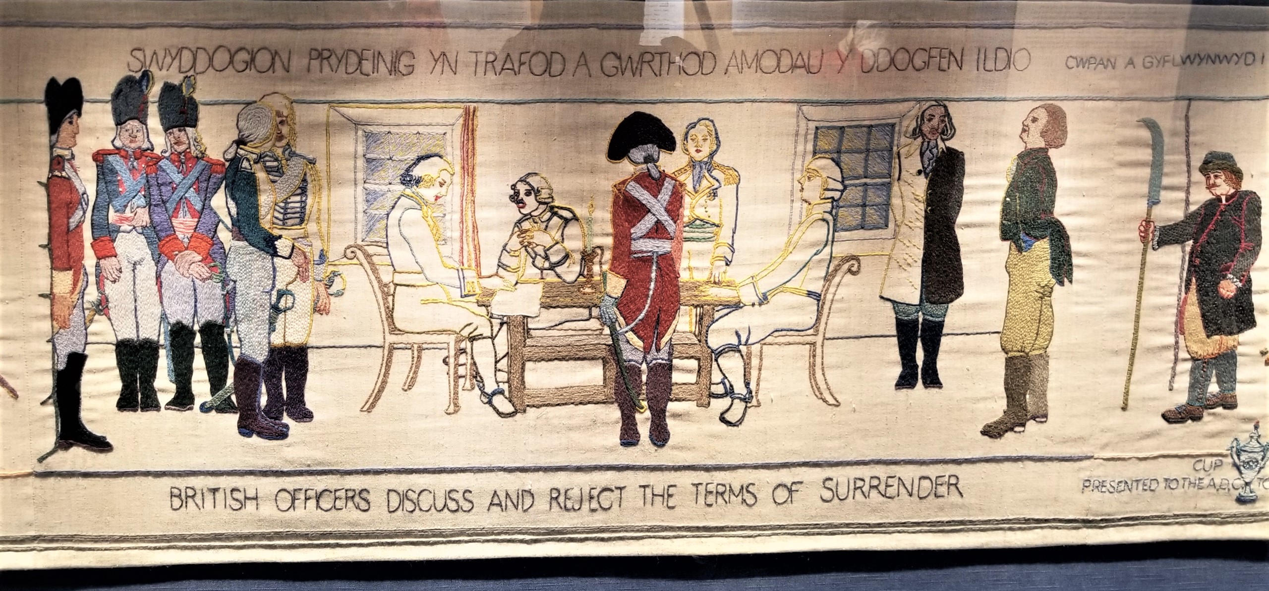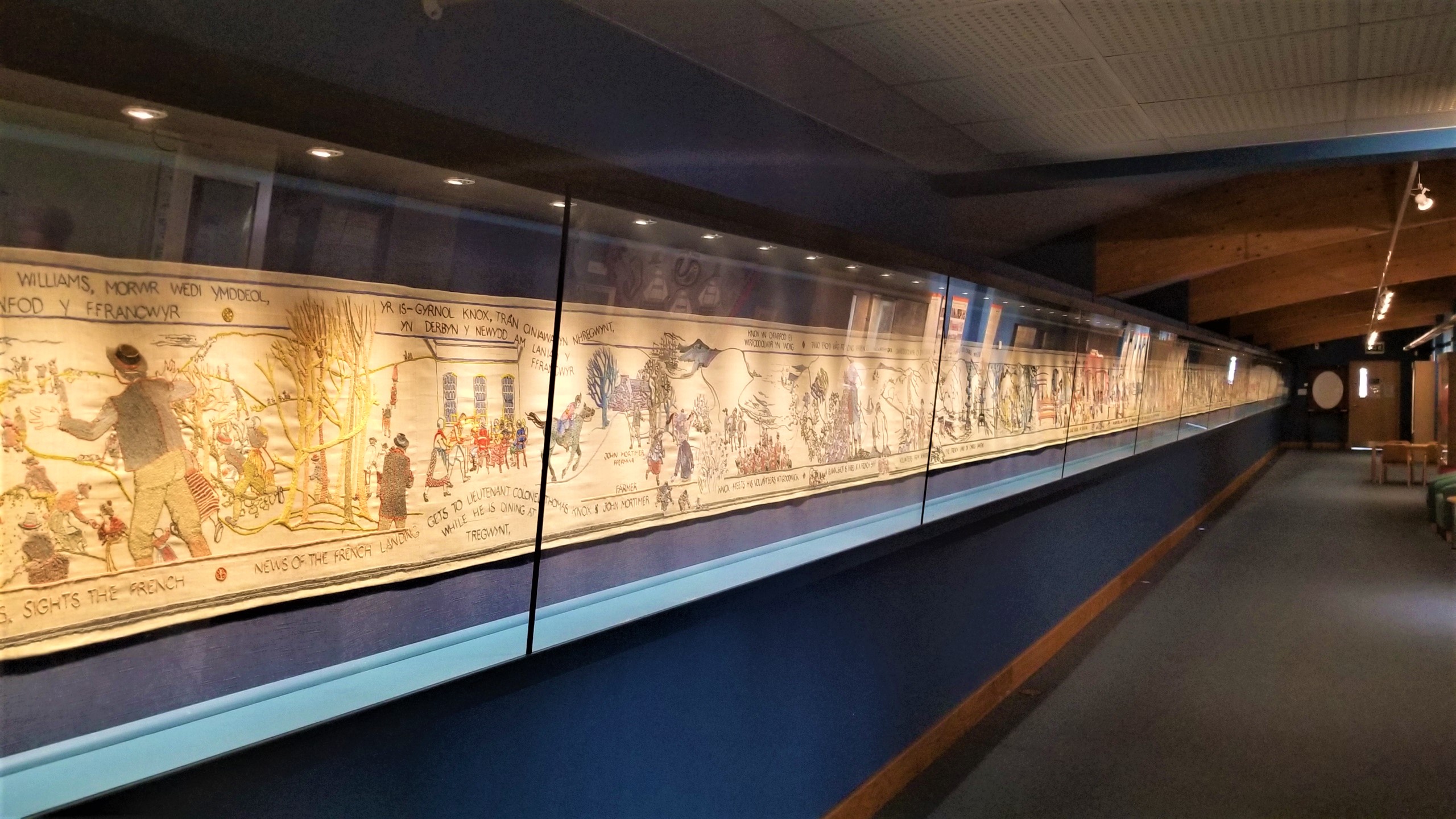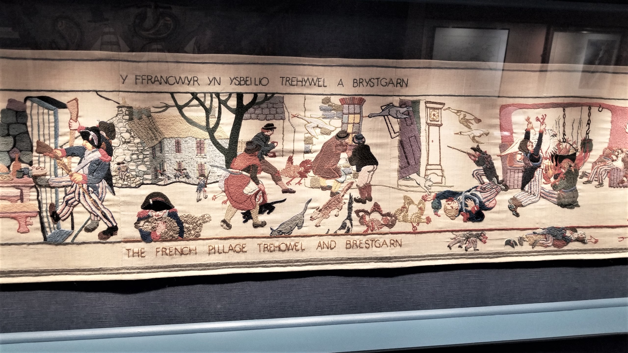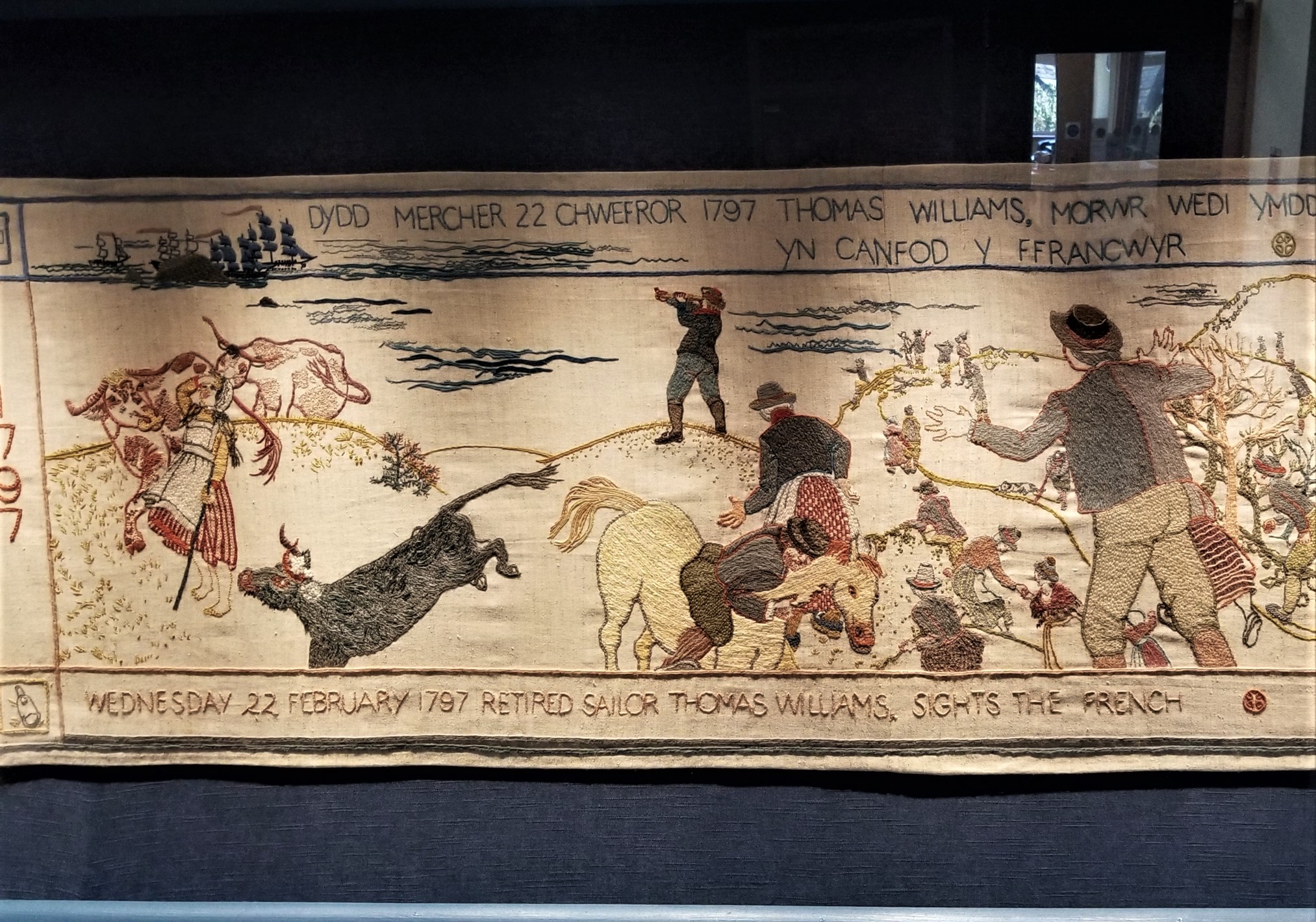 February 1797, Fishguard was the site of the last invasion of mainland Britain. About 1,400 French soldiers landed on the 22nd with plans to capture the town. Two days later, 24 February 1797, it was over, the French surrendered. In honor of the Battle for Fishguard, a tapestry was created emulating the one in Bayeux, France. 178 volunteers painstakingly embroidered this 100’ long and 1.7’ wide tapestry that tells the story of how the last invasion was defeated.