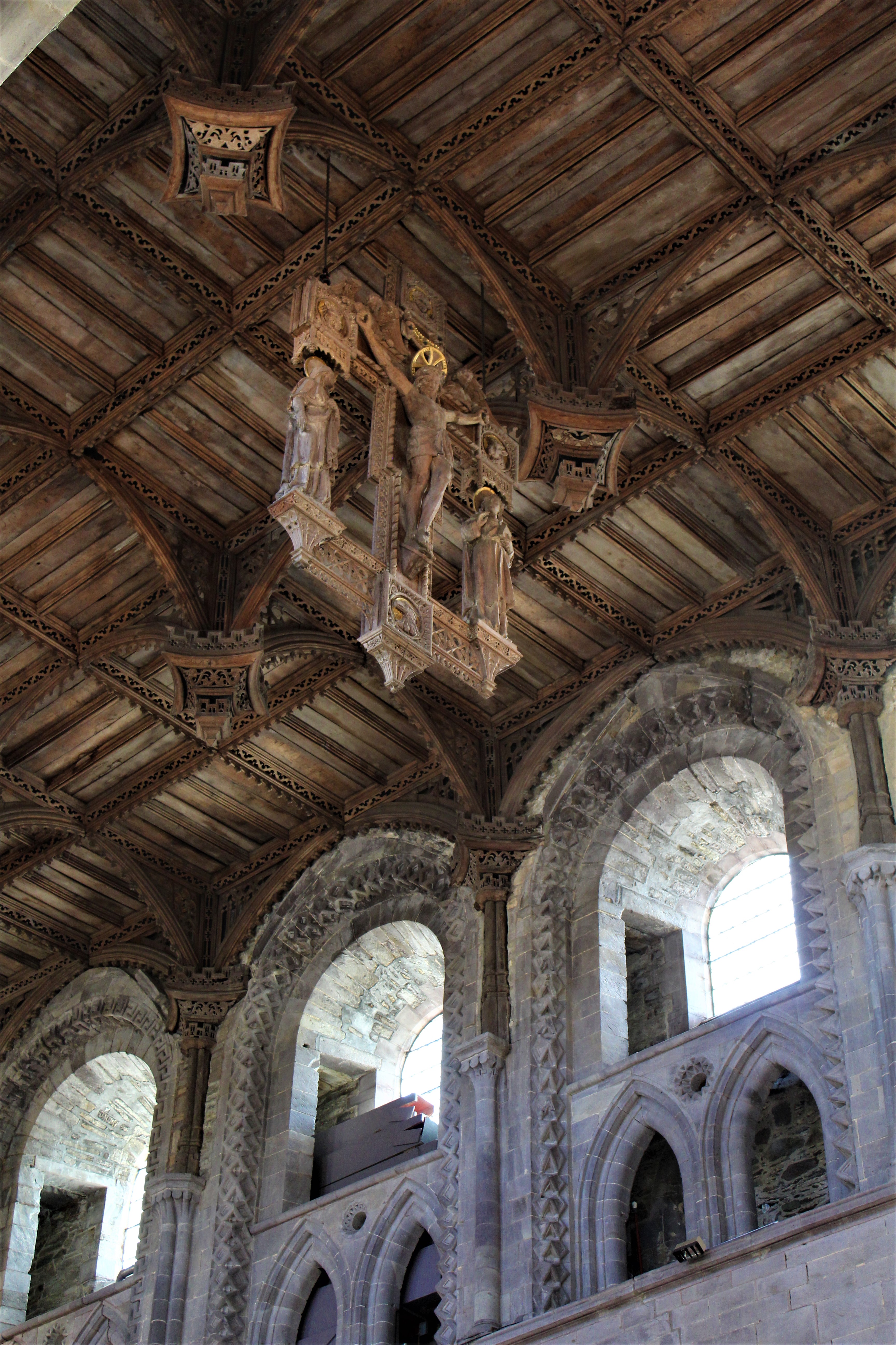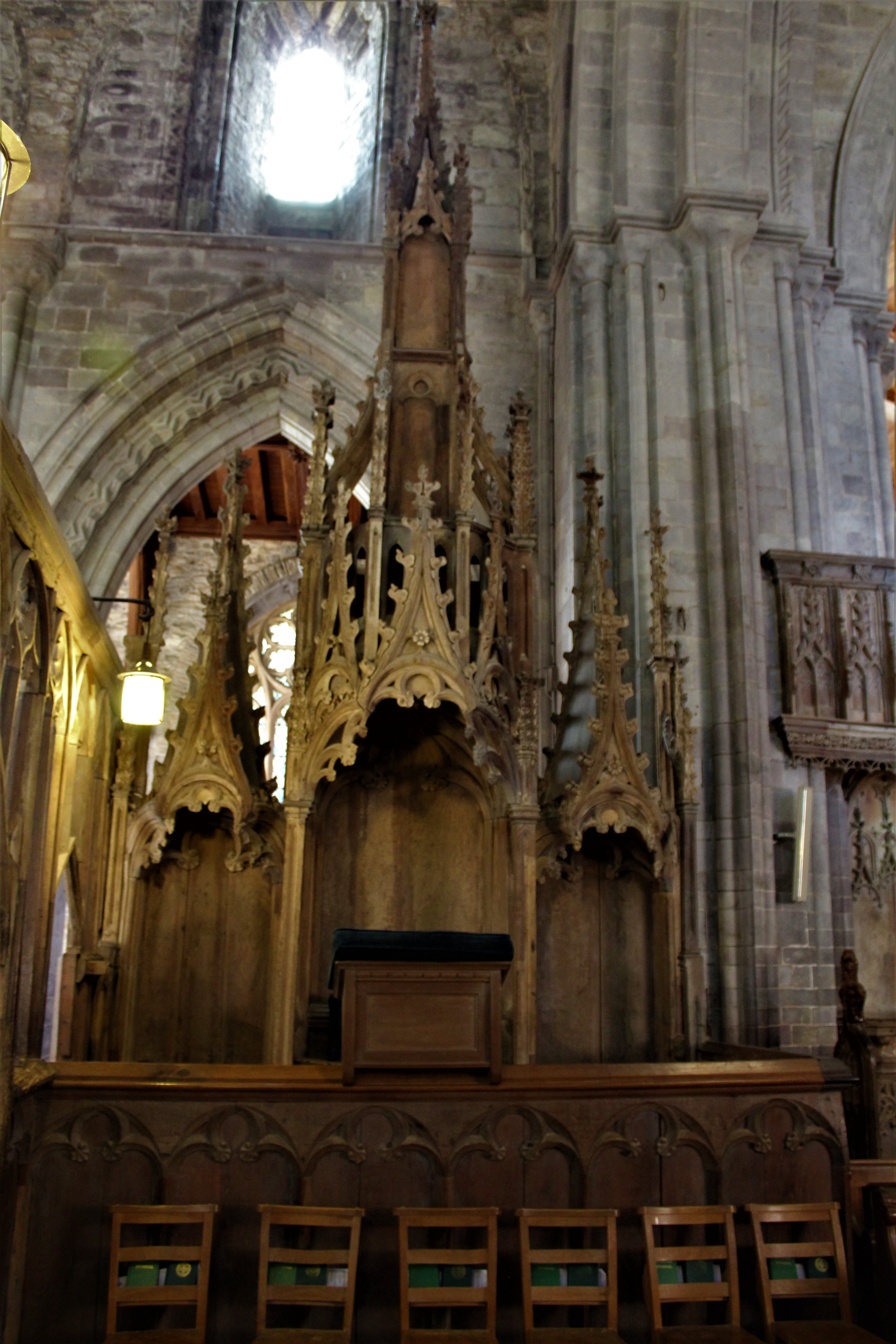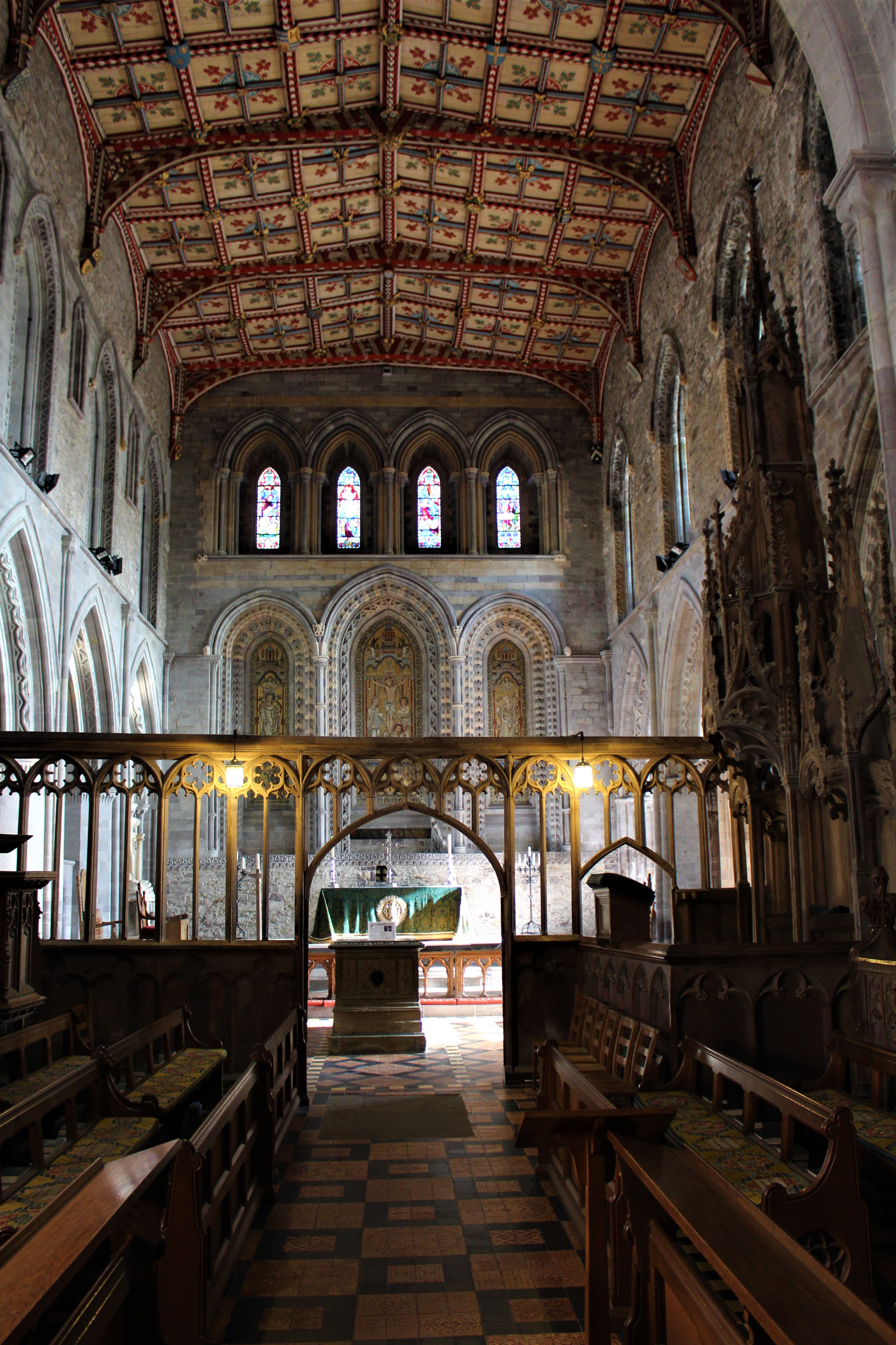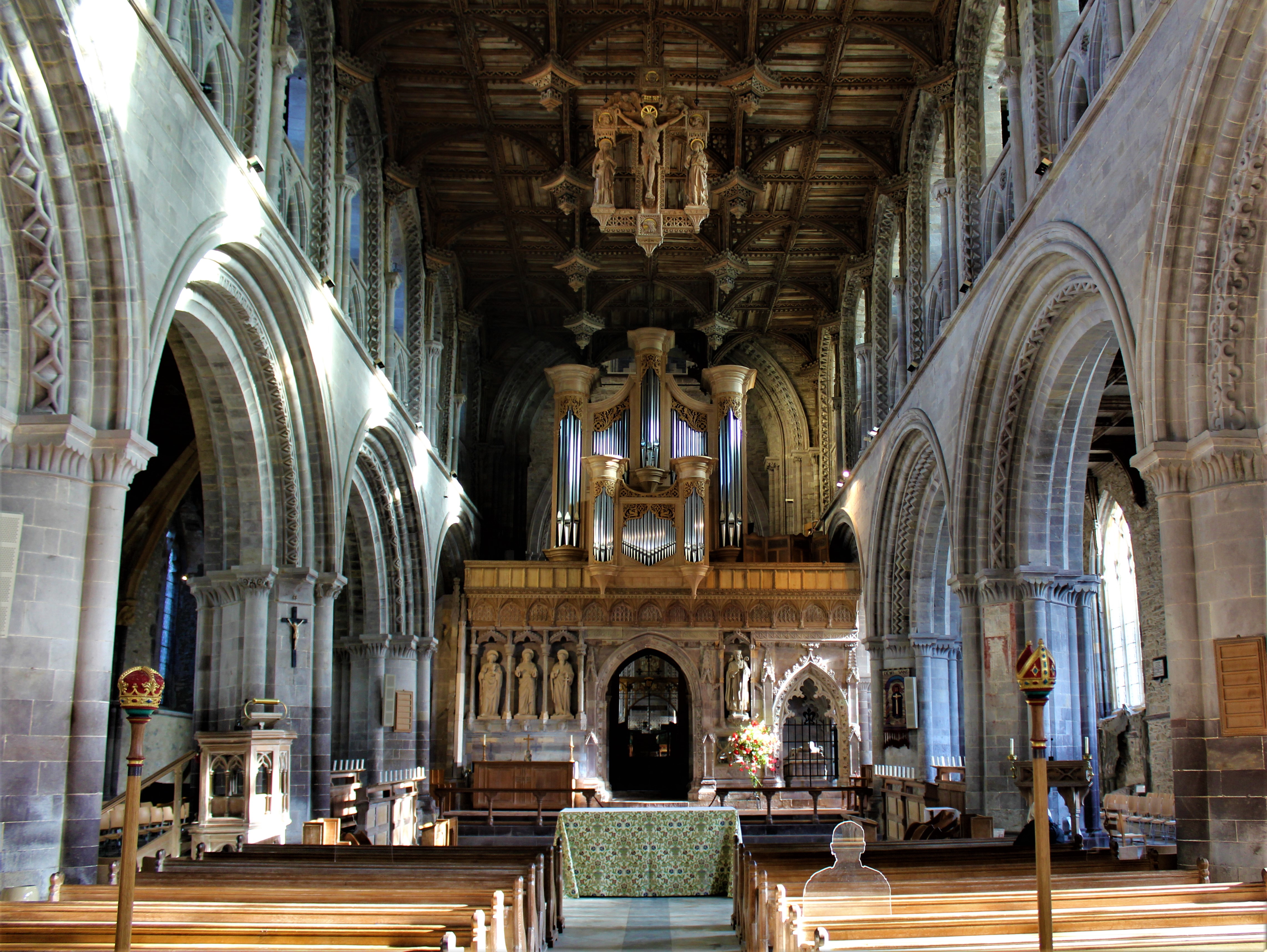 The architectural style of St. Davids is a typical cruciform with a deep chancel, a cross tower in the center, and a long nave at the entrance. The cathedral contains numerous crypts, an elaborate rood screen between the nave and chancel, and a Bishops Throne.