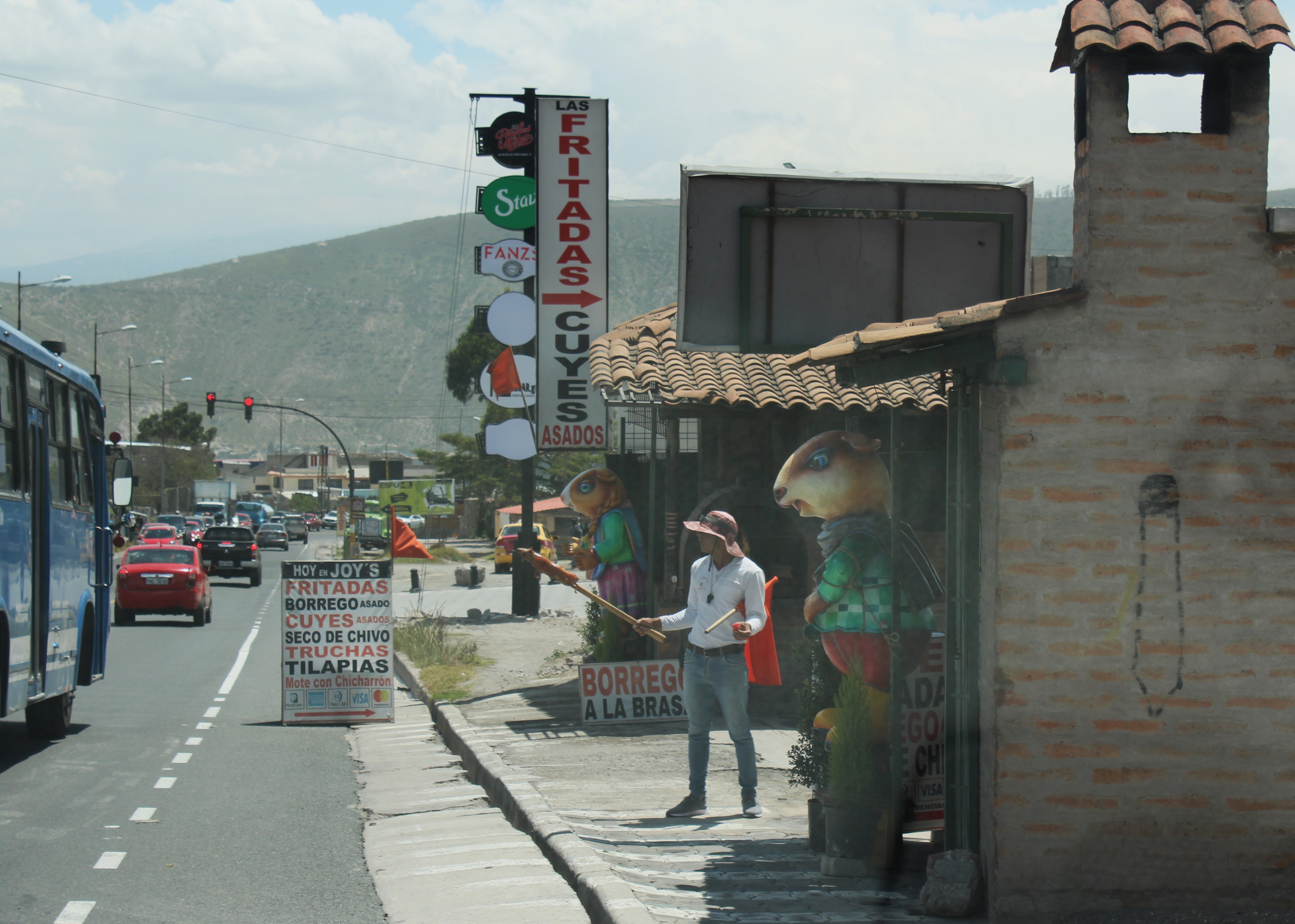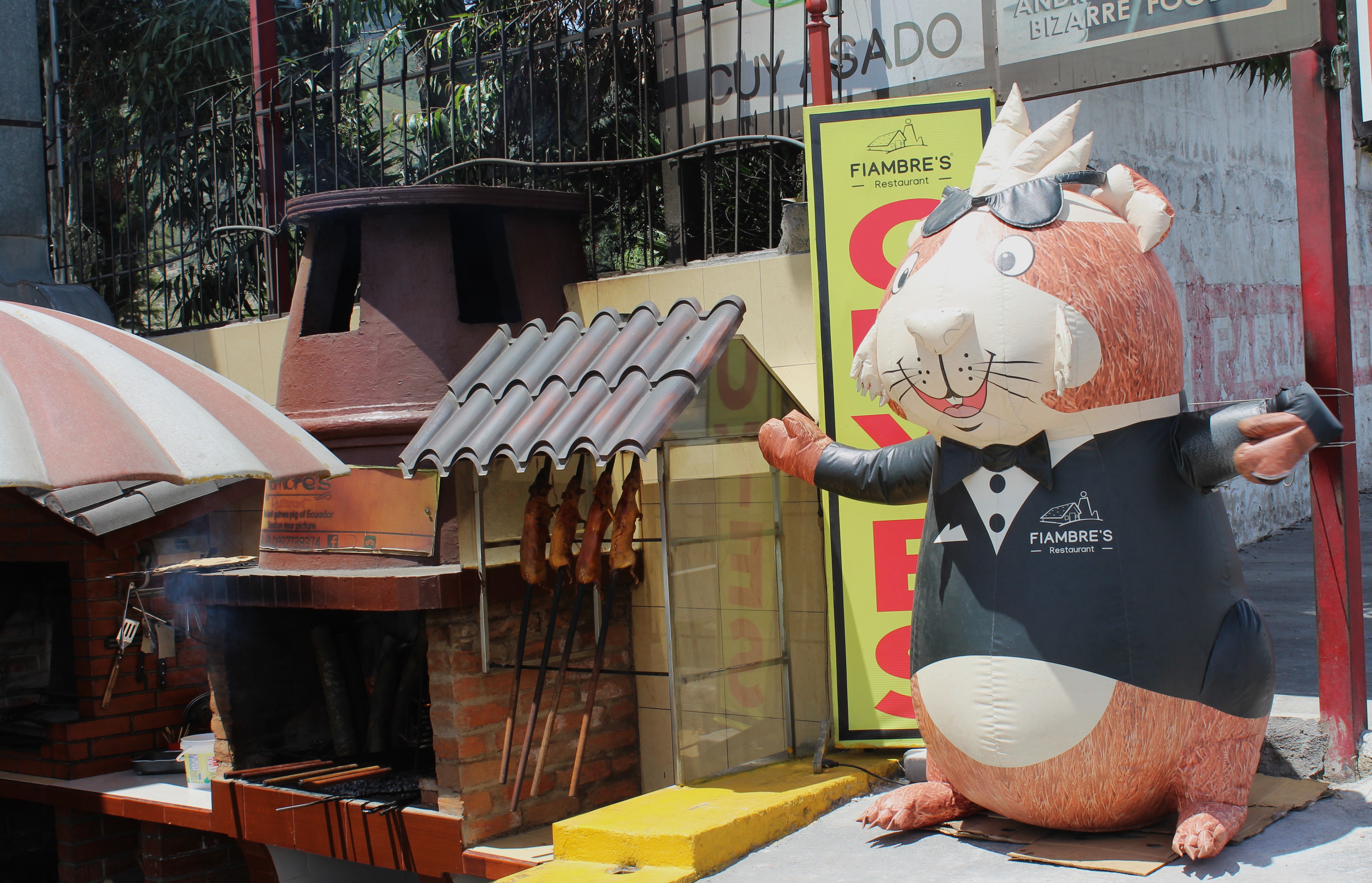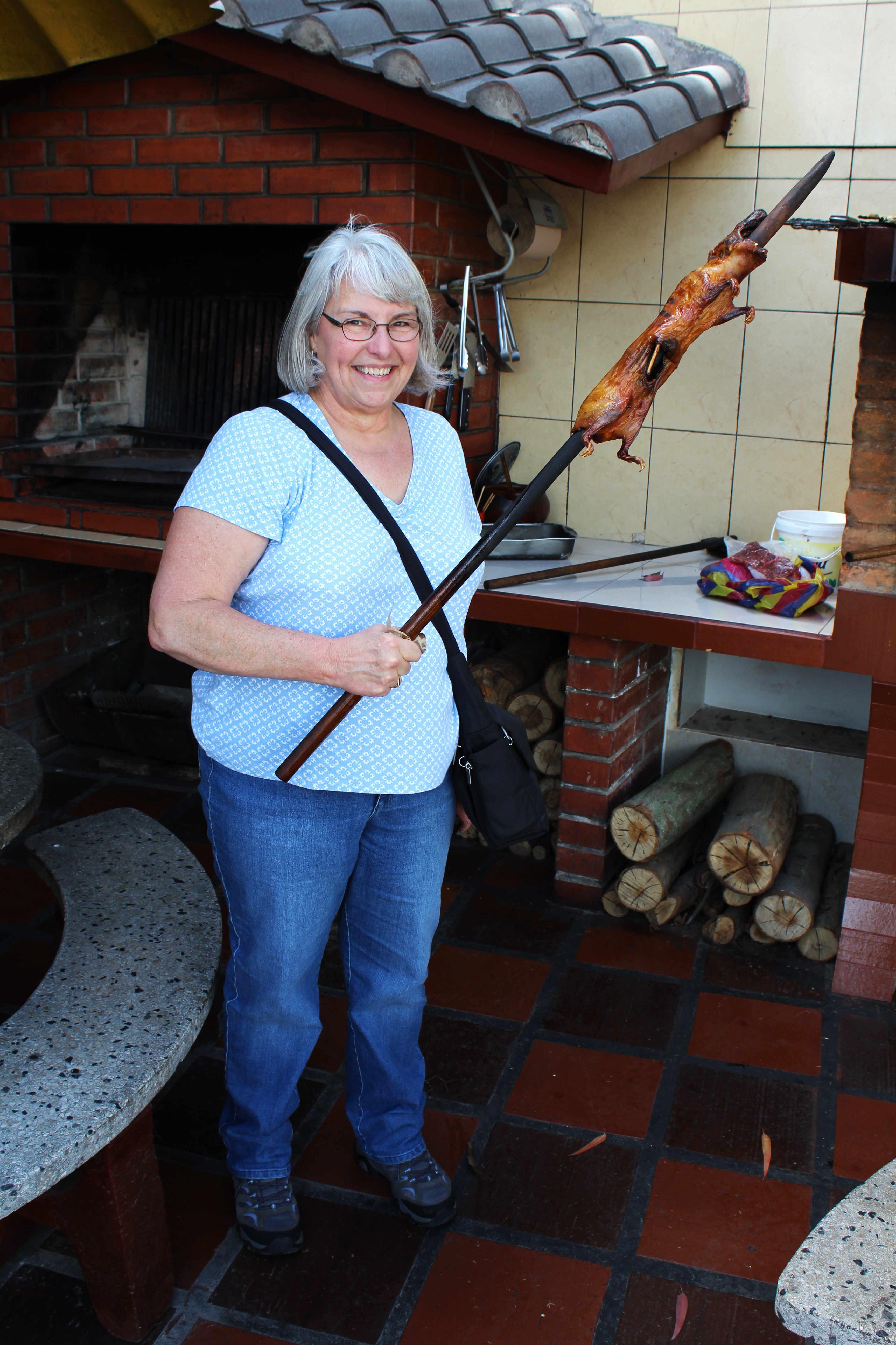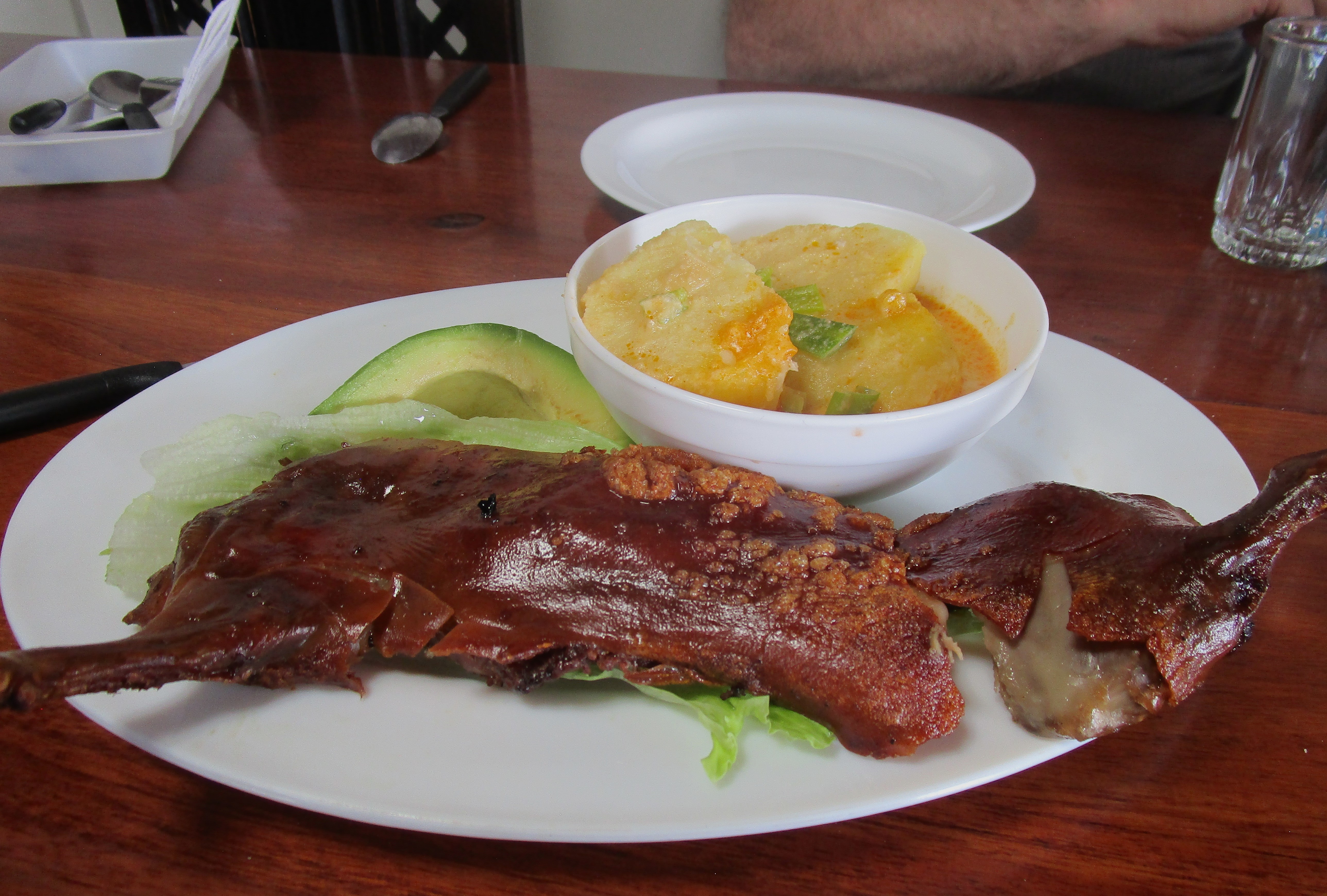 Cool as all that is, it was time for lunch and were we in for a treat. Collette and I decided on a traditional Ecuadorian lunch, potatoes, yucca, plantains, and … Guinea Pig! Yep, those cute little pets that you buy for the kids are a special lunch item here in Ecuador. There’s certainly no shortage of restaurants serving these little critters. Seems to be one every ½ mile with someone standing in the street with a flag and a menu waving the passing cars in for a bite. Just had to try it.