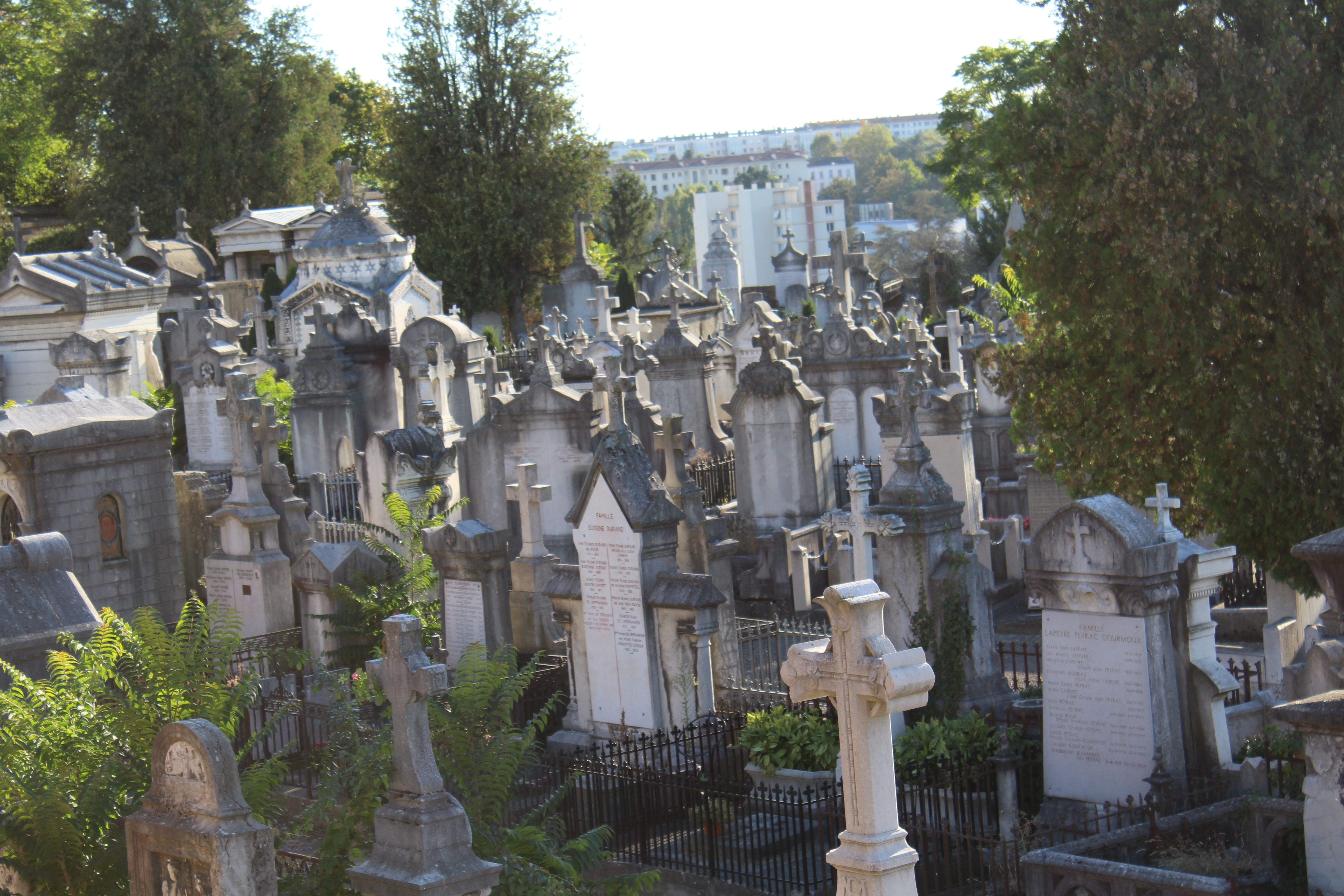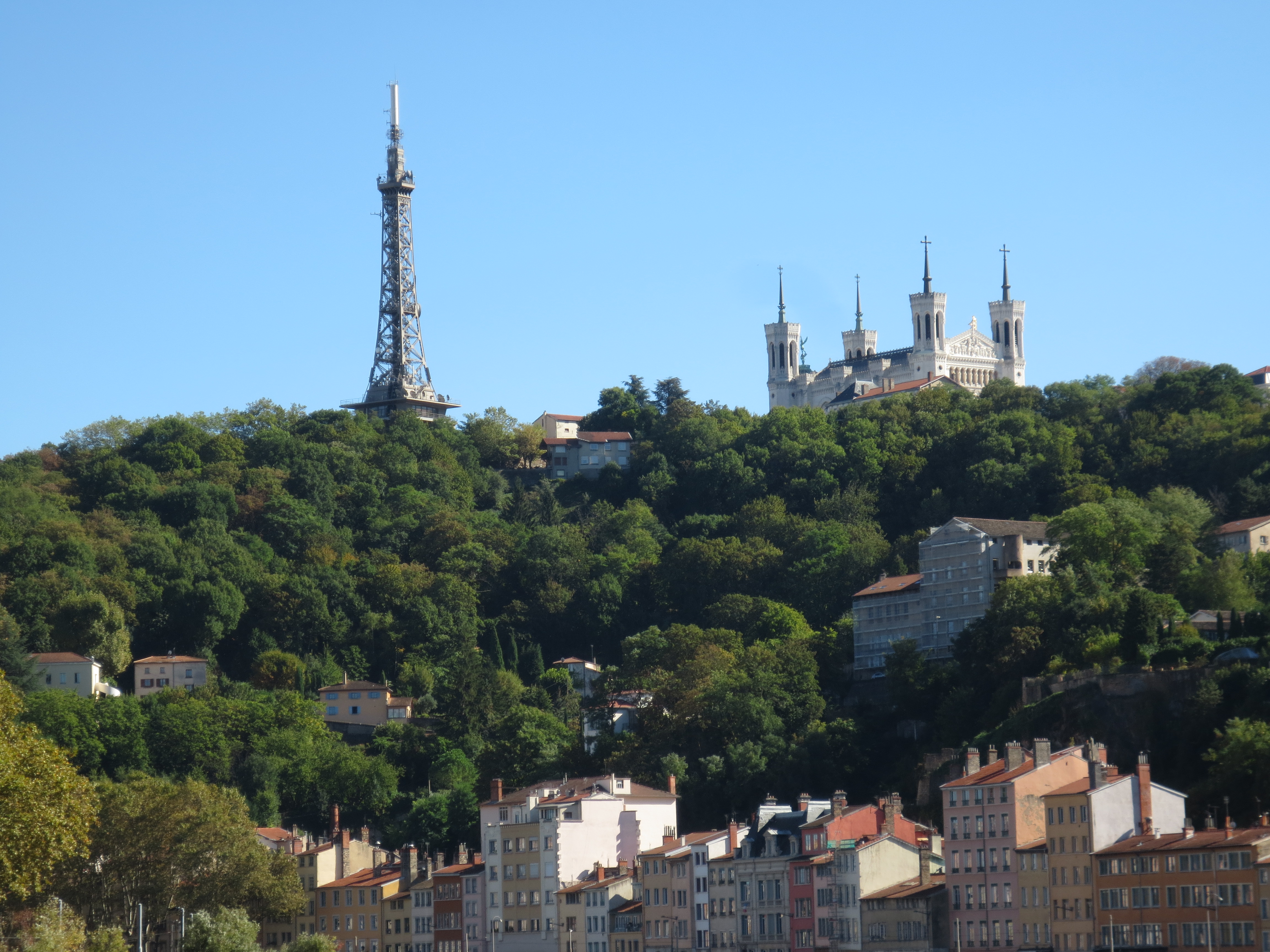 The church hosts four towers, each representing a virtue of man. One is strength, one is justice and the other two weren’t finished so we’ll stop at two virtues of man. Nicknamed “the upside-down elephant” by locals, the church is rather large with the towers resembling the legs of an elephant on it’s back. The location is incredible. From this hilltop all of Lyon can be seen as well as the Alps and Mont Blanc which rises 15,800′ above sea level. Excellent views and a moment to straighten the handlebars before heading down the hill.