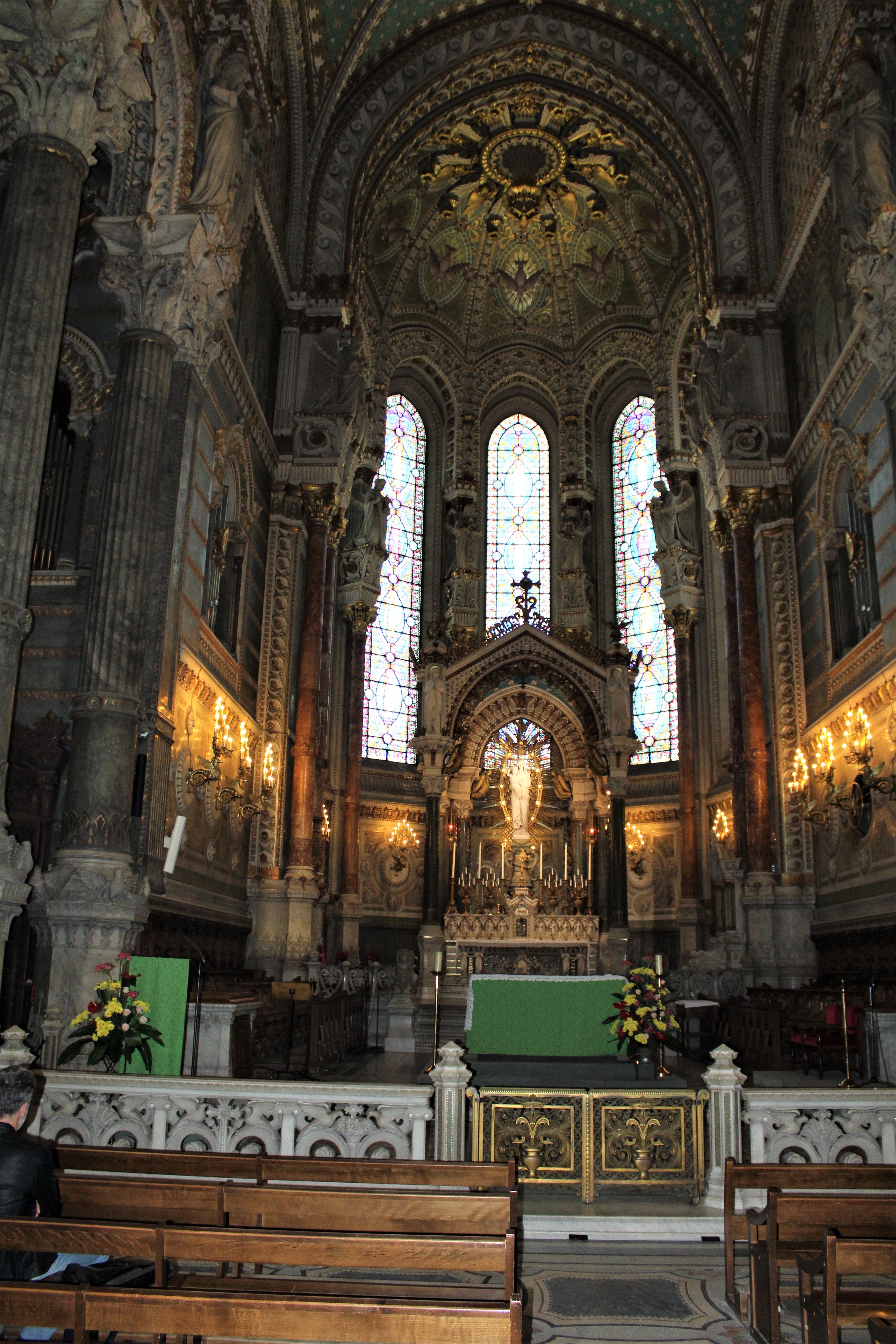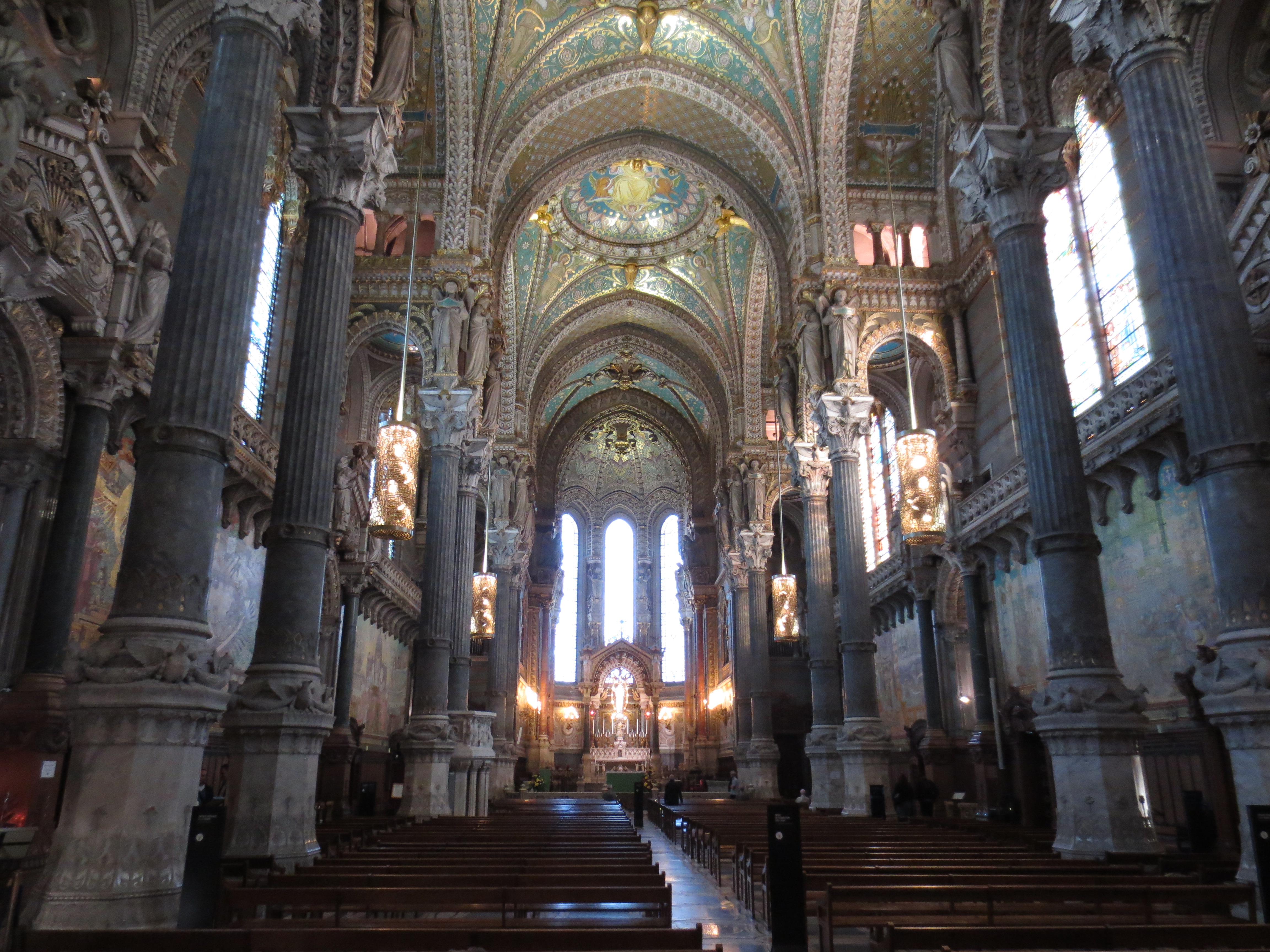 Walked off the wine and food, now to pedal to the top of the hill and see La Basilique Notre Dame de Fourviere. This church is quite a spectacle. Built from 1872 to 1884, the church now occupies the site where an ancient Roman forum stood. Built with private funds that ran out before completing the project, the church is partially finished on the outside. However, the inside is unbelievable. We thought St. John’s Co-Cathedral in Malta was a little over the top, it is nothing compared to La Basilique Notre Dame de Fourviere. Carvings, engravings, glass, gold, statues, you name it, it’s here. Apparently most of the money was spent on the inside but that doesn’t mean the outside is less elaborate.