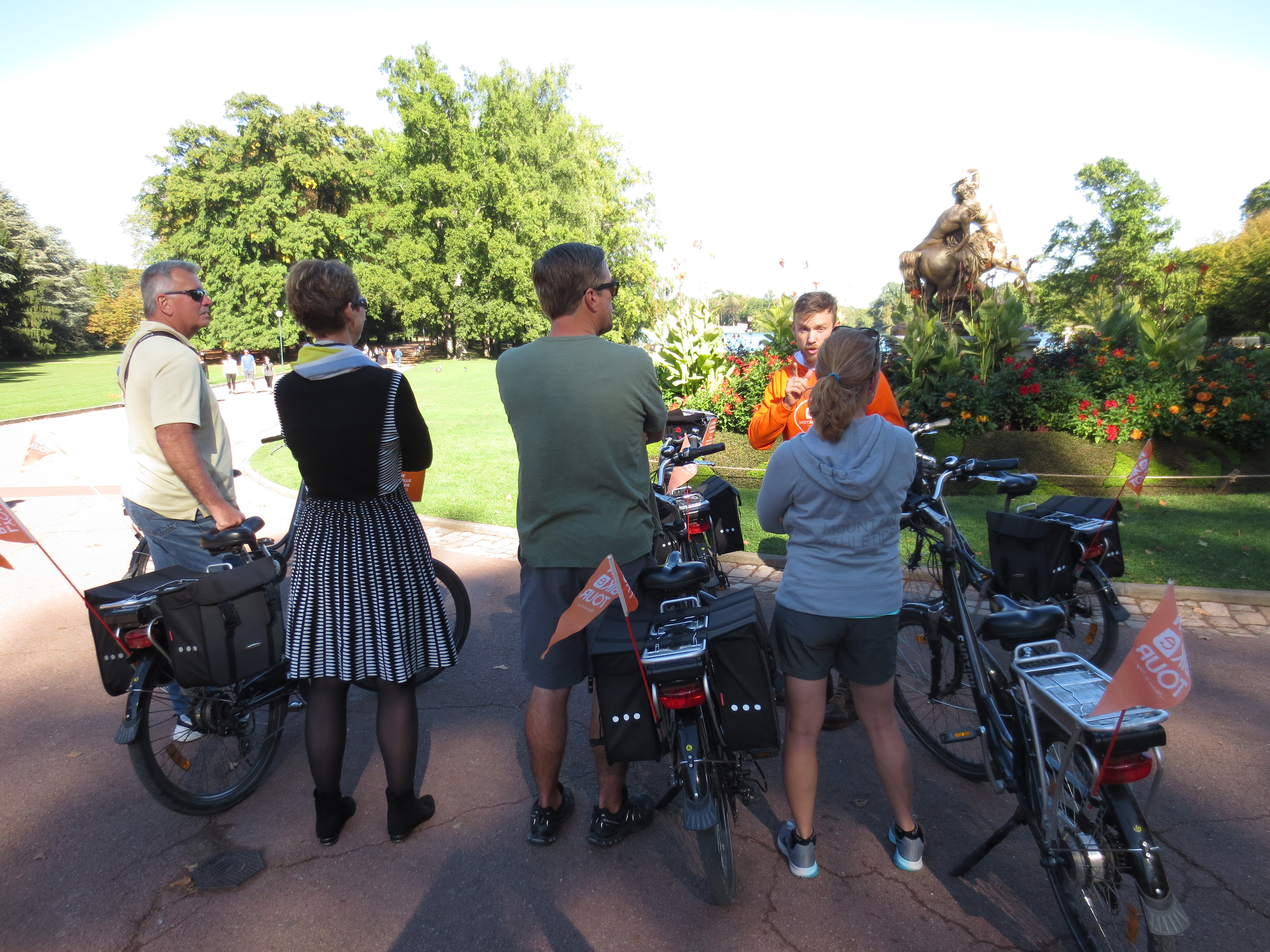 So off we go. Our tour covers a great deal of the city center and La Basilique Notre Dame de Fourviere. Known as the, “praying hill” where in the middle ages (~1192) a church was erected in honor of the Virgin Mary. Etienne was an great guide with tons of information about all the sites. We toured the river areas, both Rhone and Saone and the 2nd district located between the confluence of these rivers. Our tour also included the largest park in Lyon, Parc de la Tete d’Or, 117 hectares (or 290 acres) that includes a zoo, botanical gardens, lake and an unusual statue dedicated to the G7 Conference held in Lyon 1996. President Clinton attended while the towns women were sent to Bordeaux. The statue is rather unique in that it has 7 naked men (Bill’s idea, I’m sure) moving the Earth with a beam. The Earth only has 7 nations represented????? Well, I’m sure it means something to someone.