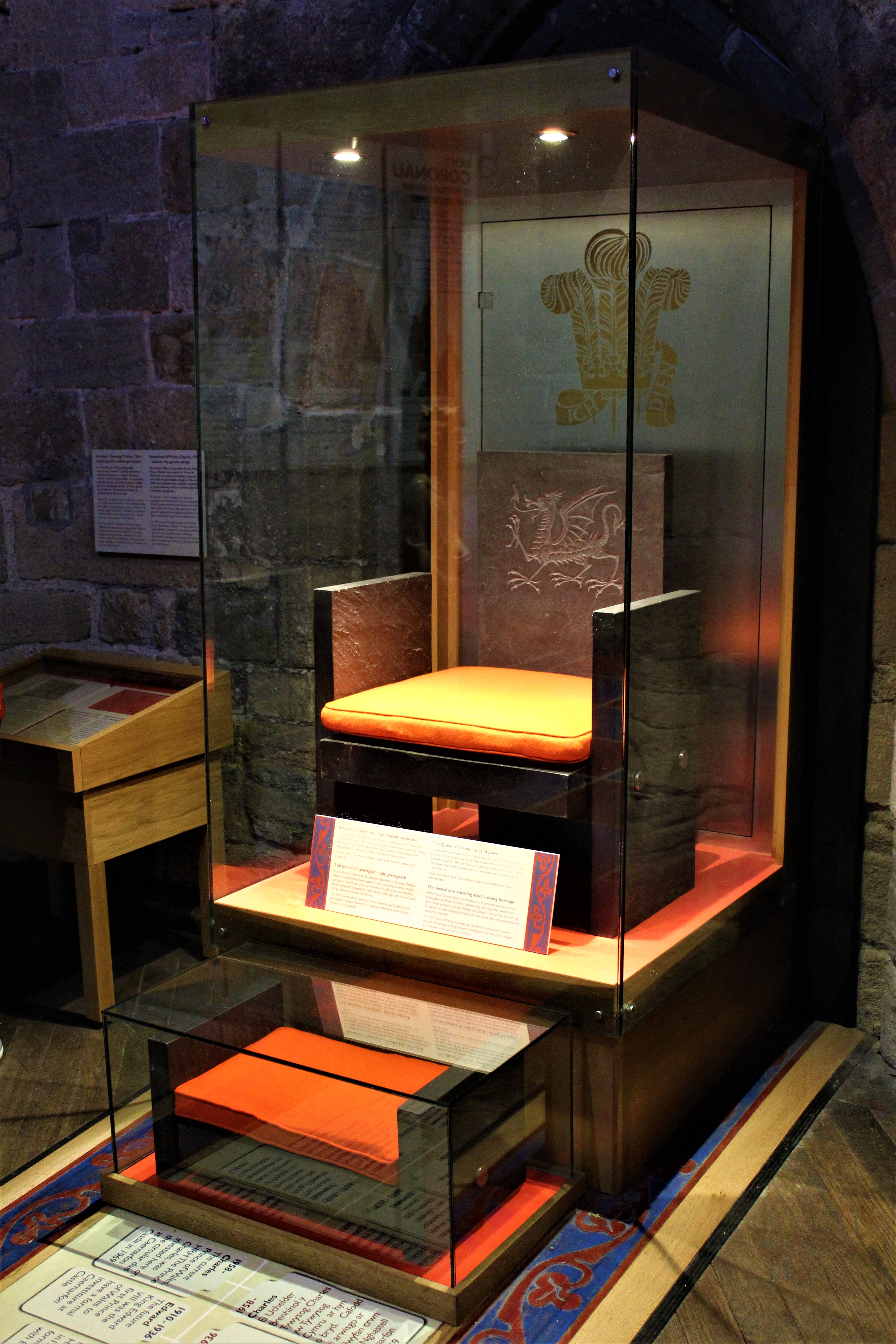 Throne used by Queen Elizabeth II during investiture of Prince Charles. Kneeling platform used by Chuck in front.