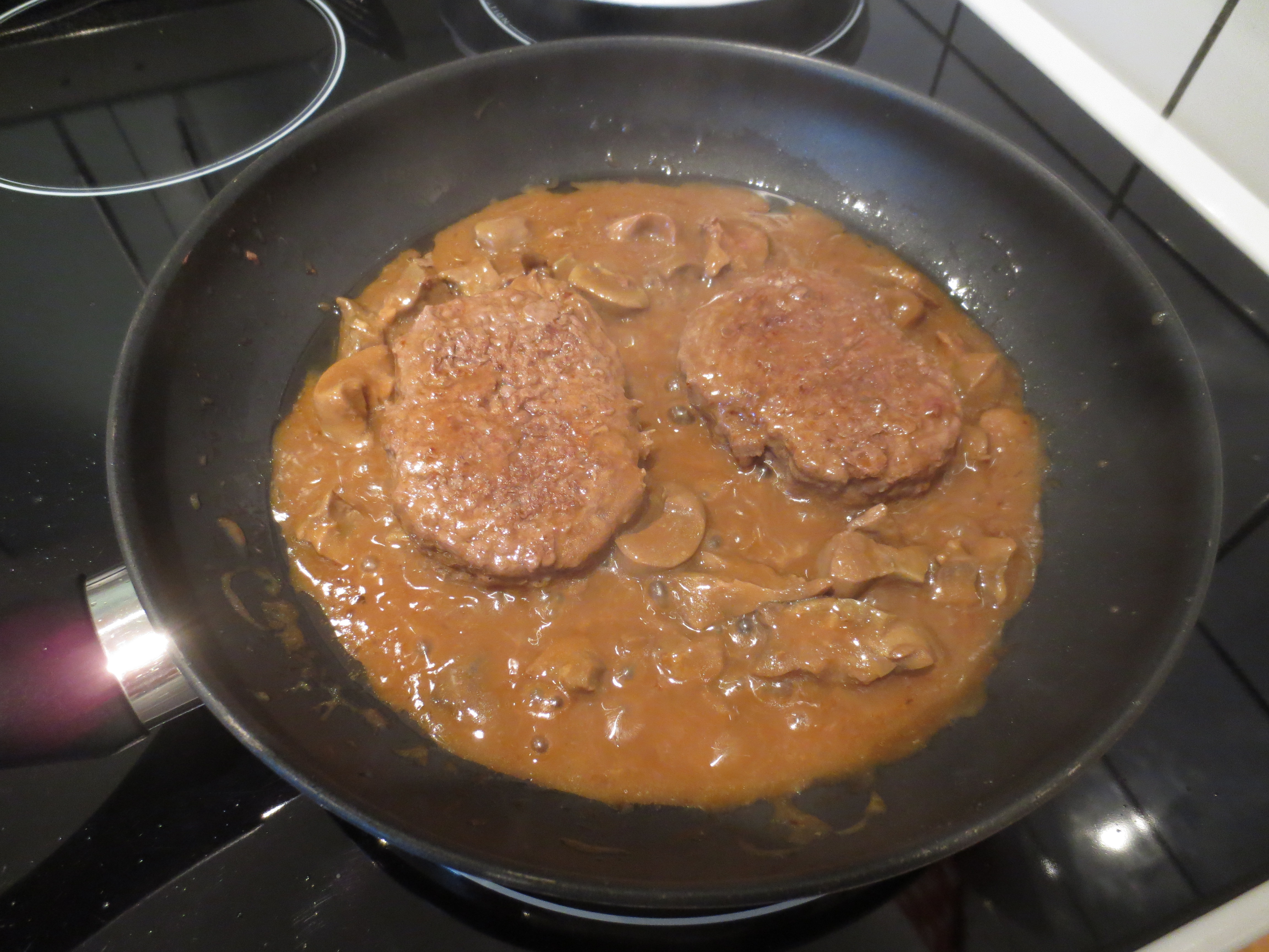 Hamburger patties with kidneys / mushroom sauce. (We thought it was only mushroom sauce!)
