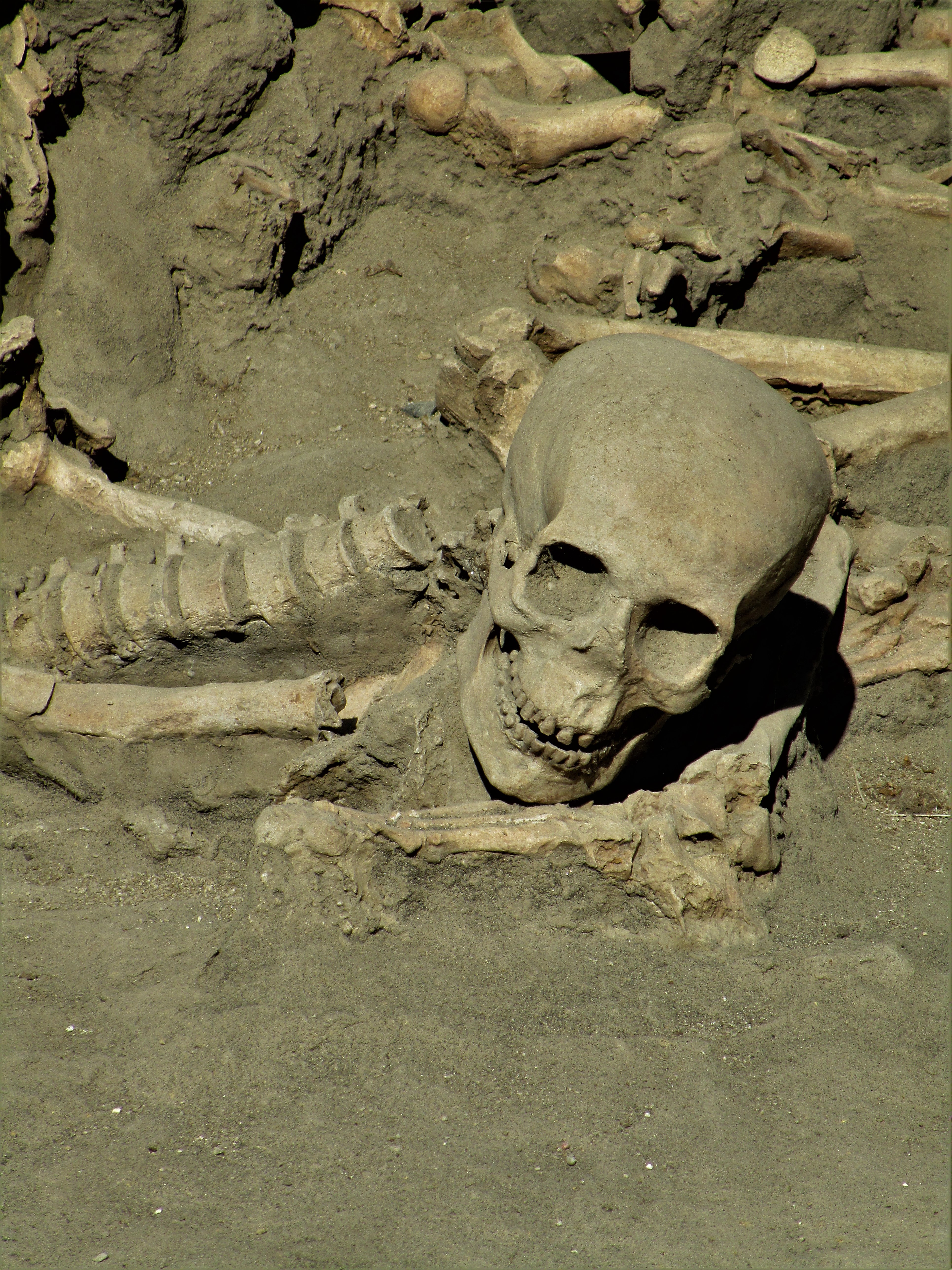 As I said, Vesuvius erupted for almost 2 full days. At the height of the eruptions, Vesuvius was ejecting molten rock, ash and pumice into the air at a rate of 1.5 million tons per second! The eruption column rose to more than 20 miles high before collapsing into a giant pyroclastic flow that covered everything in its’ path with rock, ash and debris up to 75’ deep. Those who thought this would pass were consumed.