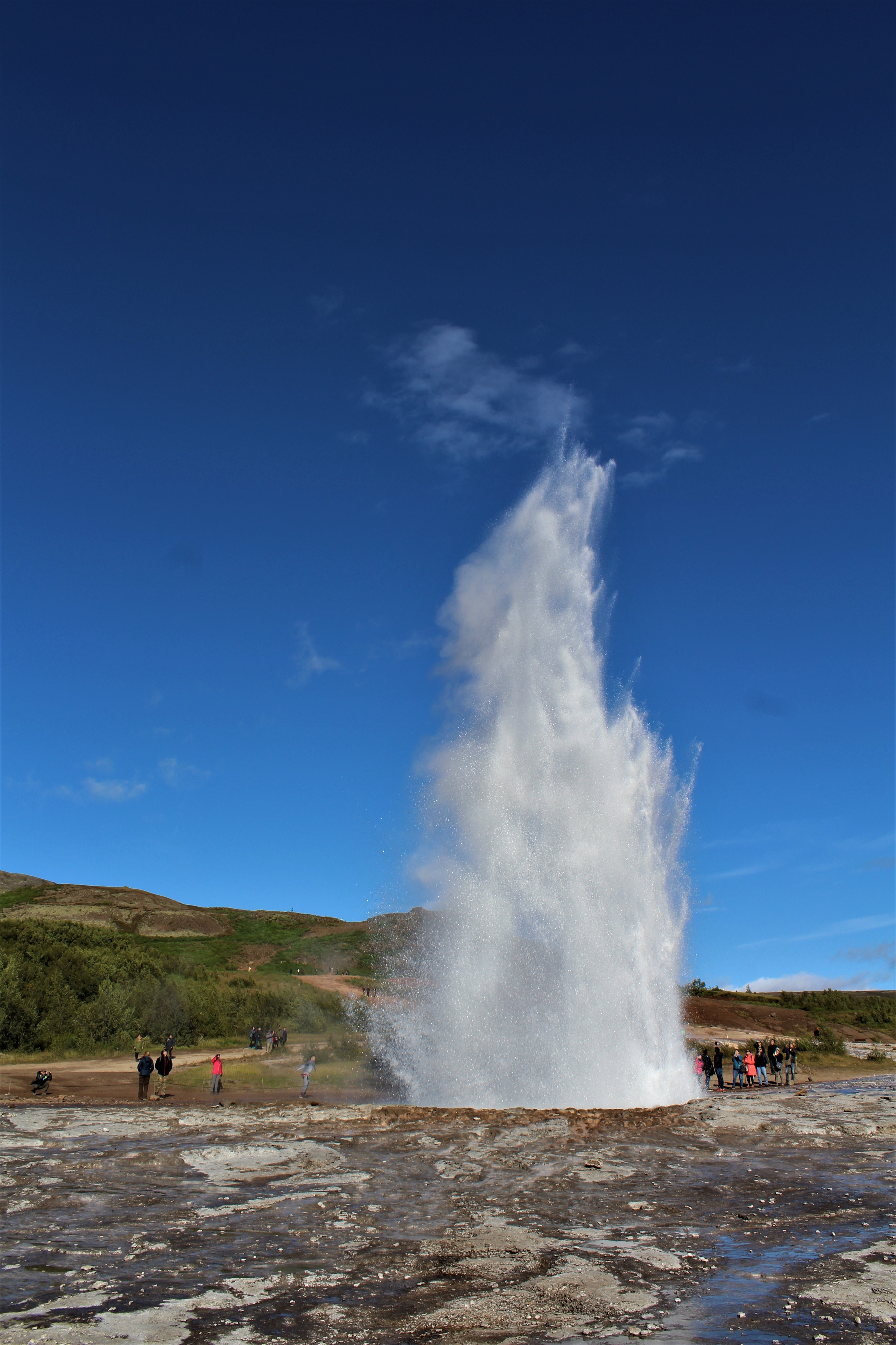 Back on the road to the town of Geysir and the hot springs. This is one of the many geothermal areas where tourists can scald themselves in boiling mud or at least come away drenched from a spouting geyser. We strolled up the path to one of the spouters walking amongst several bubbling, spewing pots of mud. Quite dangerous so I let Collette go first. (Always the gentleman) We waited for about 10 minutes and whoosh, a not so impressive blast of water came shooting out of this hole in the ground a whopping 10ft. Ugh, really? I know this isn’t Old Faithful but come on, 10ft! Must have sensed we were under-impressed cause the next eruption sent water 40ft in the air. Now we’re talkin!