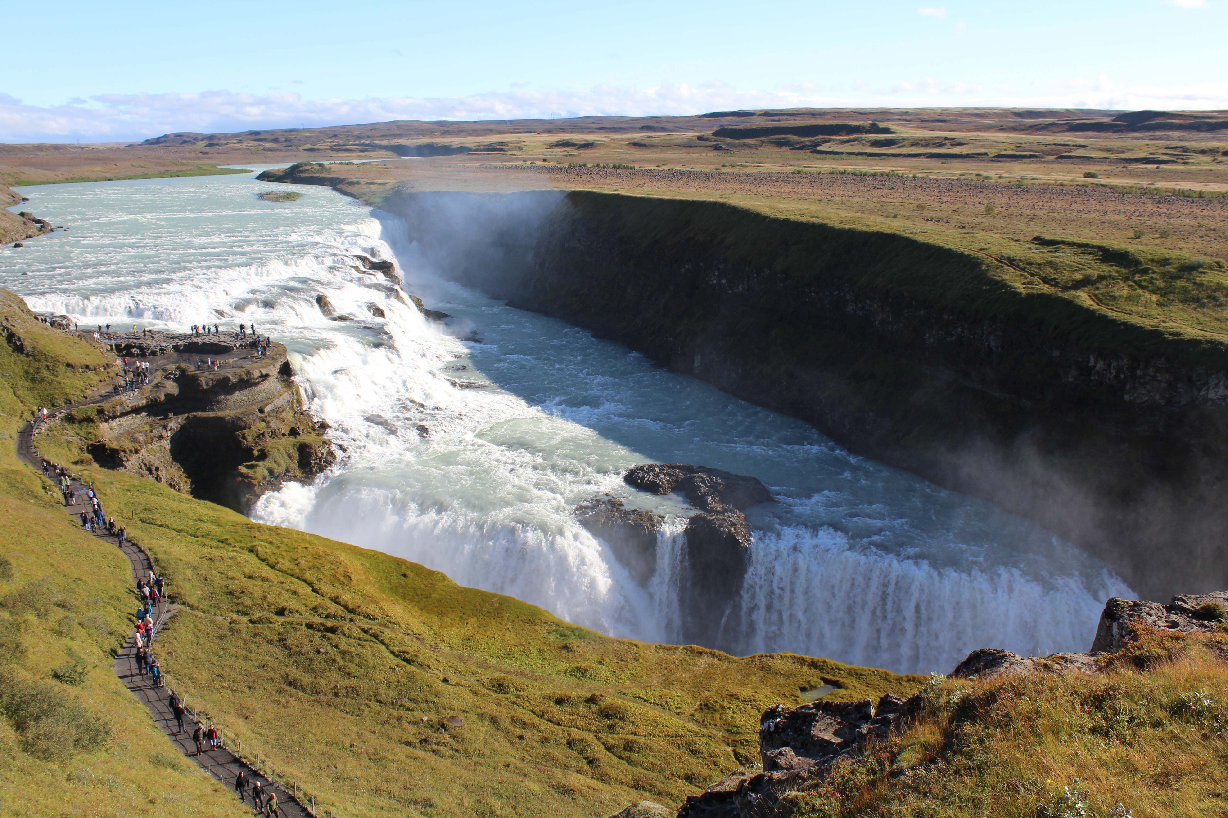 Enough thermal activity, we’re heading for the waterfalls. Unbeknownst to most, Iceland has more waterfalls than trees. We counted 28 trees on our way and over 300 waterfalls. Not really but there were a lot of waterfalls and few trees. This waterfall is one of the better known falls, Gullfoss, which means “Golden Waterfall”. (OK, clean it up. This is about Nature’s waterfall.) Water from the White river falls some 32 meters (105ft) from two levels into a chasm. Really cool but we’re not through…
