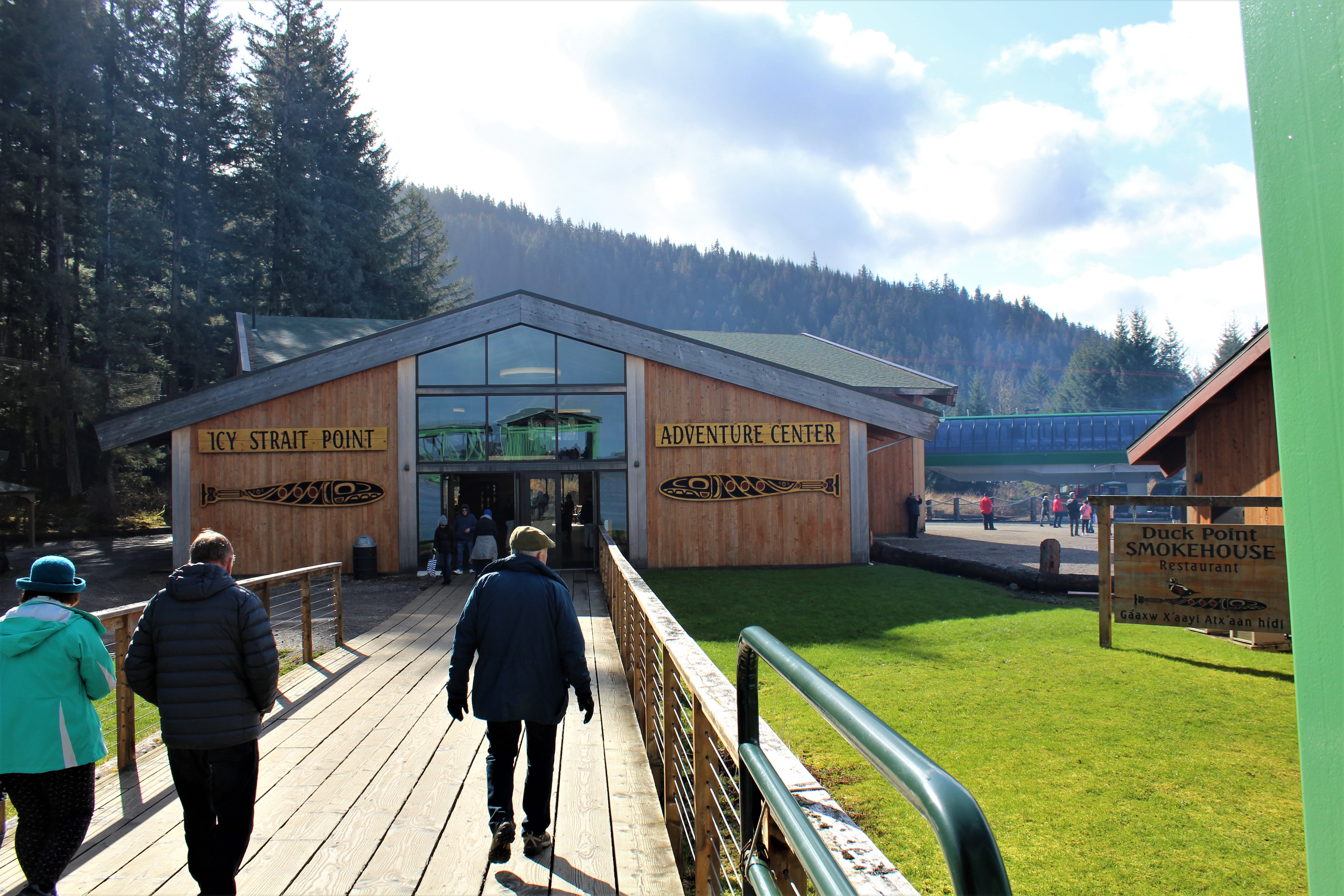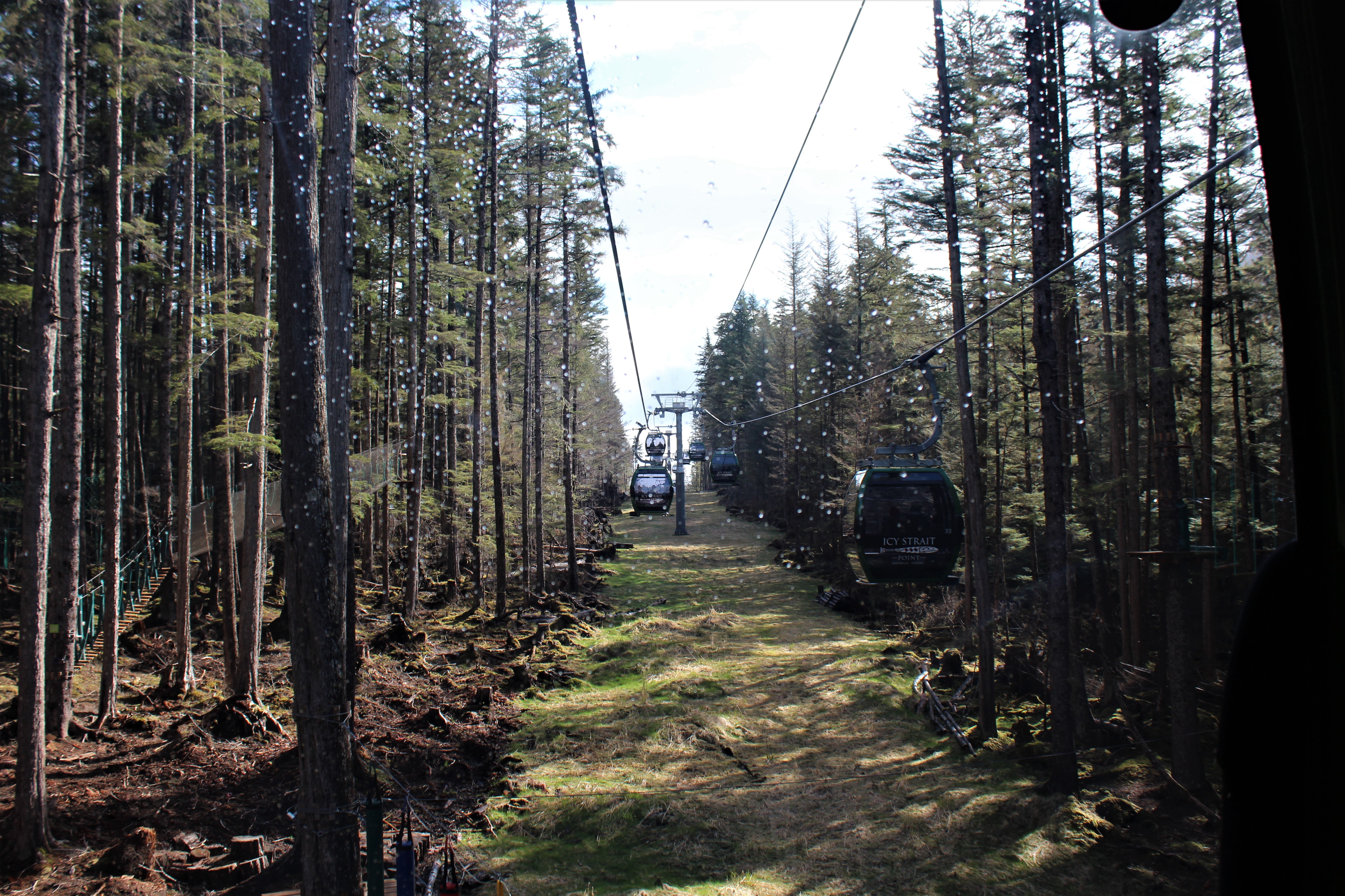 IMG_1885 (2)We arrived at the Visitor’s Center little early and decided to check the place out. Icy Straight Point at one time was a bustling fish cannery. Today, it’s a fish cannery museum.  Several buildings with canning equipment make up the museum and of course, several gift shops accompany the museums. Not sure if the cans of salmon are left over from when the cannery was operational or new but either way, we passed. We did see that there was a free, yes free, gondola up the hill so off to the wild country! And for free!