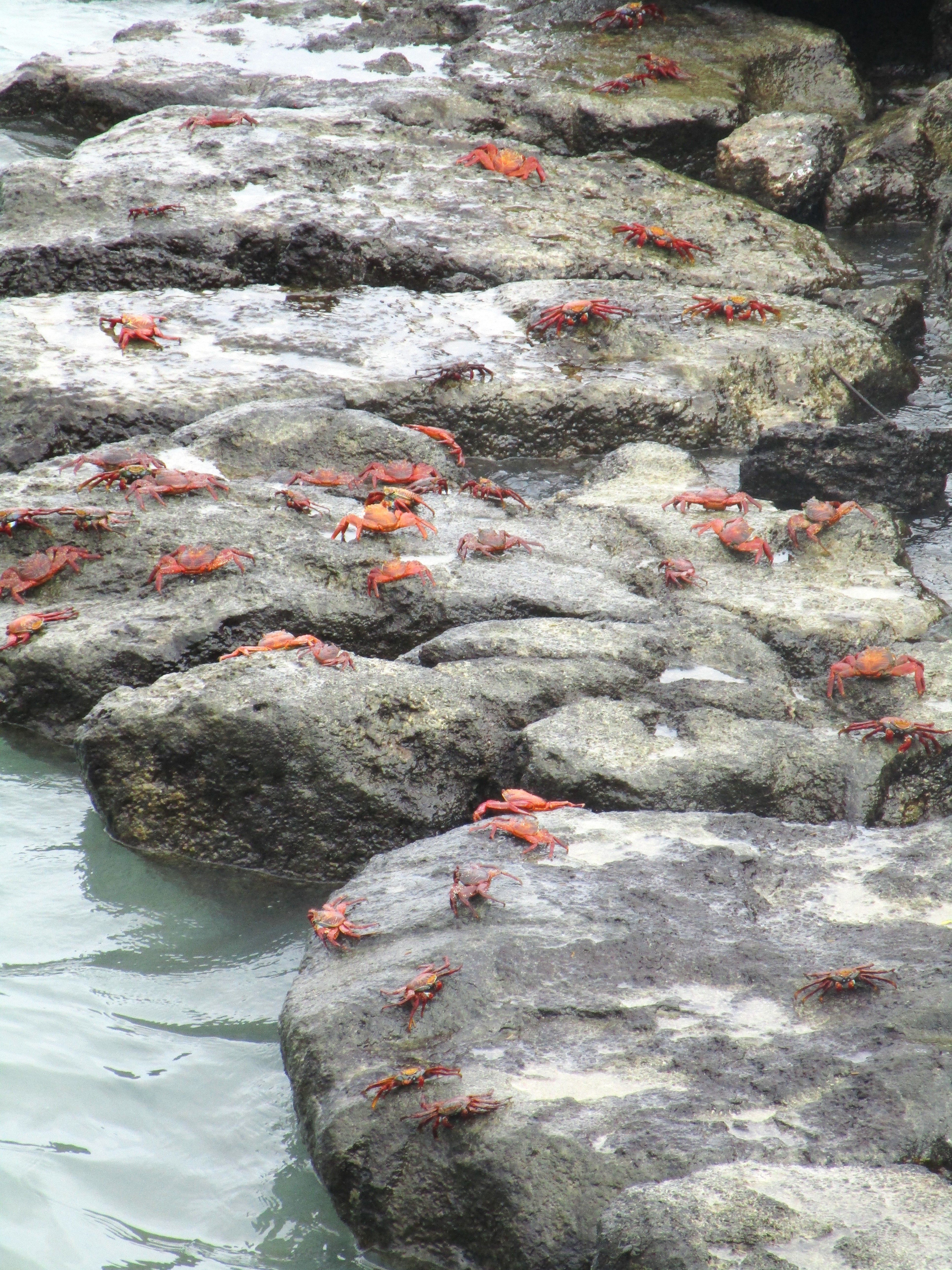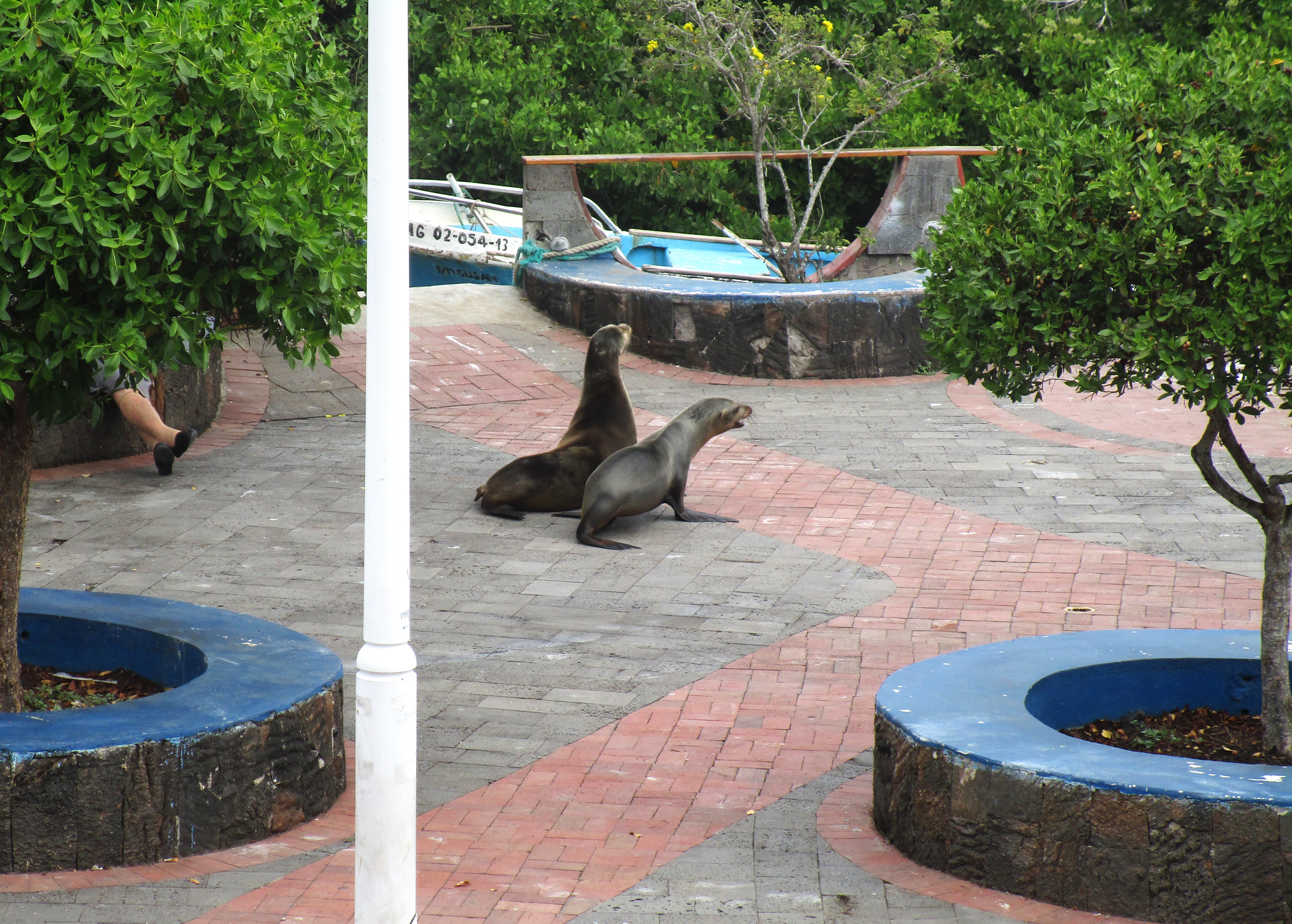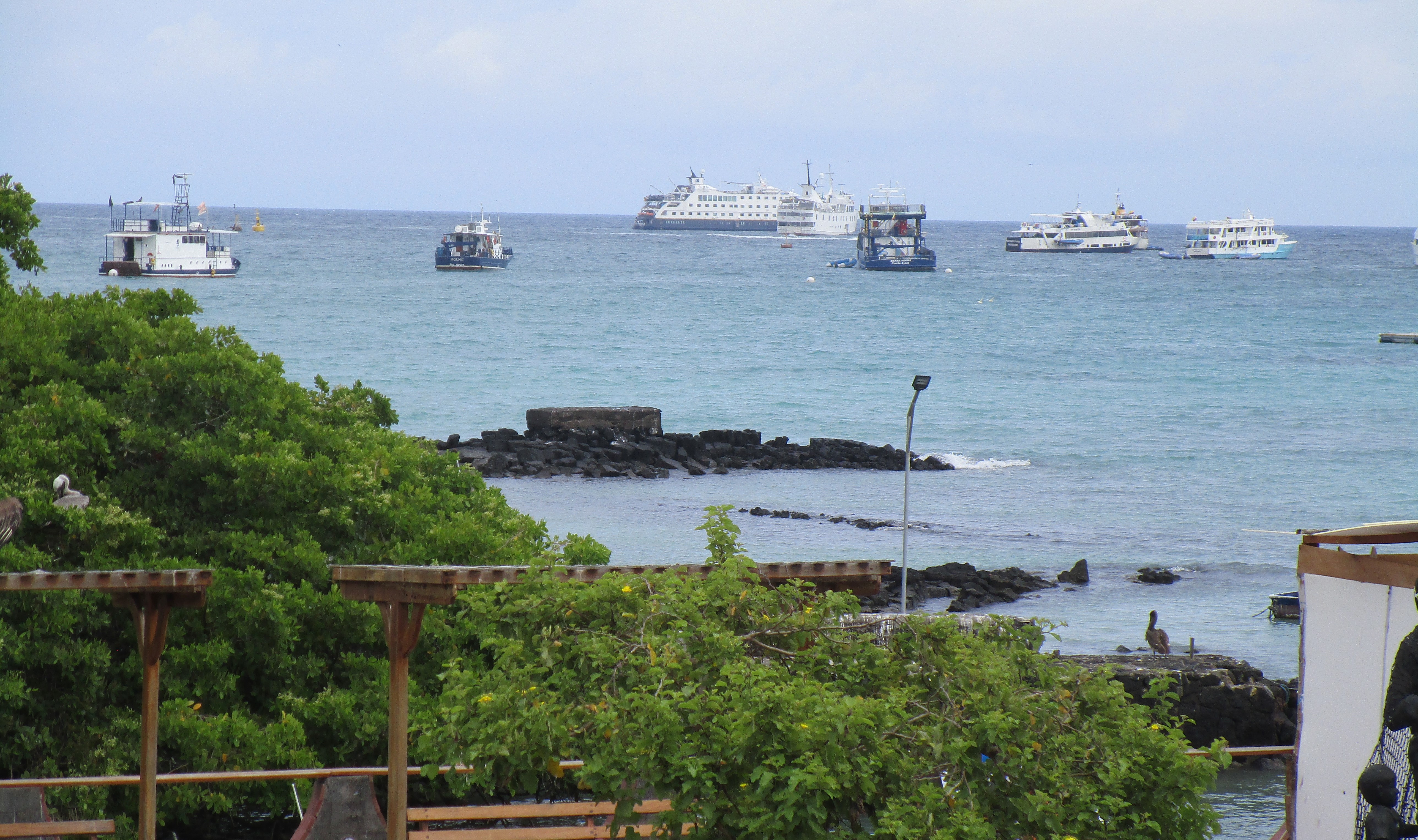 Had a late lunch then explored a bit of the harbor area including the Charles Darwin Research Center. The research center is dedicated to identifying new species of flora & fauna and to protecting existing species here in Galapagos. Mostly a closed research facility with a small museum and several beach areas where you can see marine life and iguanas. Good cause and a good walk after lunch. The only downside was the torrential rain the came up just as we were leaving. Spent about 20 minutes under a nice tree shelter watching the road wash away. Doesn’t seem to bother the iguanas.  Back to town for an afternoon cocktail.