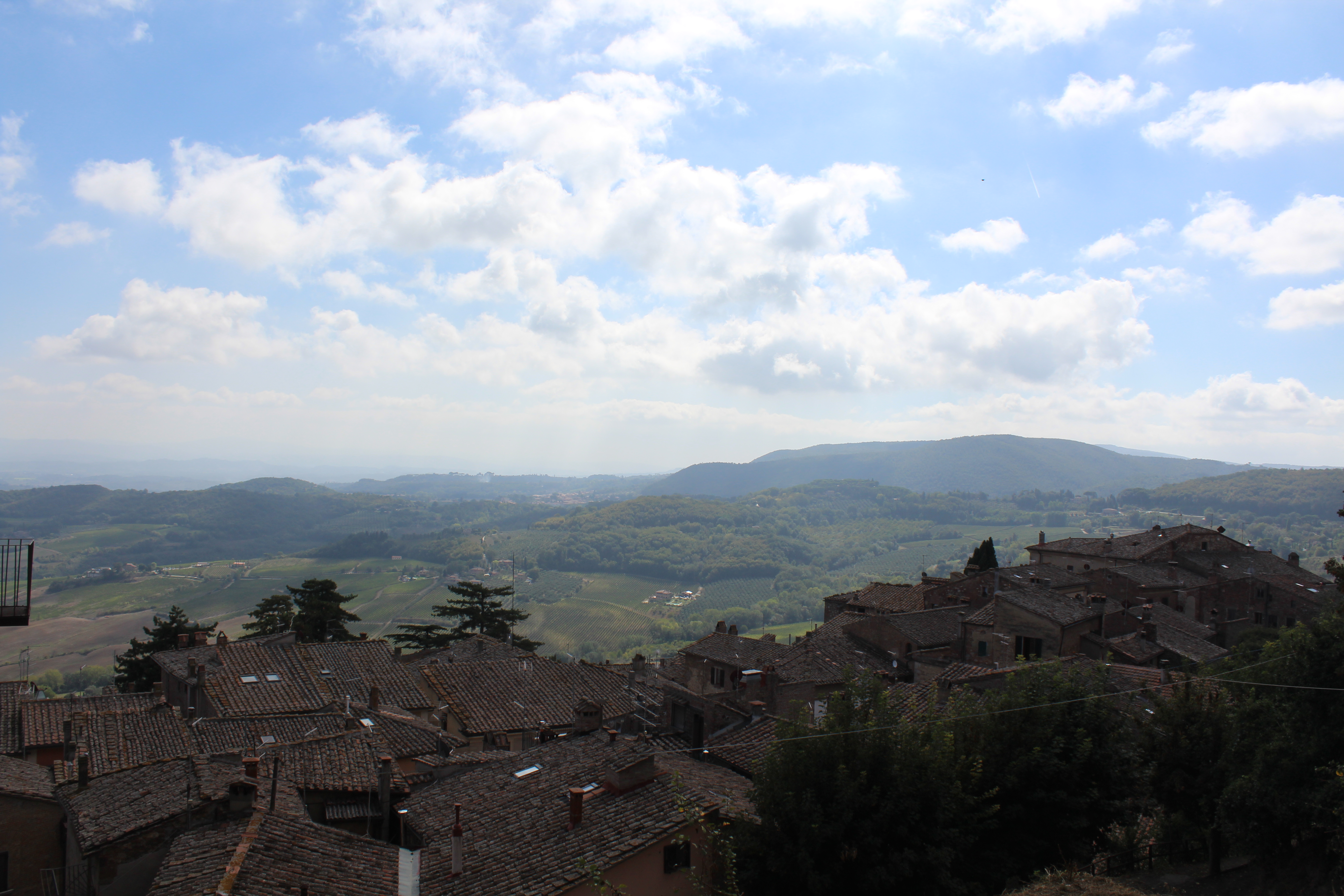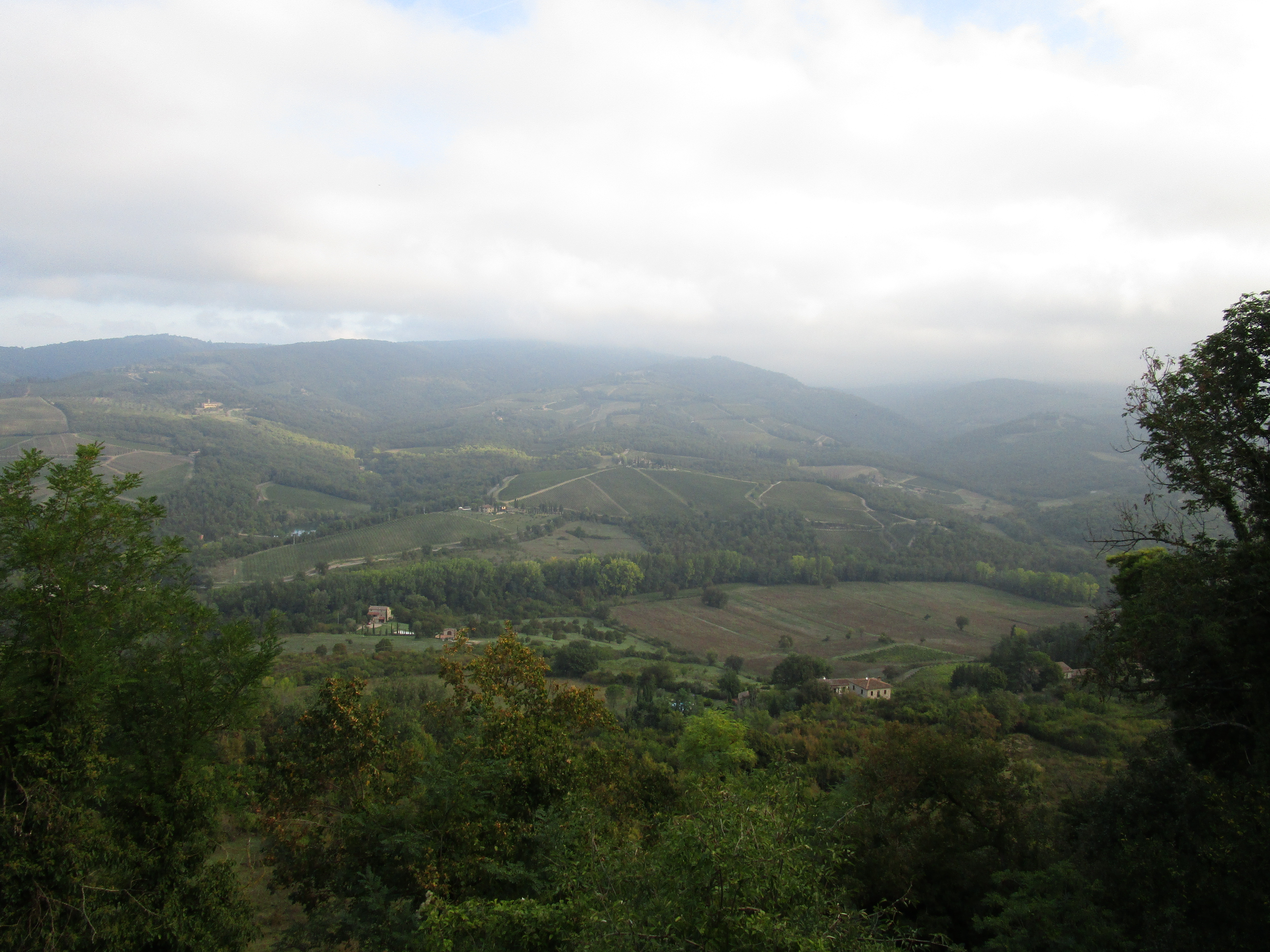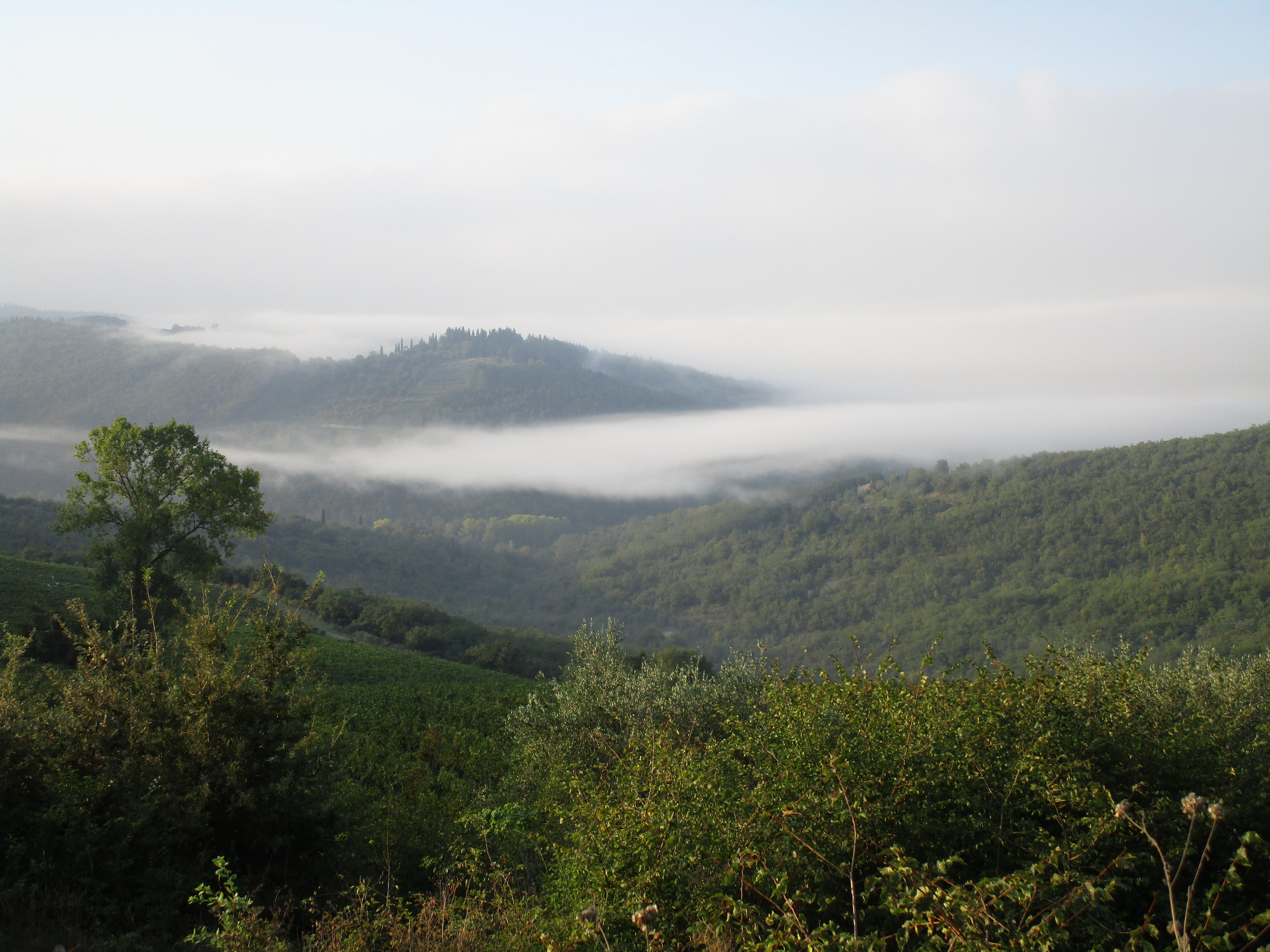 Yesterday morning was cool, around 70F with a bit of fog in the valleys. It’s harvest time so about half of the fields we see have been picked, the other half is bursting with grapes, big, full purple grapes that will one day be that magical of elixirs, Chianti!