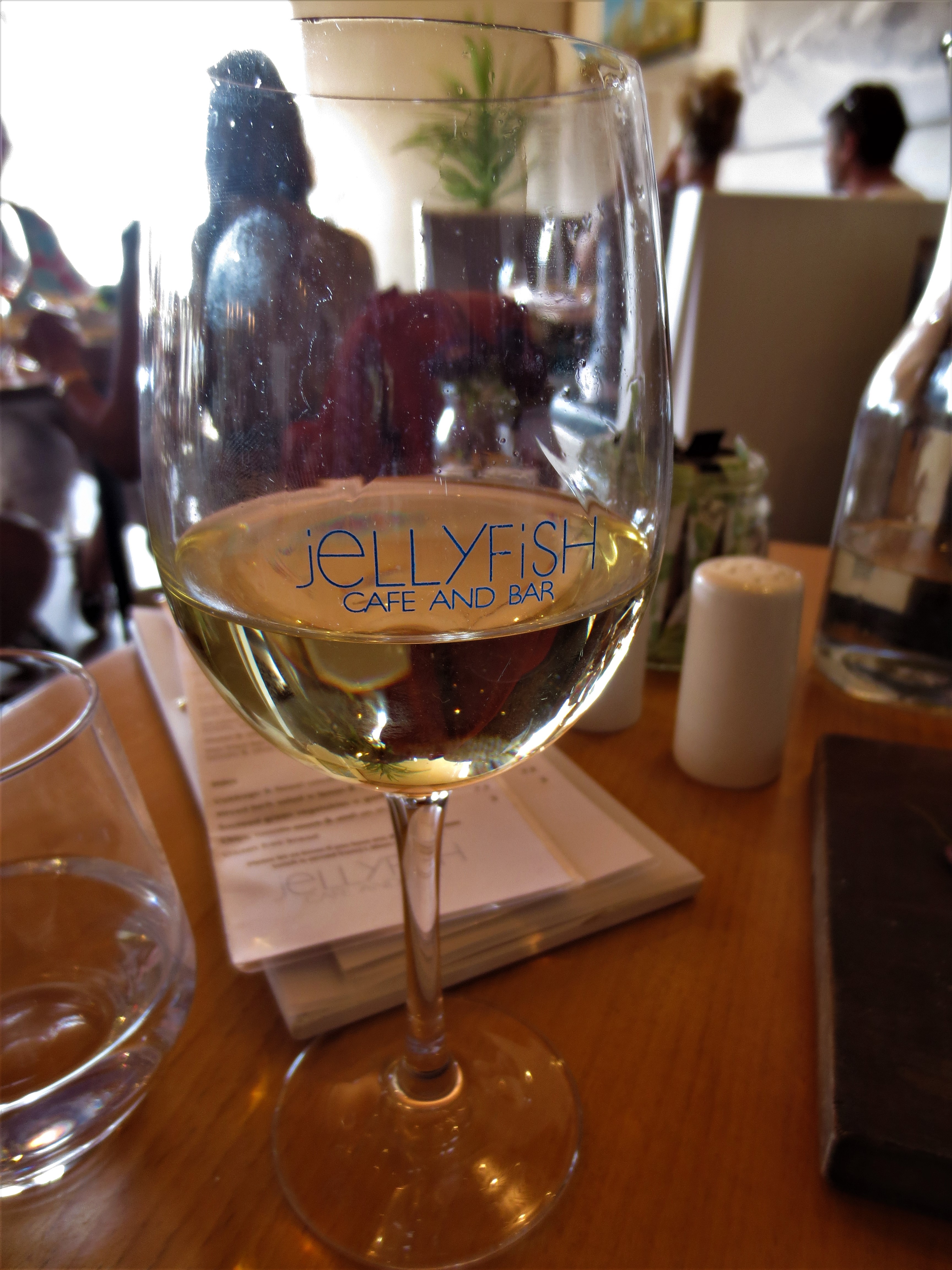 Back to Mapua for a late lunch at the “Jellyfish Café & Bar”. Serving portions looked good size so we decided to split the fish & chips and have fresh baked bread with olives and oil as an appetizer. Of course Collette had to have a glass of wine so we ordered two, you know what they say about people who drink alone…..