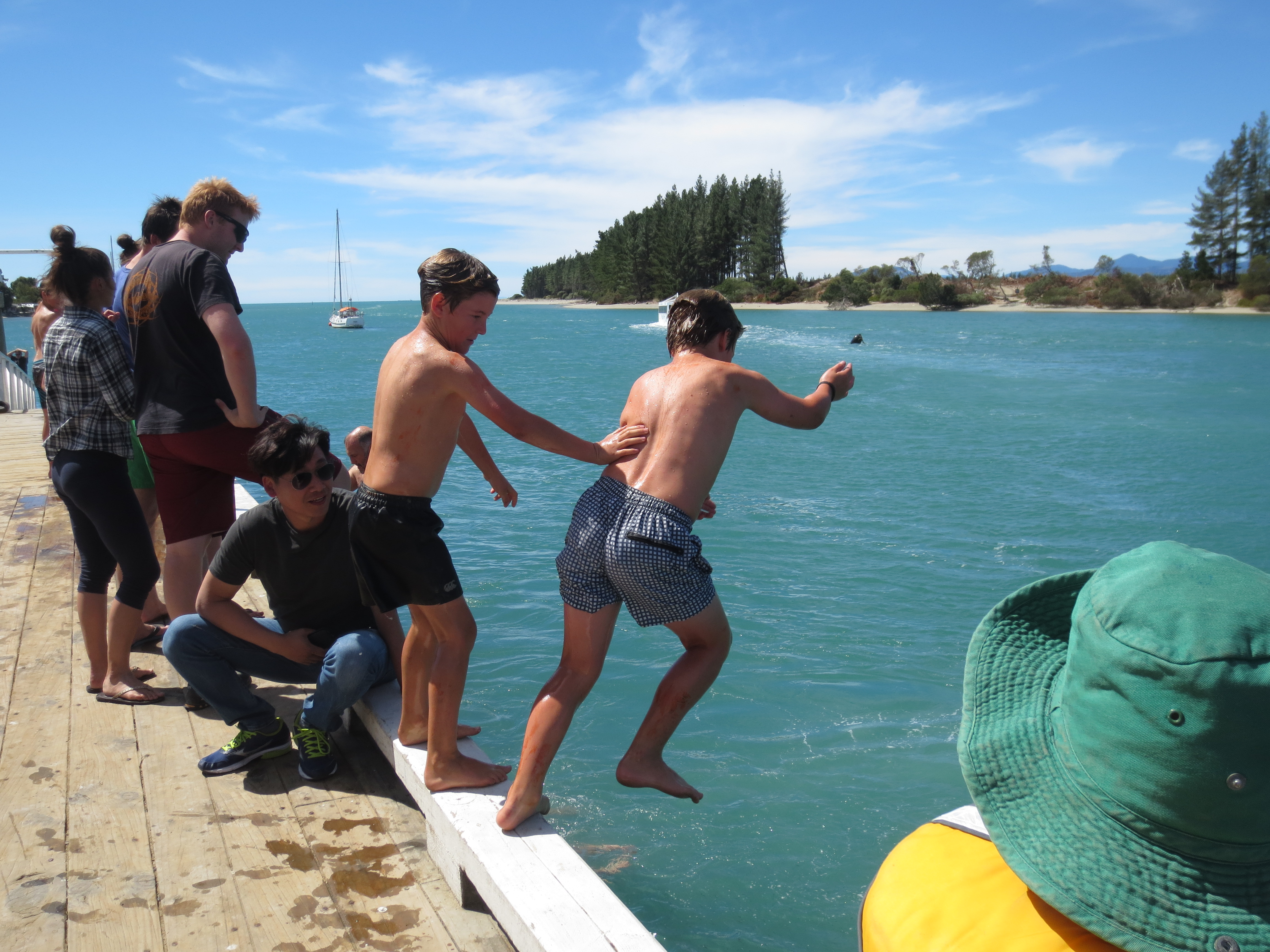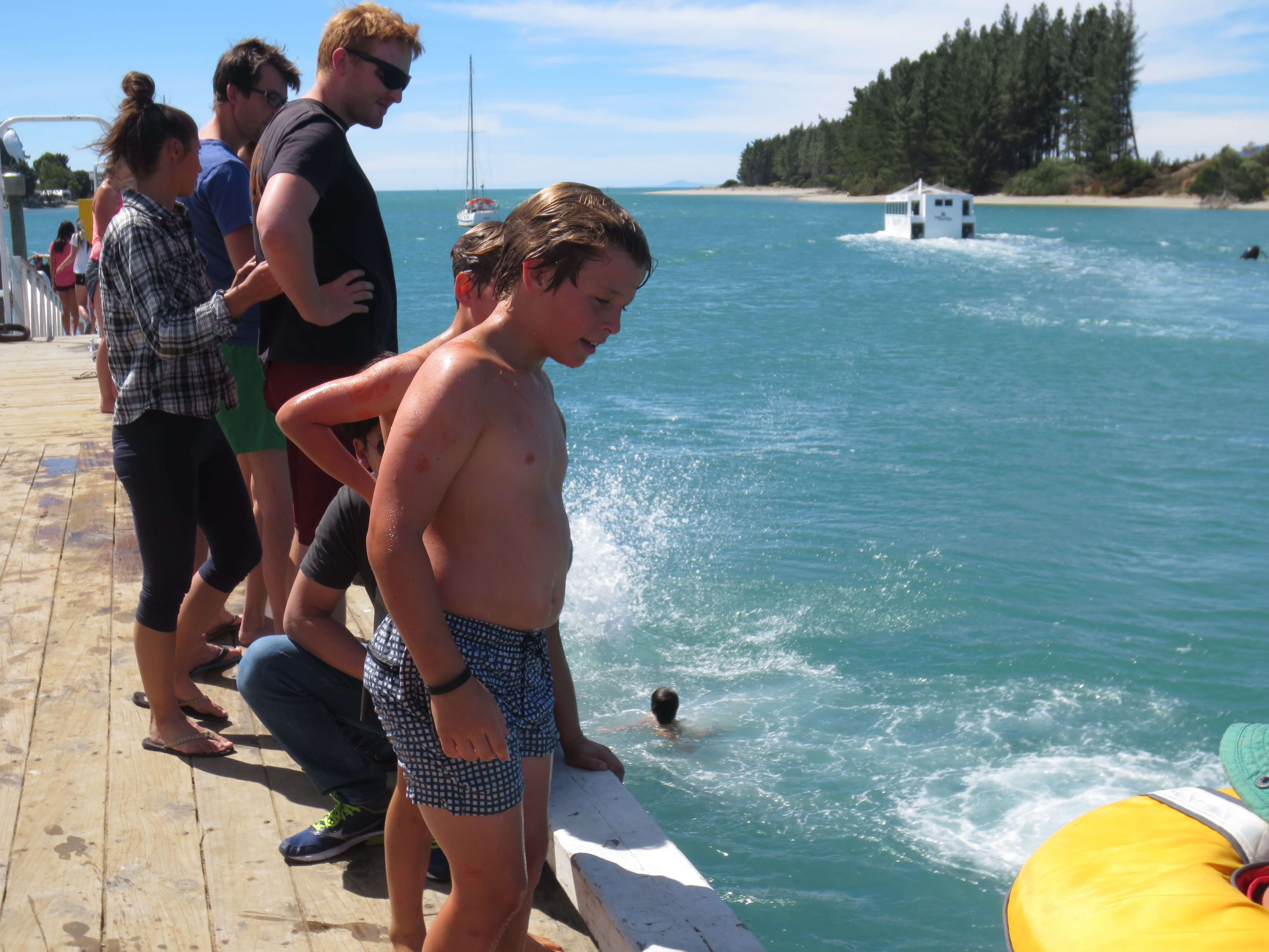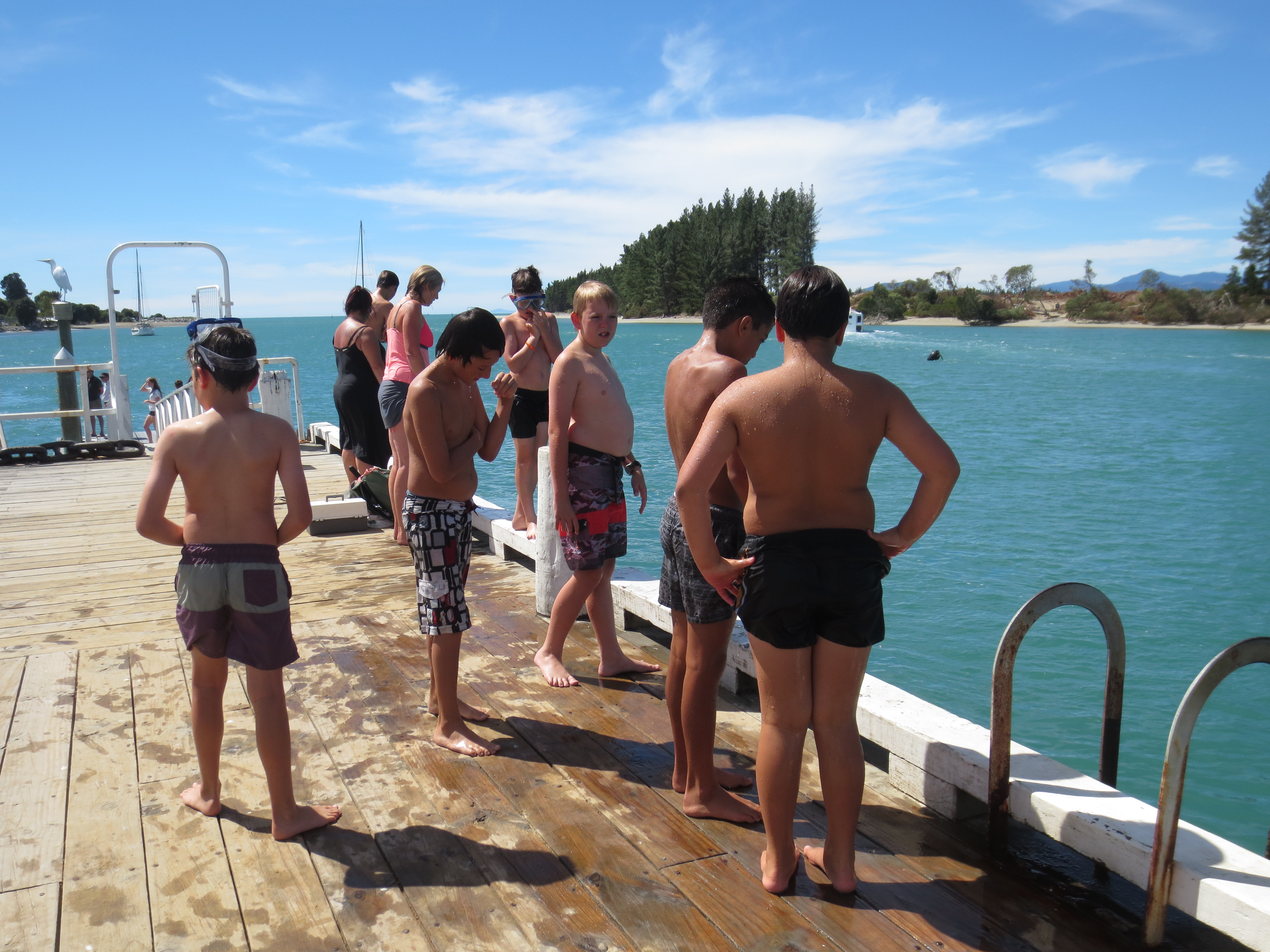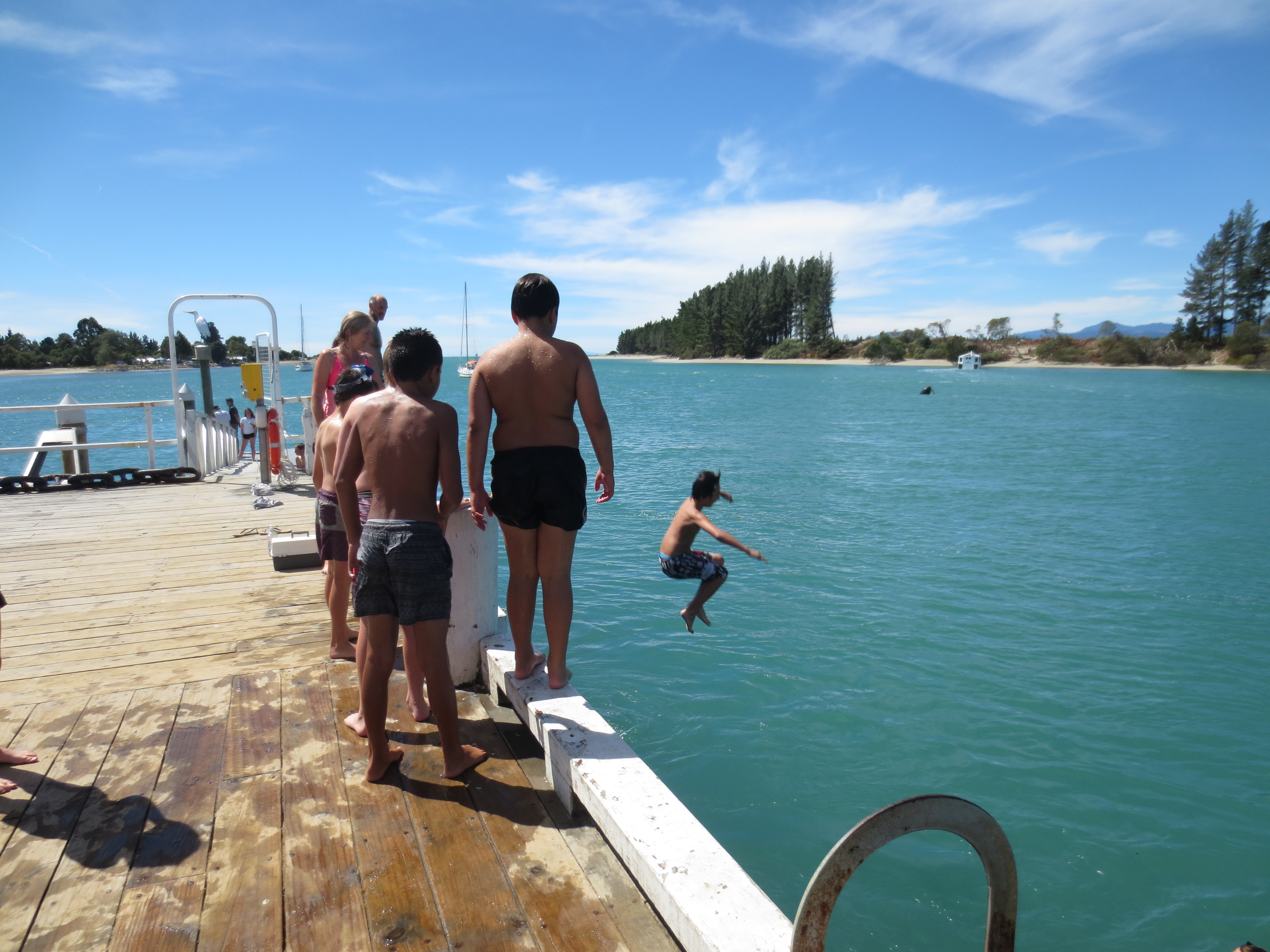 Sunday morning and just about on NZ time. Good evenings rest so we decided to take a drive to Mapau (pronounced, “Ma-Poe”) and see what the locals call, wharf jumping. Nice drive, only about 45 minutes and it wasn’t difficult to find. Â
