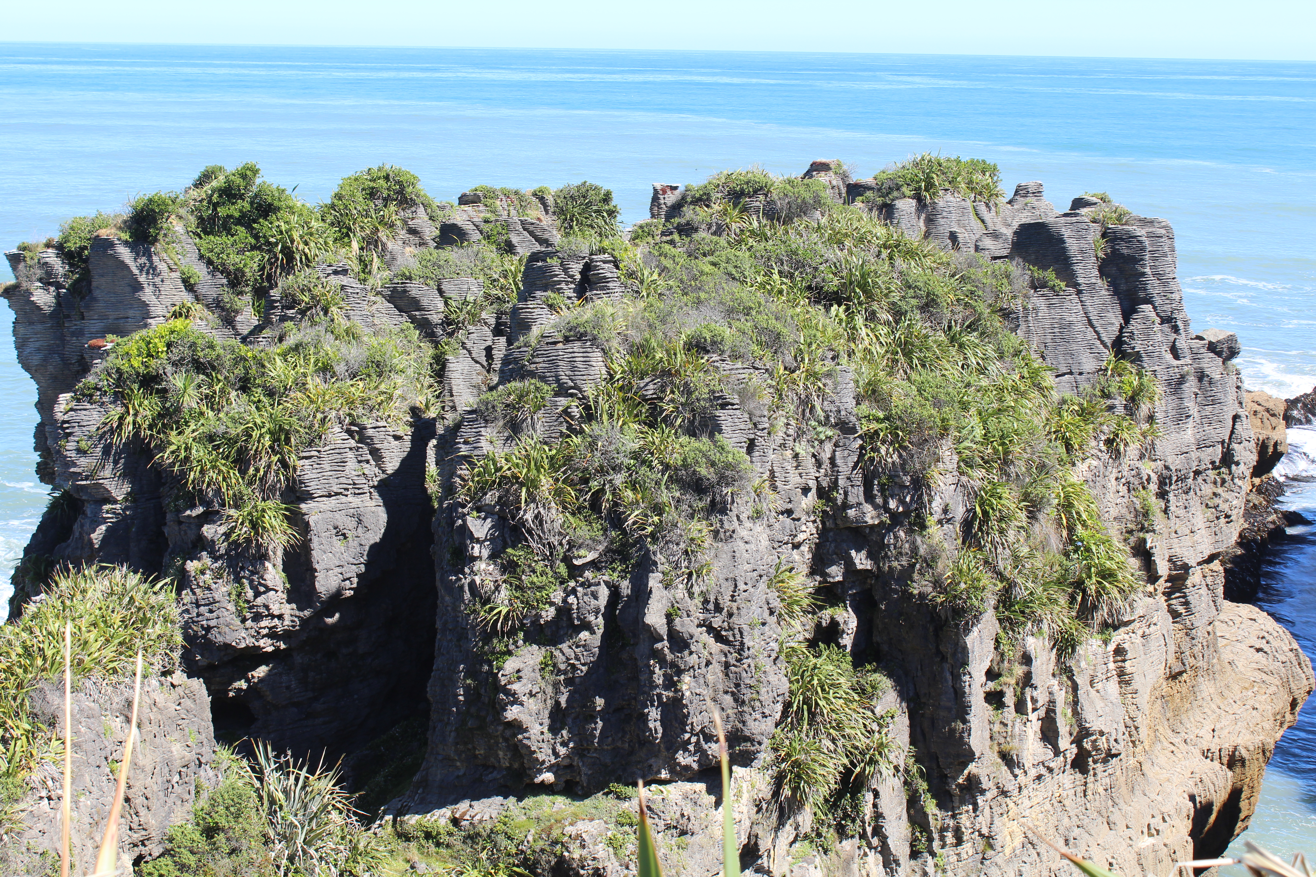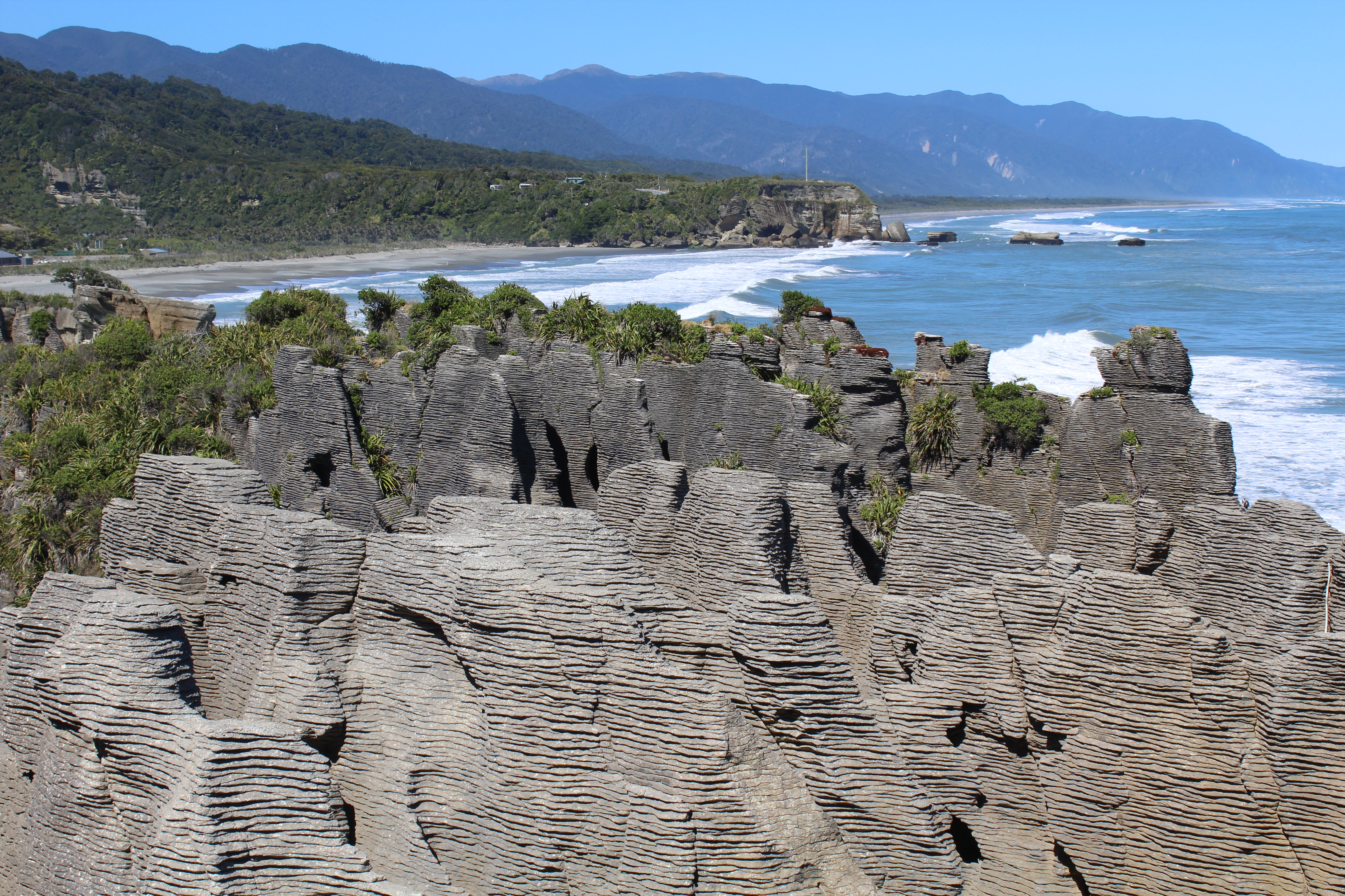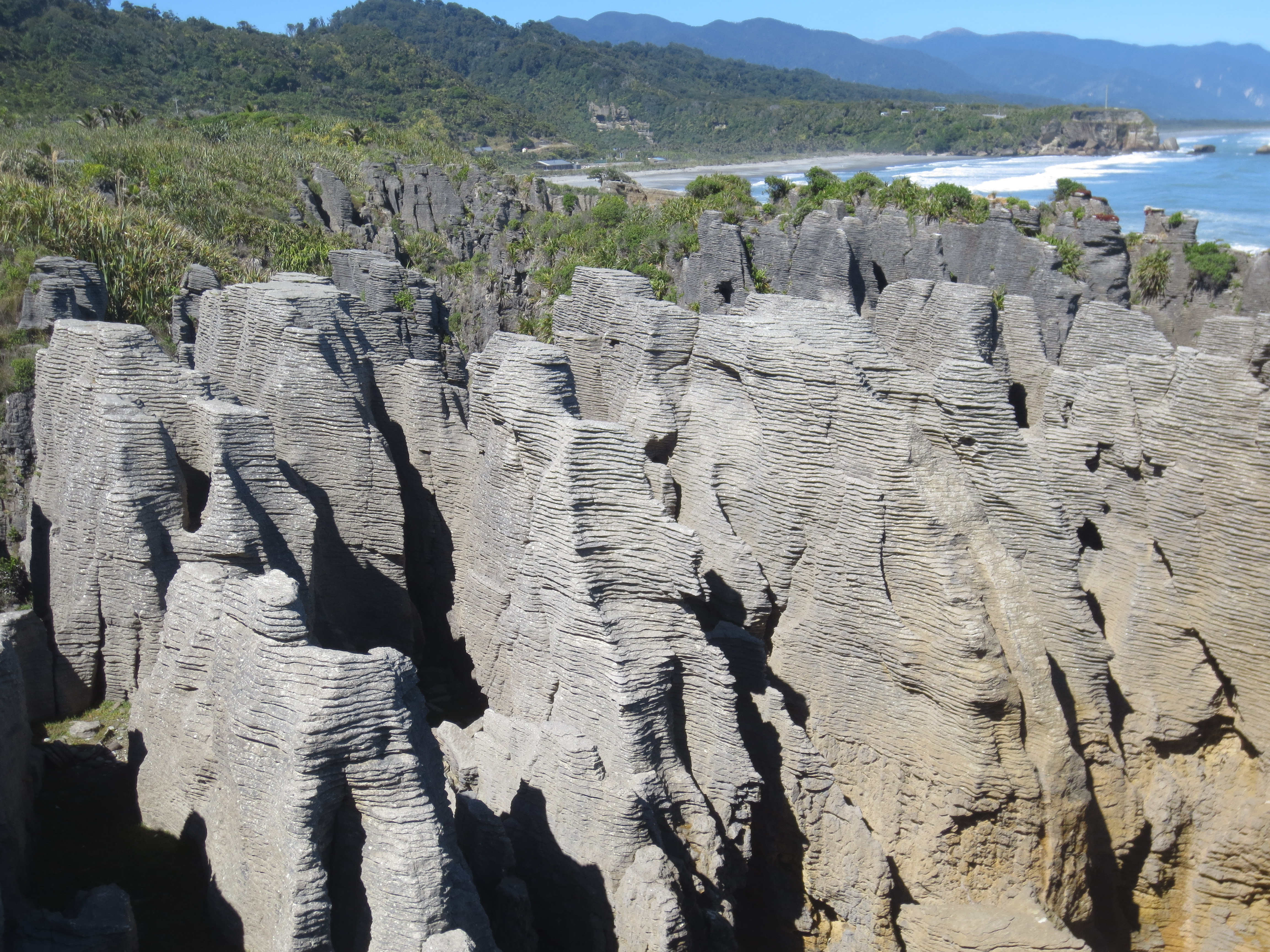 A quick detour to the little town of Punakaiki (pronounced,…ah hell, I don’t know) and Dolomite Point.  We tramped (like that?) out to see the blowholes and the Pancake rocks.  Seems the blowholes had the day off but the rocks were still there. I understand that these formations are caused by extreme pressure on the alternating hard and soft layers of decomposing sea creatures. Well, maybe.