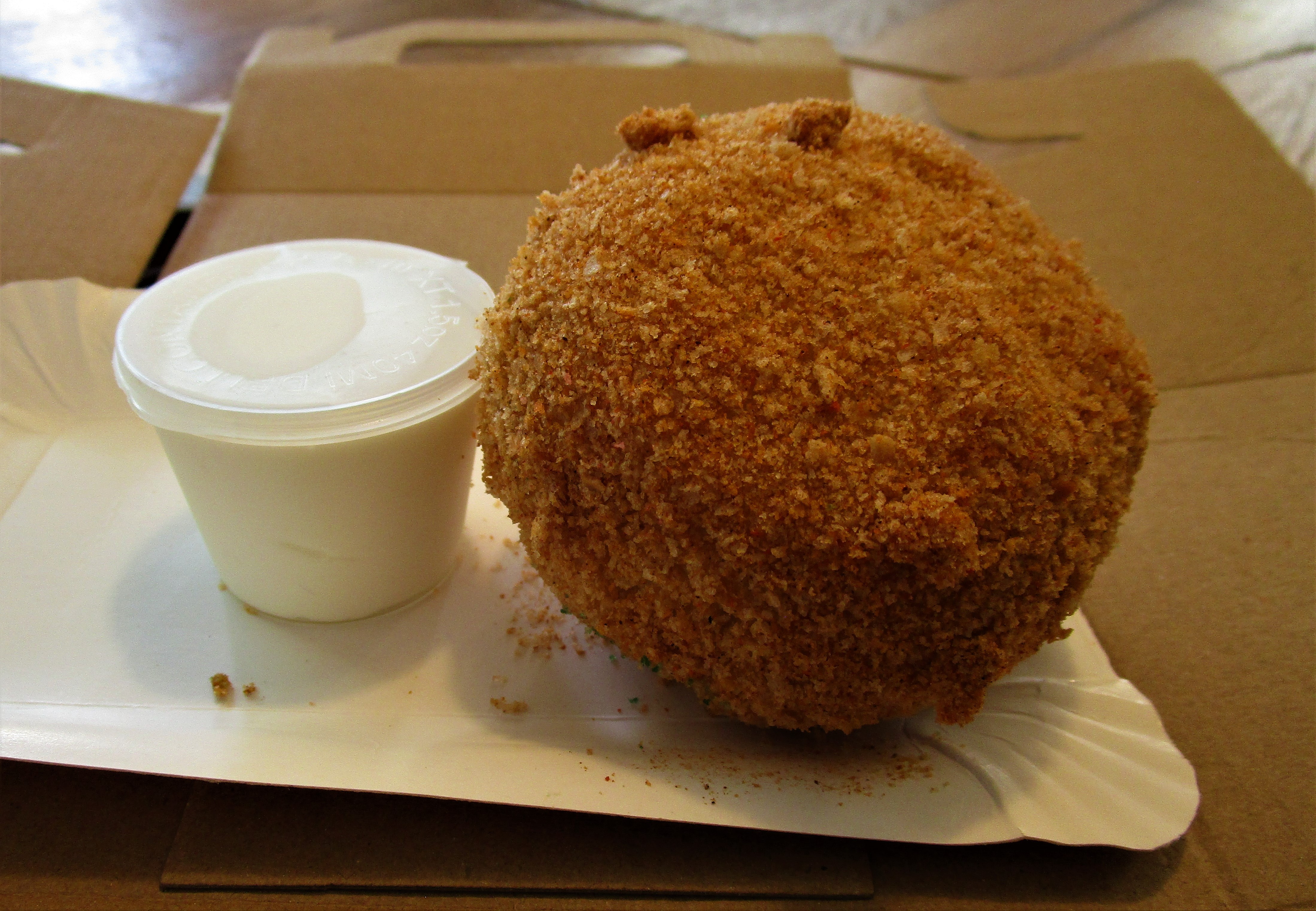 Getting to be eating time at the zoo again so time to find that perfect people watching spot and chow down. And wouldn’t you know it, on our way to eat, there’s a snack shack with a real interesting food. Knedlin is a shop that specializes in dumplings. But not just some plain old dumpling, filled dumplings with fruit or meats and sauce. Now that’s a snack! We had to try one so we ordered the hot & spicy ball. Not really hot & spicy, more like BBQ but very tasty. Now onward to the restaurant…