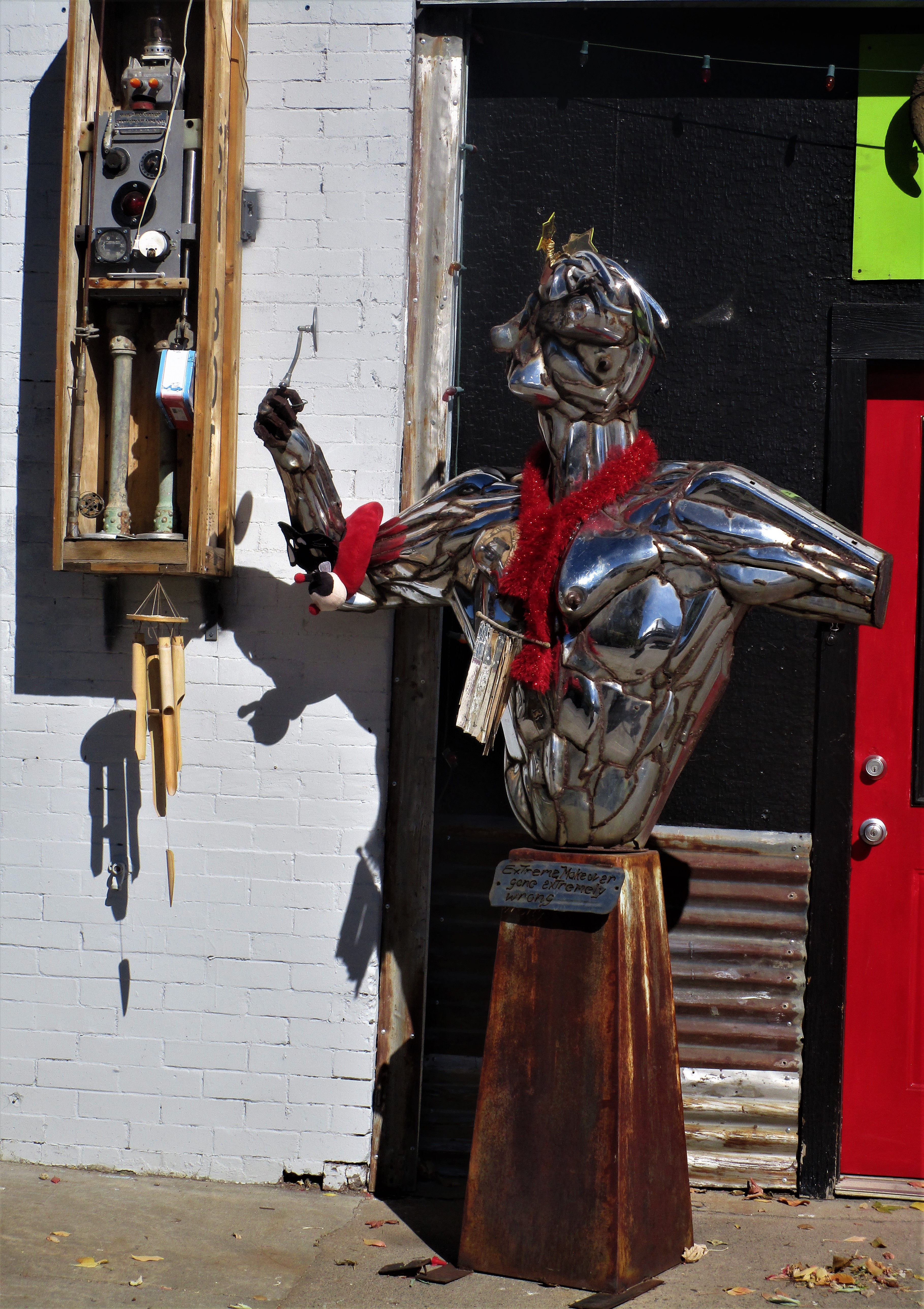 IMG_9597 (2) IMG_9601 (2) IMG_0072 (2)Somerset is a really small town, not much in the way of tourist attractions or restaurants for that matter, so we spent a little time just cruising through the streets to see what’s there. Surprise! There are a couple of buildings housing art co-ops that looked pretty interesting. The first had there sculptures out front with some bizarre advertisements. Collette took a couple of pictures of the co-ops and their sculptures then we realized, one of these looks familiar. The chrome sculpture called, “Extreme makeover gone extremely bad” was a sculpture we saw in Crested Butte about a month ago. We believe this is the work of Sean Guerrero, the artist that creates his works in discarded chrome parts from automobiles and airplanes, but we’re having a hard time confirming that. Anyway, this sculpture was in Crested Butte so check out the other sculptures there. (see earlier post)