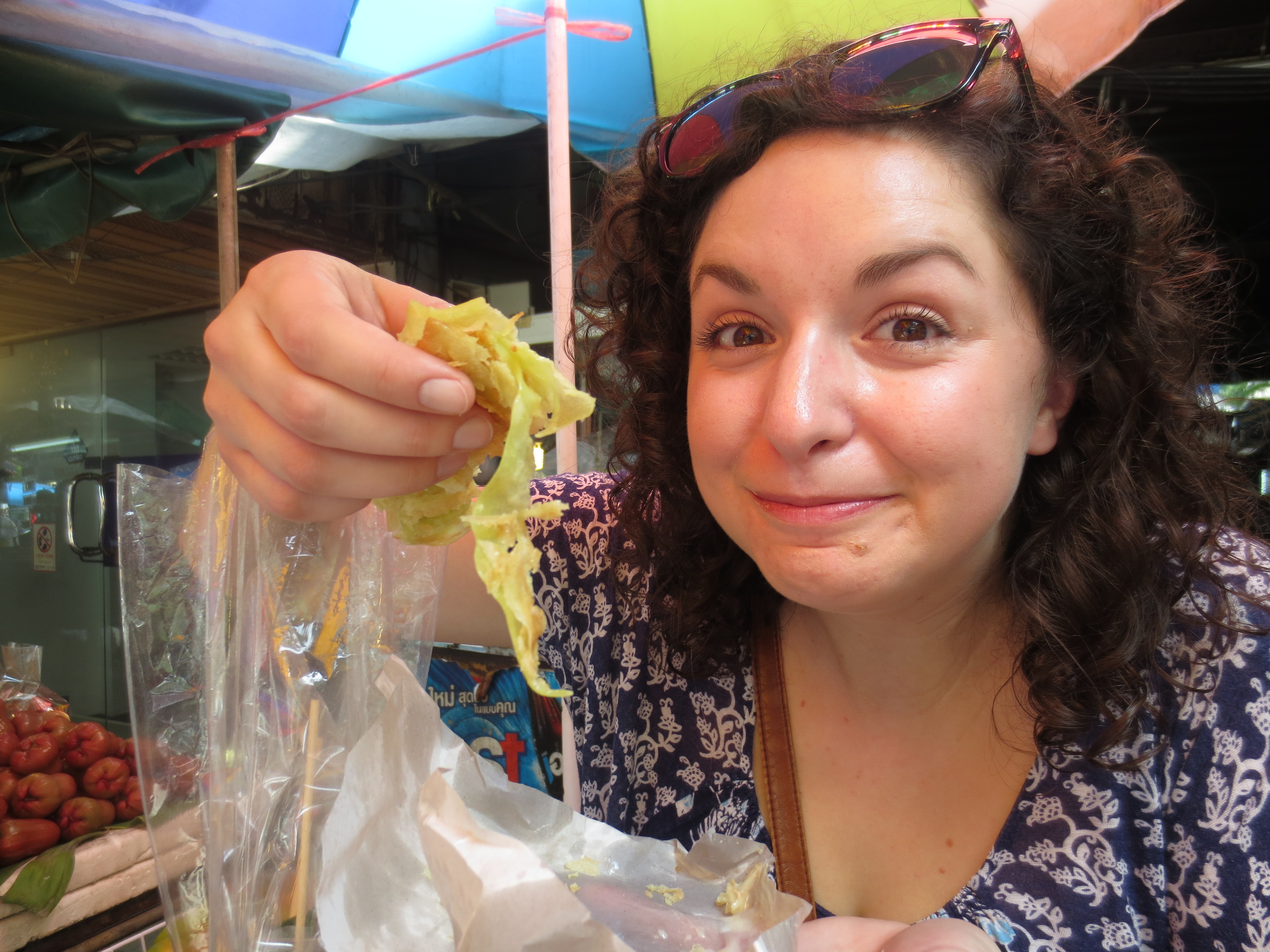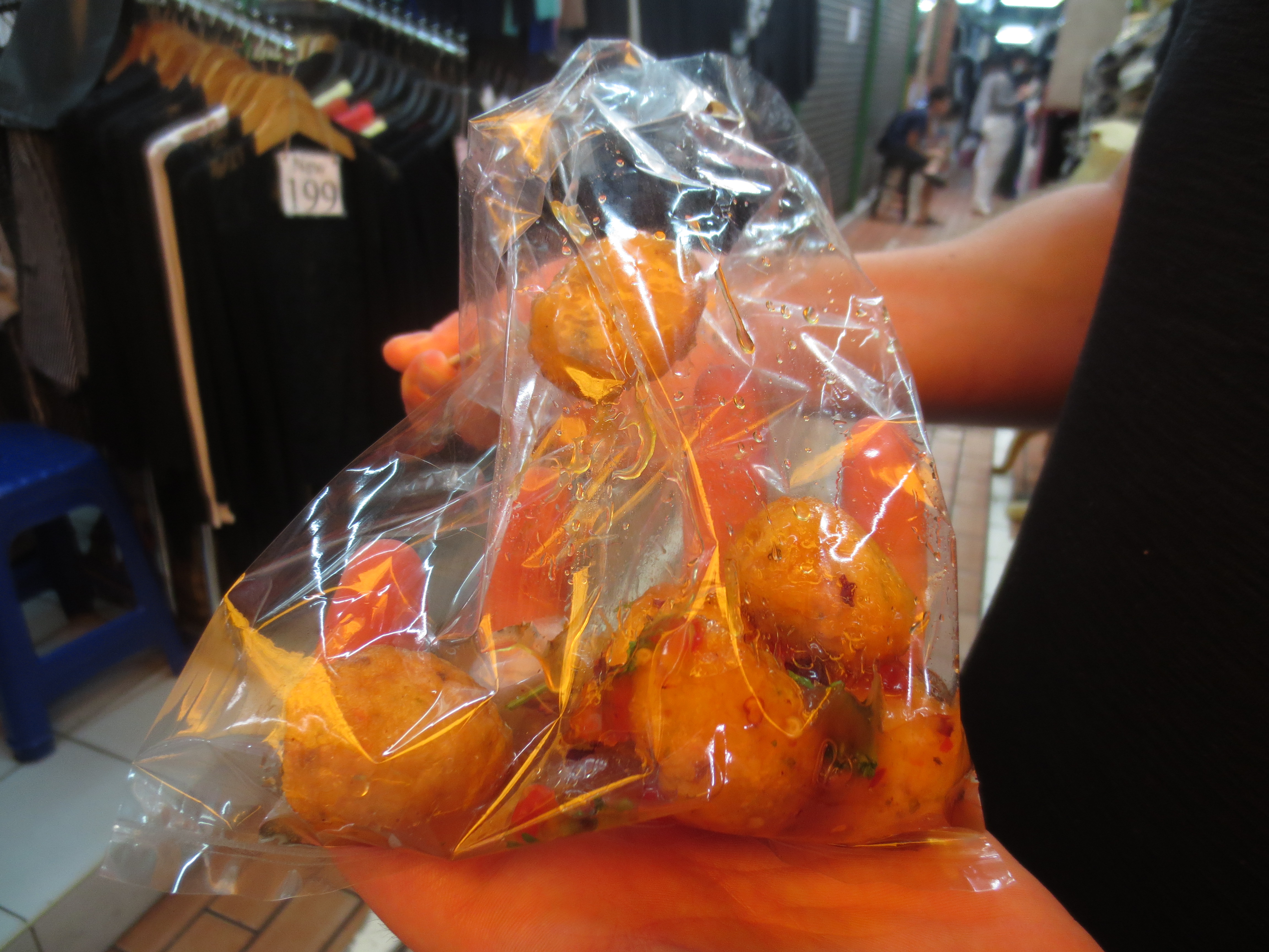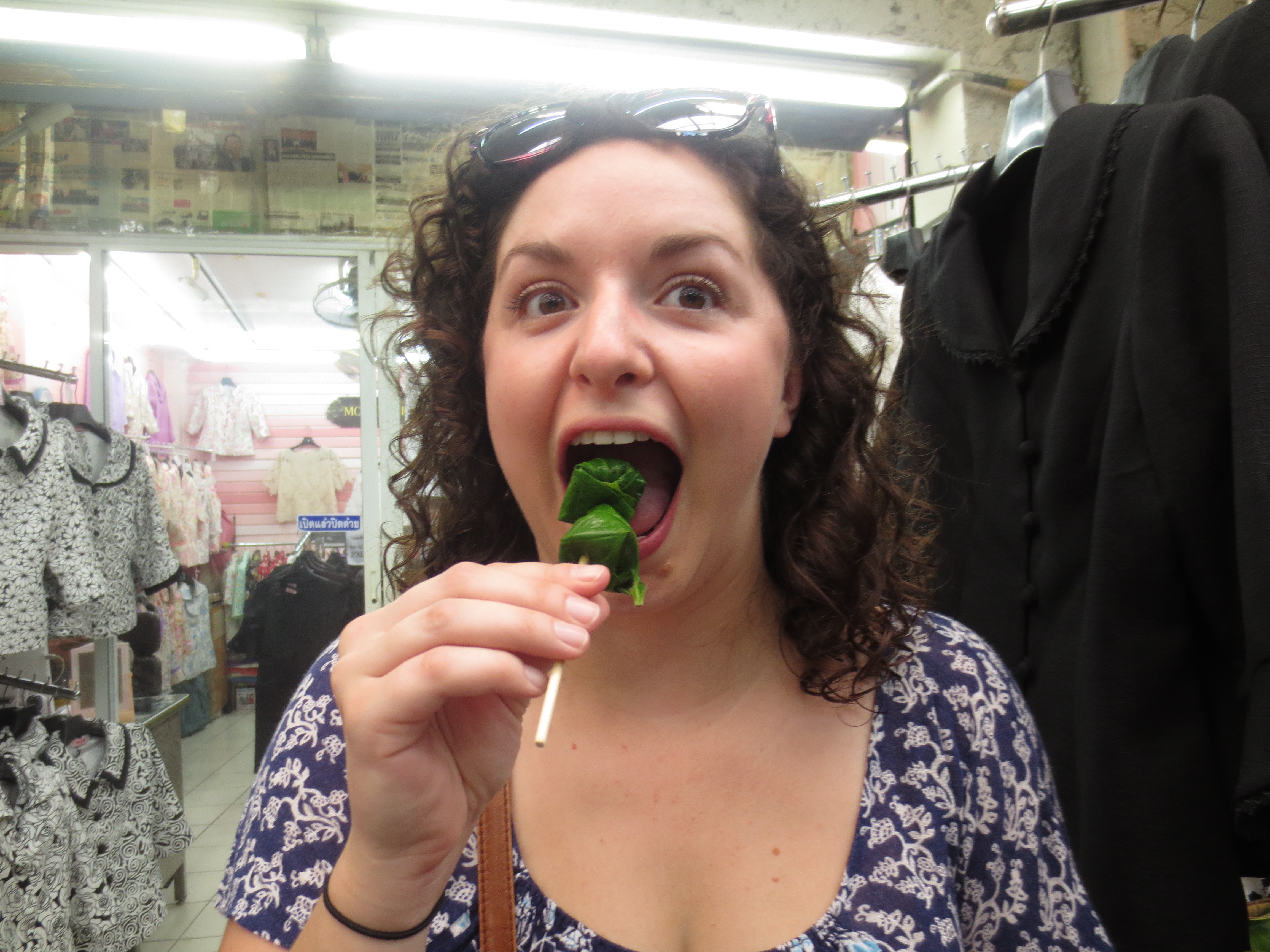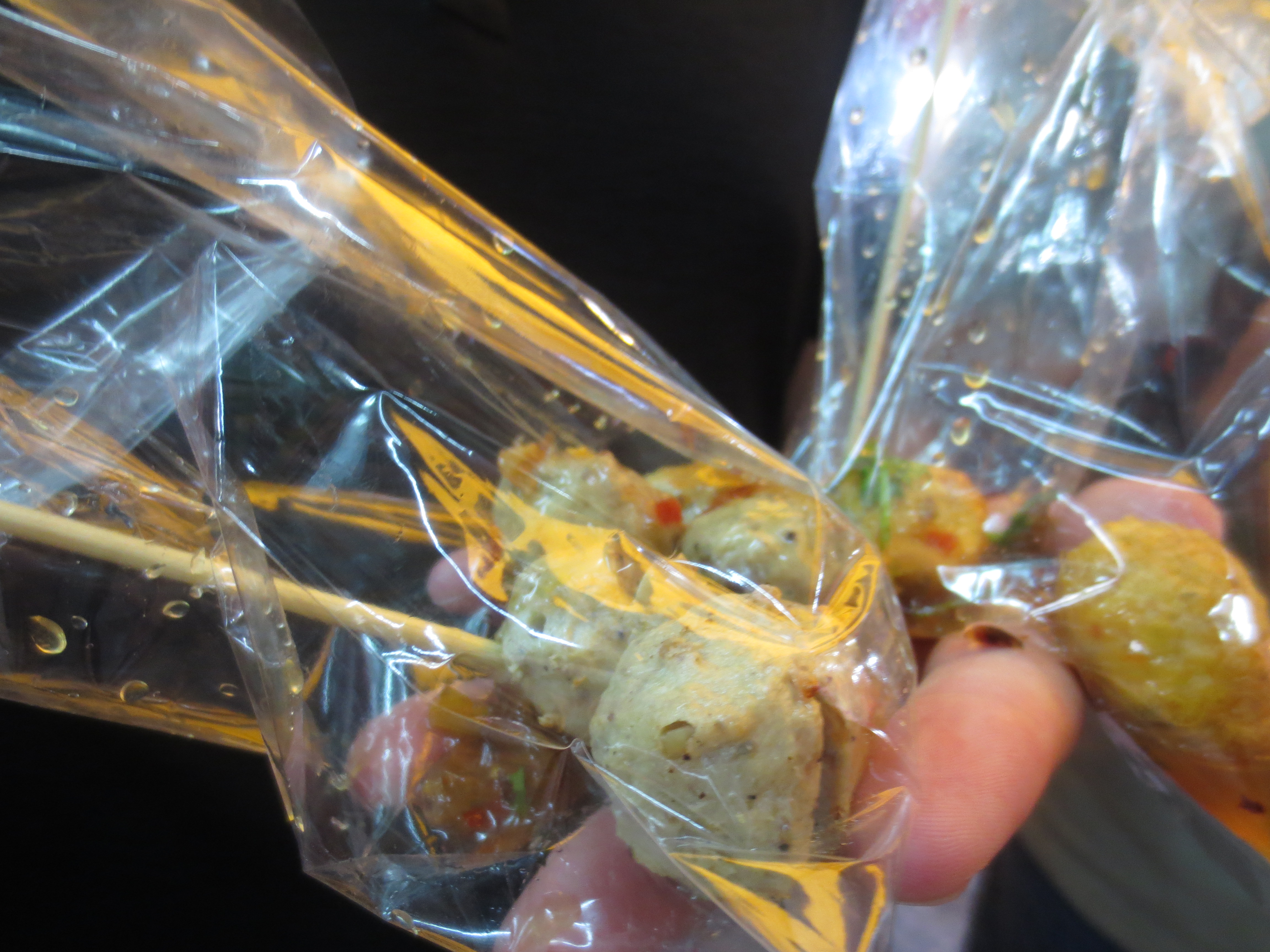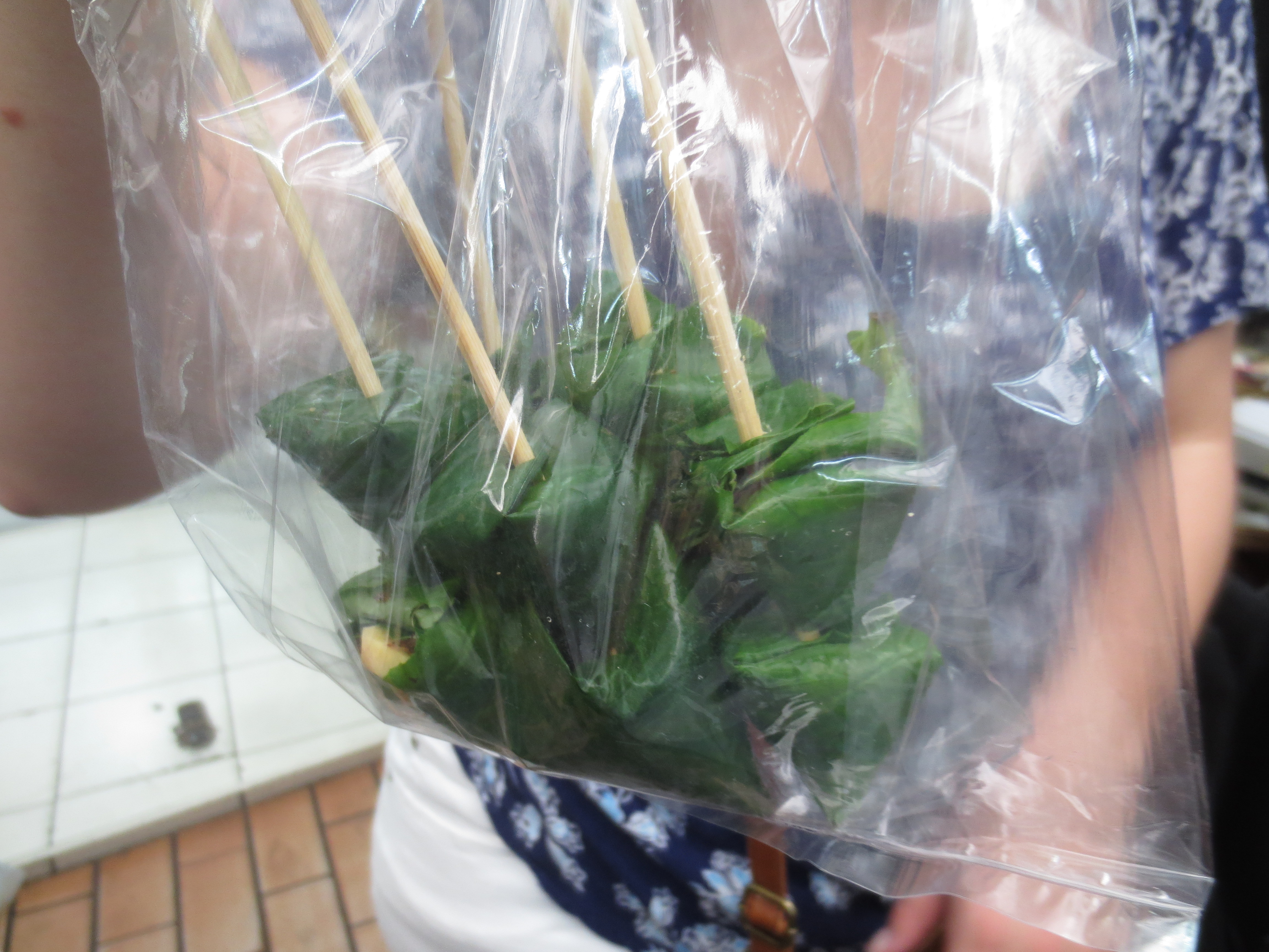 First up were some little leaf-covered triangle thingies in a bag. Not sure what they contained but since she bought enough for us all, had to try it. (Later on we saw someone eating what looked to be a larger version of these but they didn’t eat the leaves like we did!)