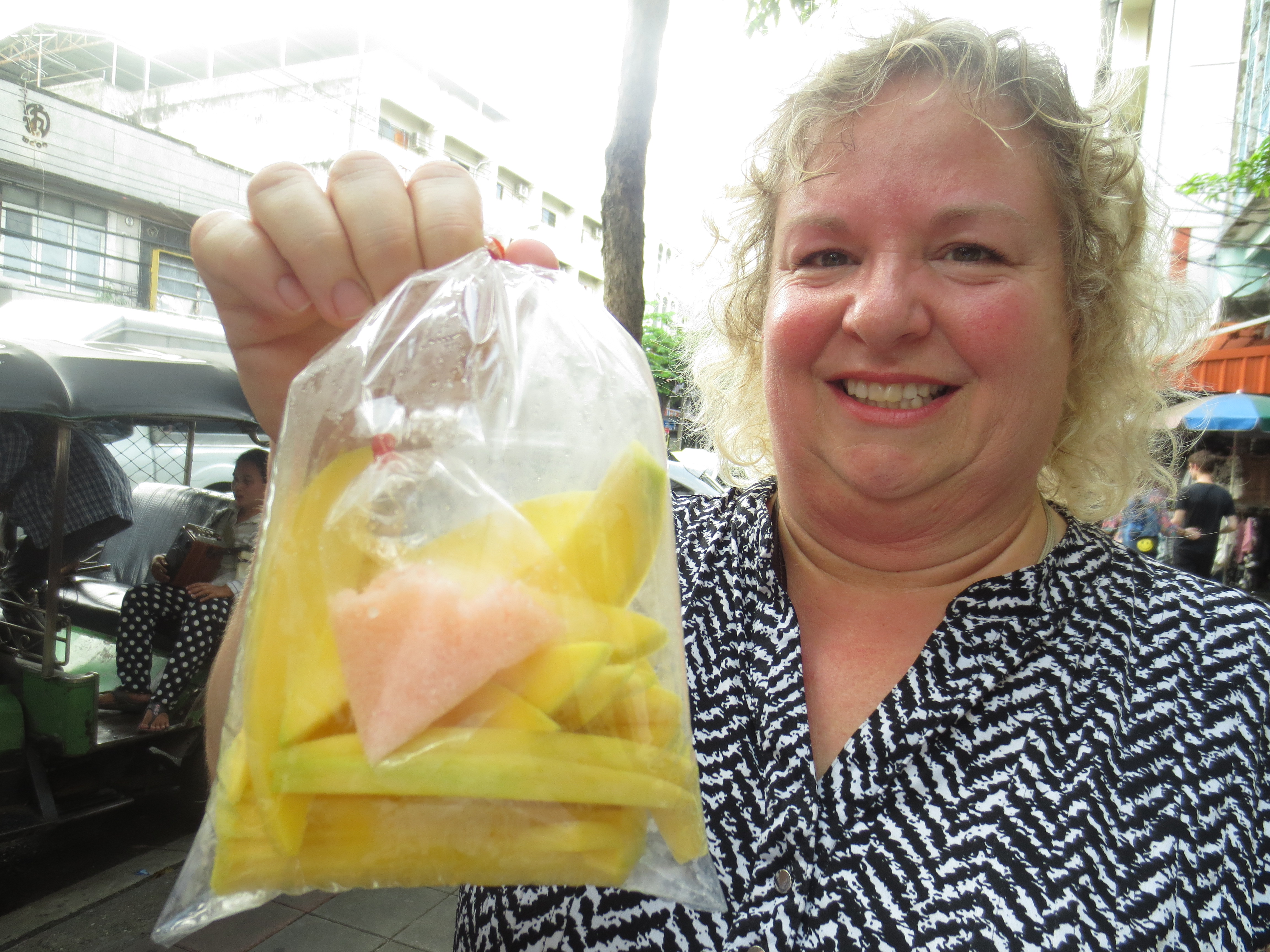 With a well-rounded lunch complete, just needed some desert to finish it off right. Betsy chose mango slices with sugar, while I selected a crepe-like dish with bananas and sweetened coconut milk. Not bad, actually really tasty lunch.