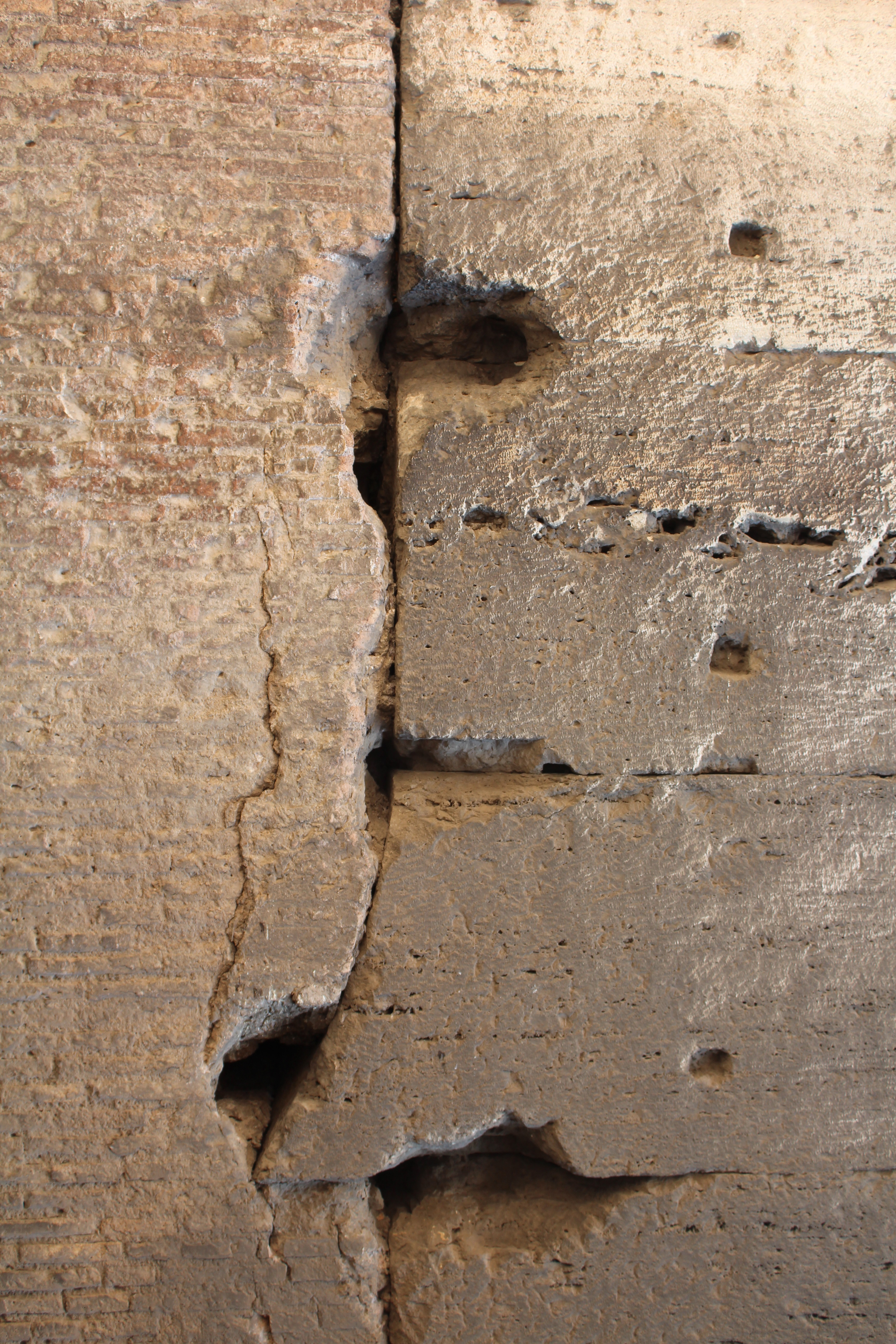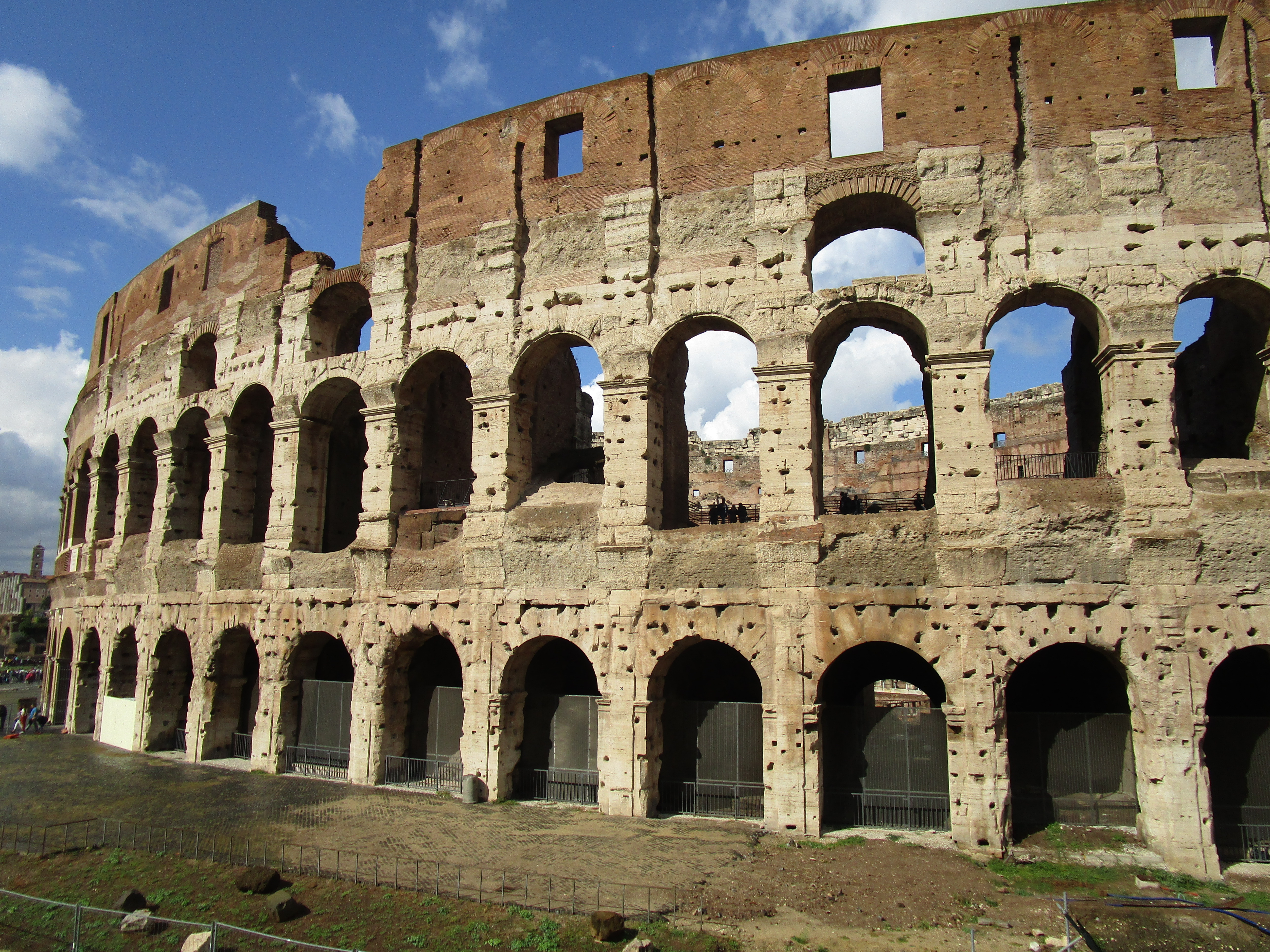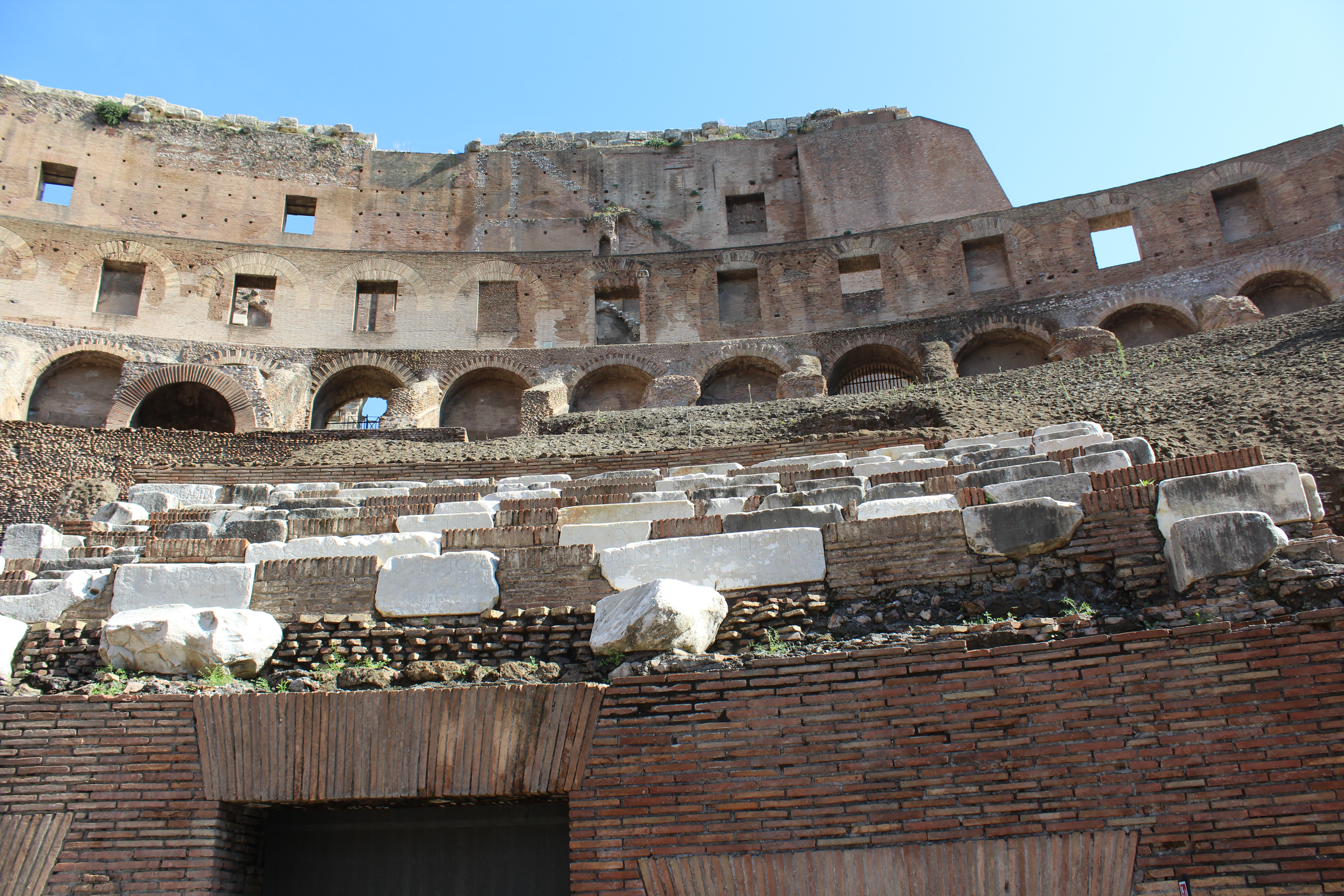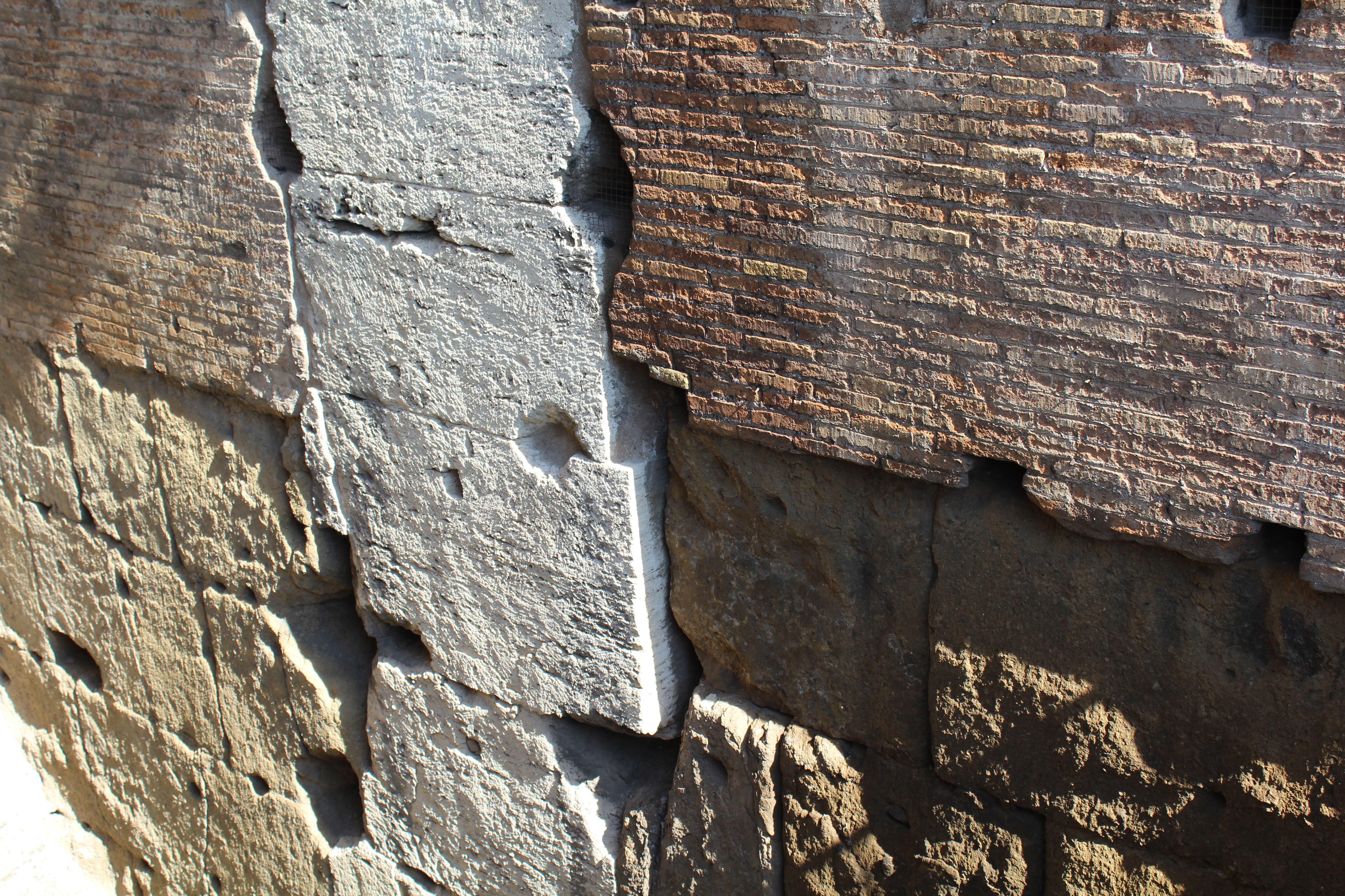 Here’s a picture of the materials used in constructing the Colosseum. This enabled the Romans to build bigger, higher and stronger structures than ever before. There is white marble in the middle, tufa on the right side and brick on top. Together, the mix of these materials and the use of archways, the Romans could build massive structures.