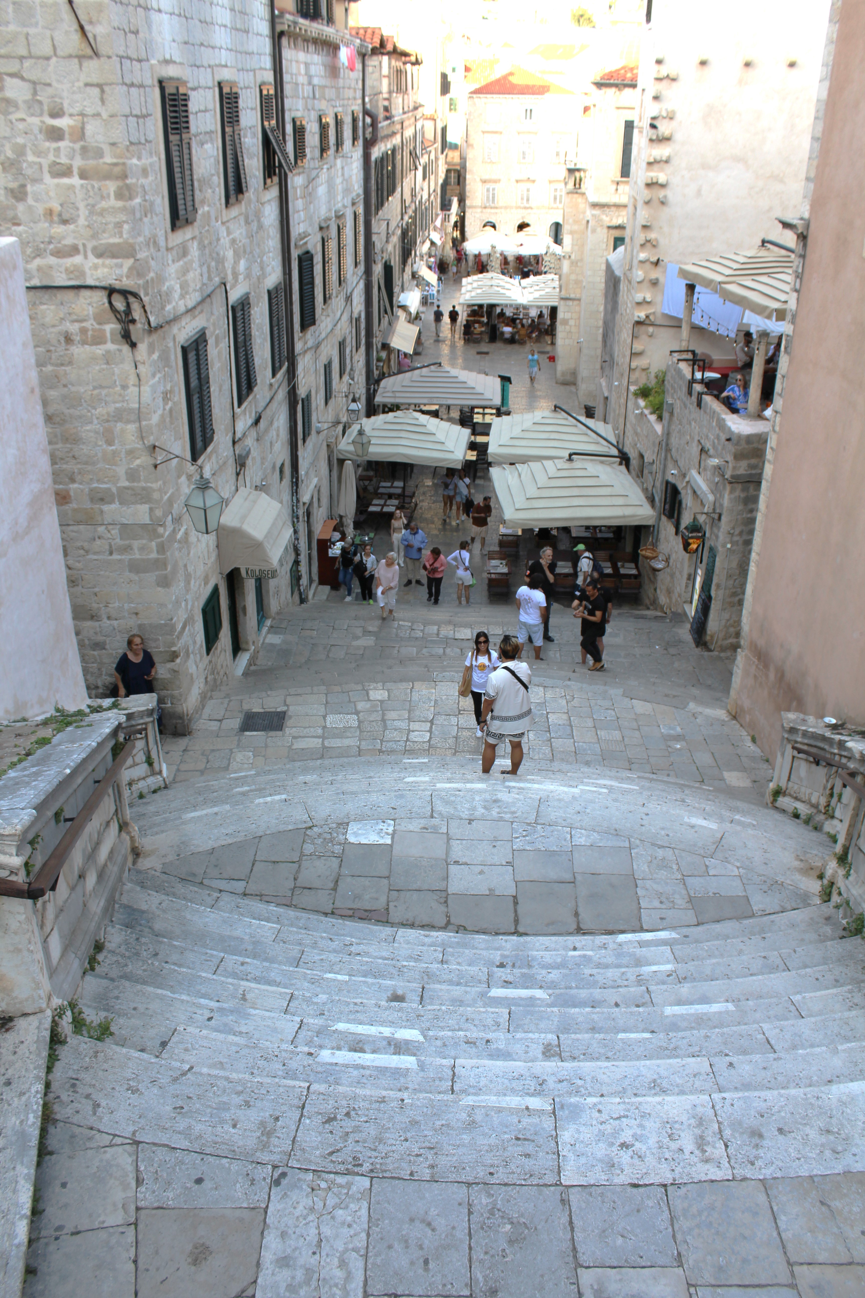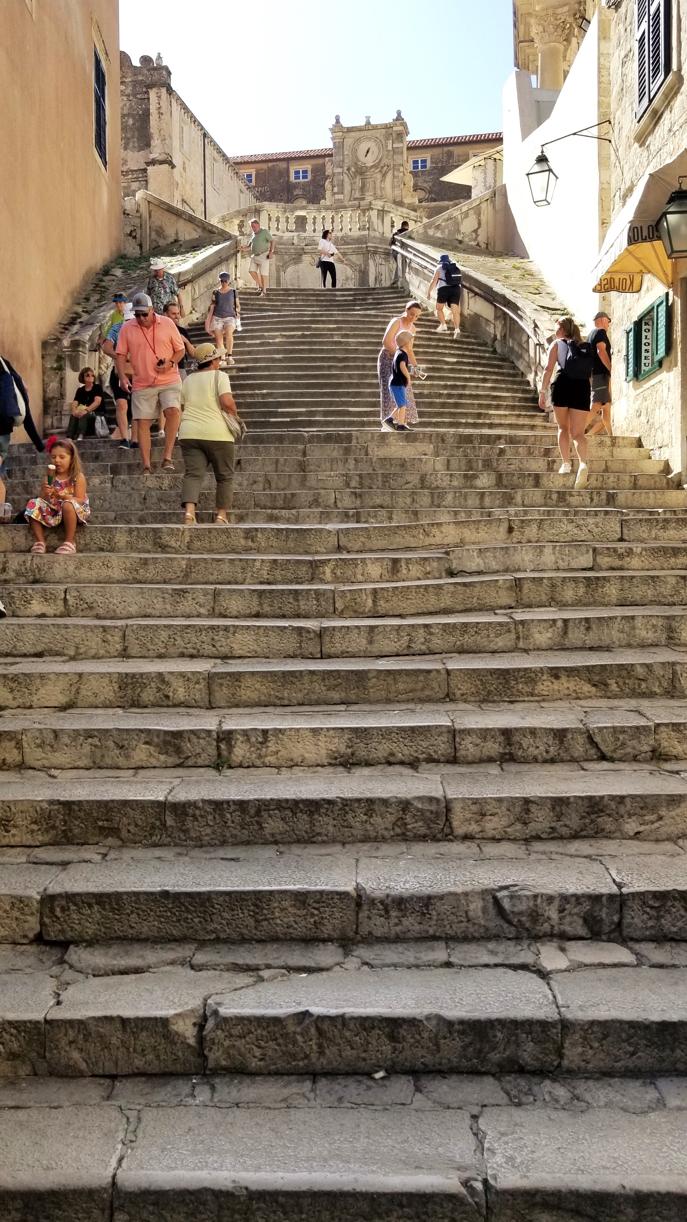 Now the stairway. We haven’t talked much about Dubrovnik and the Game of Thrones series. Dubrovnik was the main location for filming scenes involving “Kings Landing”. The fortifications at the harbor, the Stradum, and these stairs are all recognizable sites from the series. Because the series was so popular, hordes of groupies (are film fanatics called groupies?) want to tour this city. That adds a bit of extra foot traffic to the 2-3 cruise ship, and 5-6 bus tours that arrive here daily. But, we’re here so we’re going to see these sites! Have to say, the fortifications of this city are perfect for such a series.