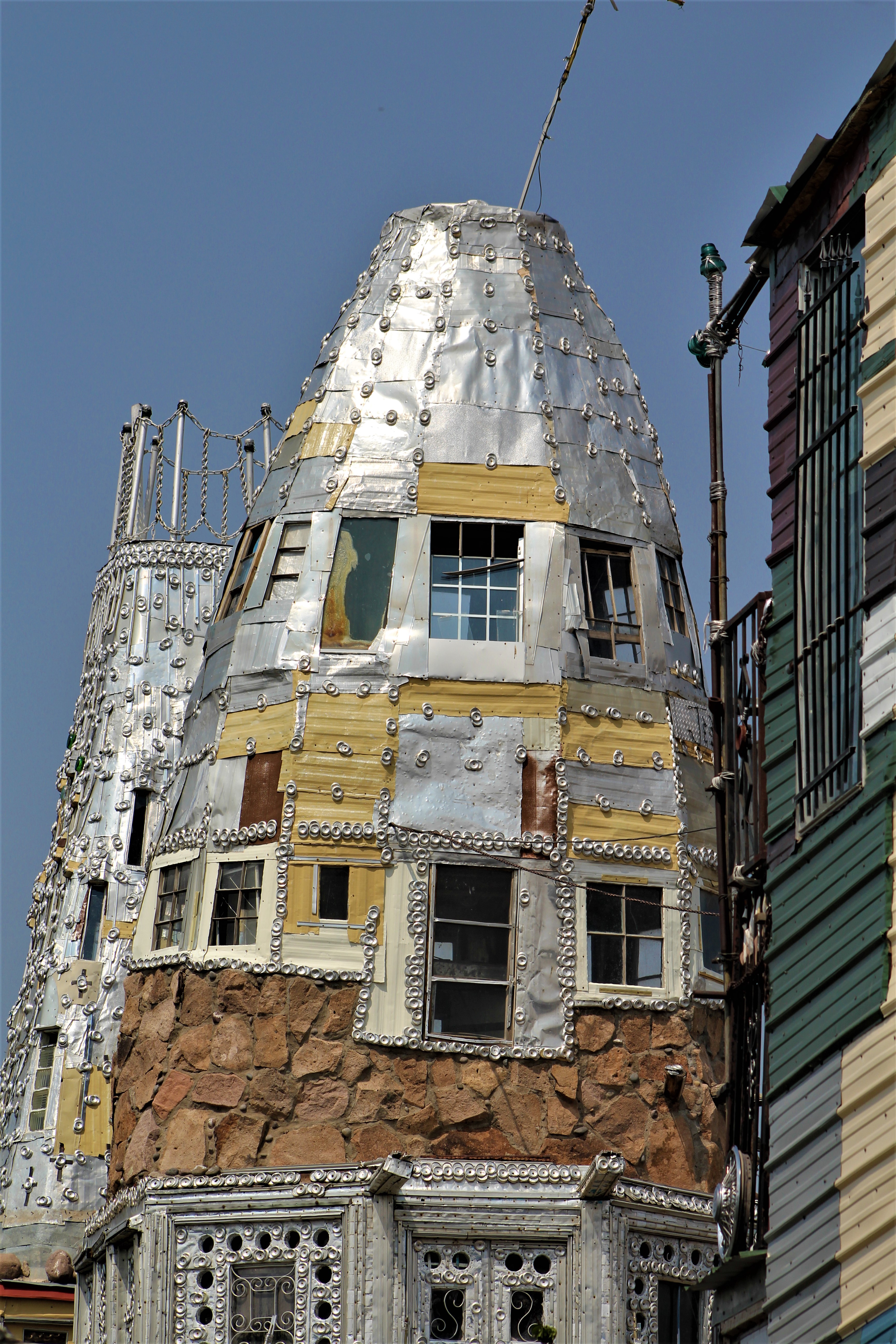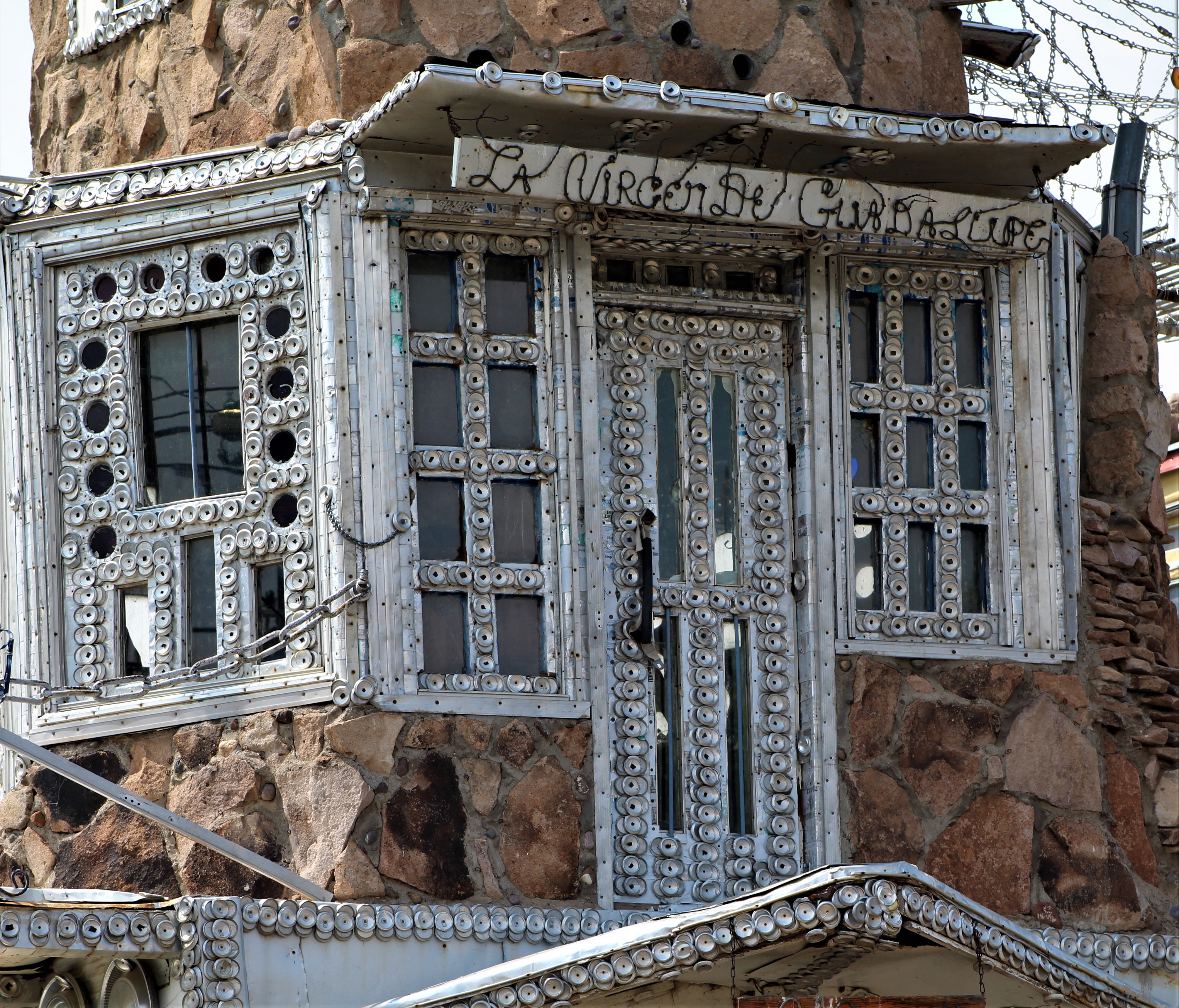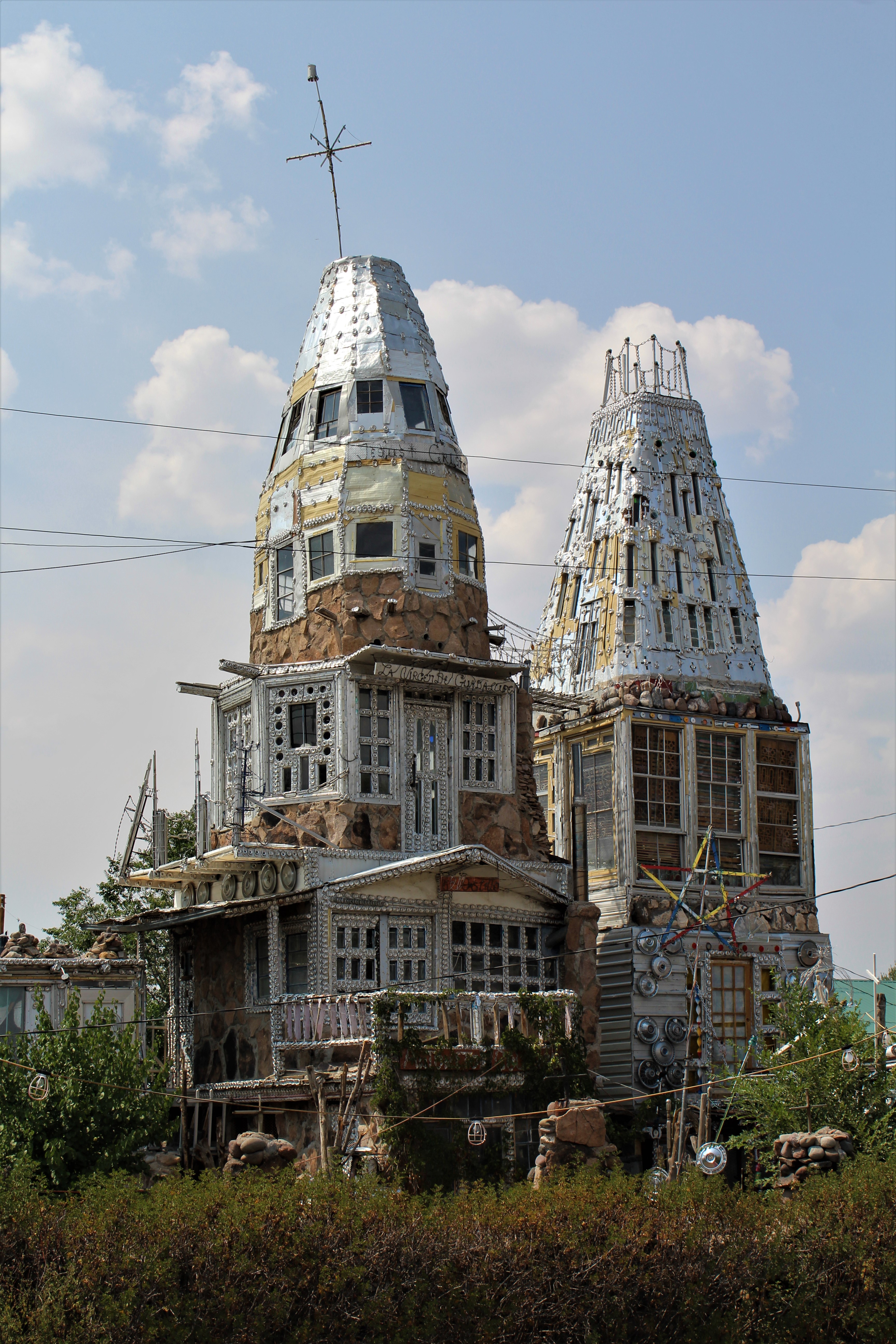 After this brief stop, on to the last site for our day trip, Cano’s Castle in Antonio, Colorado. This is a very unique “castle” in that is built using beer cans, hub caps, bike reflectors, and pieces of aluminum. Unique is an understatement. Consisting of four structures, “the King”, “the Queen”, “the Palace” and “the Rook”, Cano’s Castle is a testament to ingenuity. Built entirely by Dominic “Cano” Espinoza, a Native American Vietnam veteran, as a tribute to surviving his time in Vietnam. Cano says that Jesus lives in the “castle” while he lives across the street in a trailer. Best beer can folk art we’ve seen in Colorado.