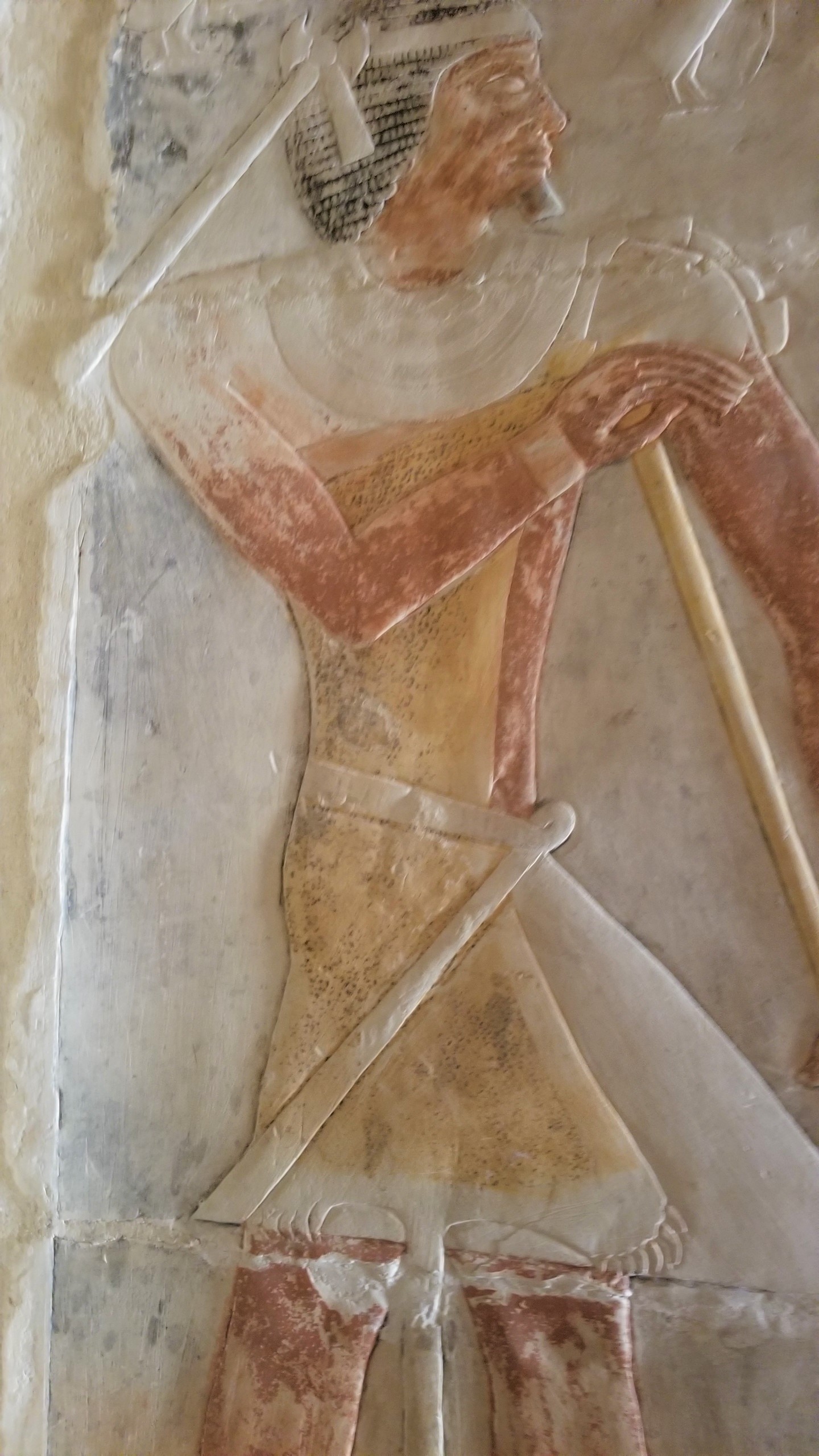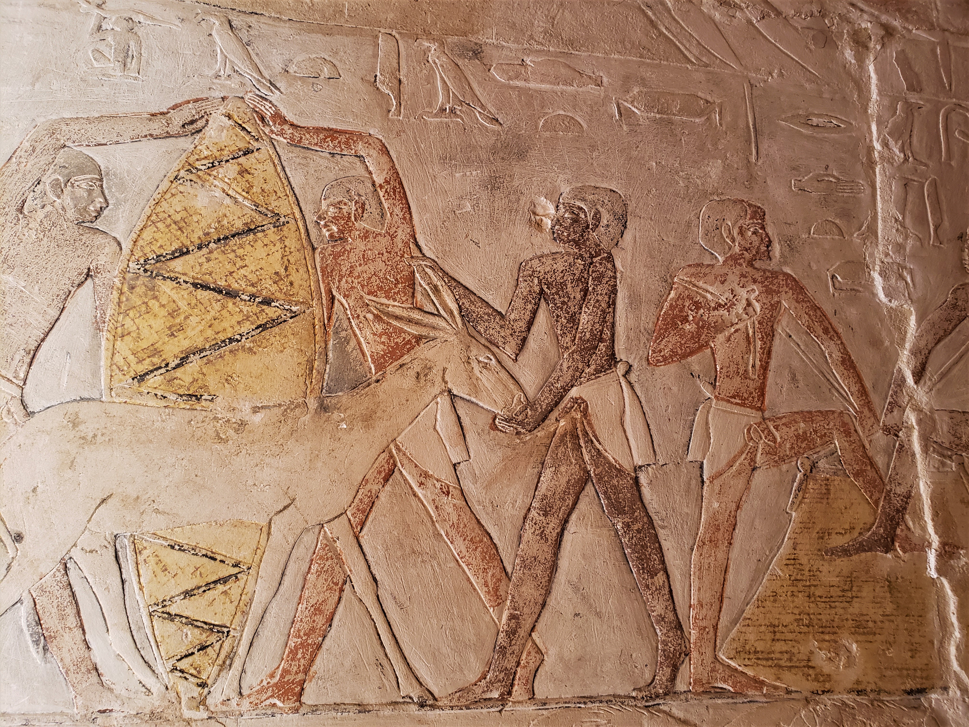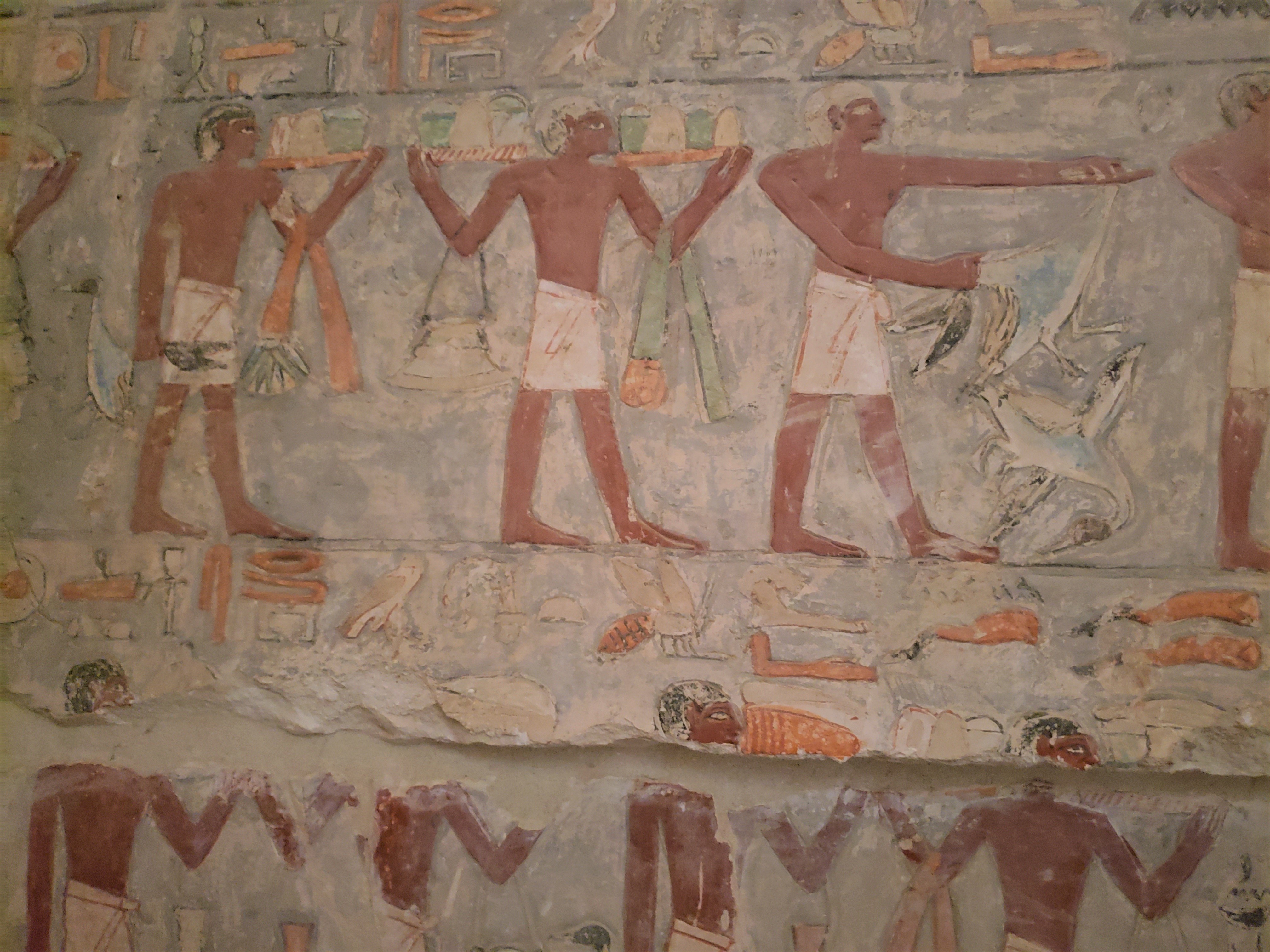 One last site to see here in Saqqara was the tomb of Mehu, Chief Justice and Vizier (Priest) for King Teti. What is significant here are the hieroglyphics depicting his, and his wife’s lives. This tomb is closed to the public but our guide, Sabry, was able to have the keeper unlock the door to allow us in, for a tip of about $2USD. More than worth the money! Some of these hieroglyphics, like glass blowers, are seen no where else in Egypt. Amazing. And the colors seemed so fresh and real, but no restoration has been made here. These depictions are almost exactly as they were when made over 4500 years ago!