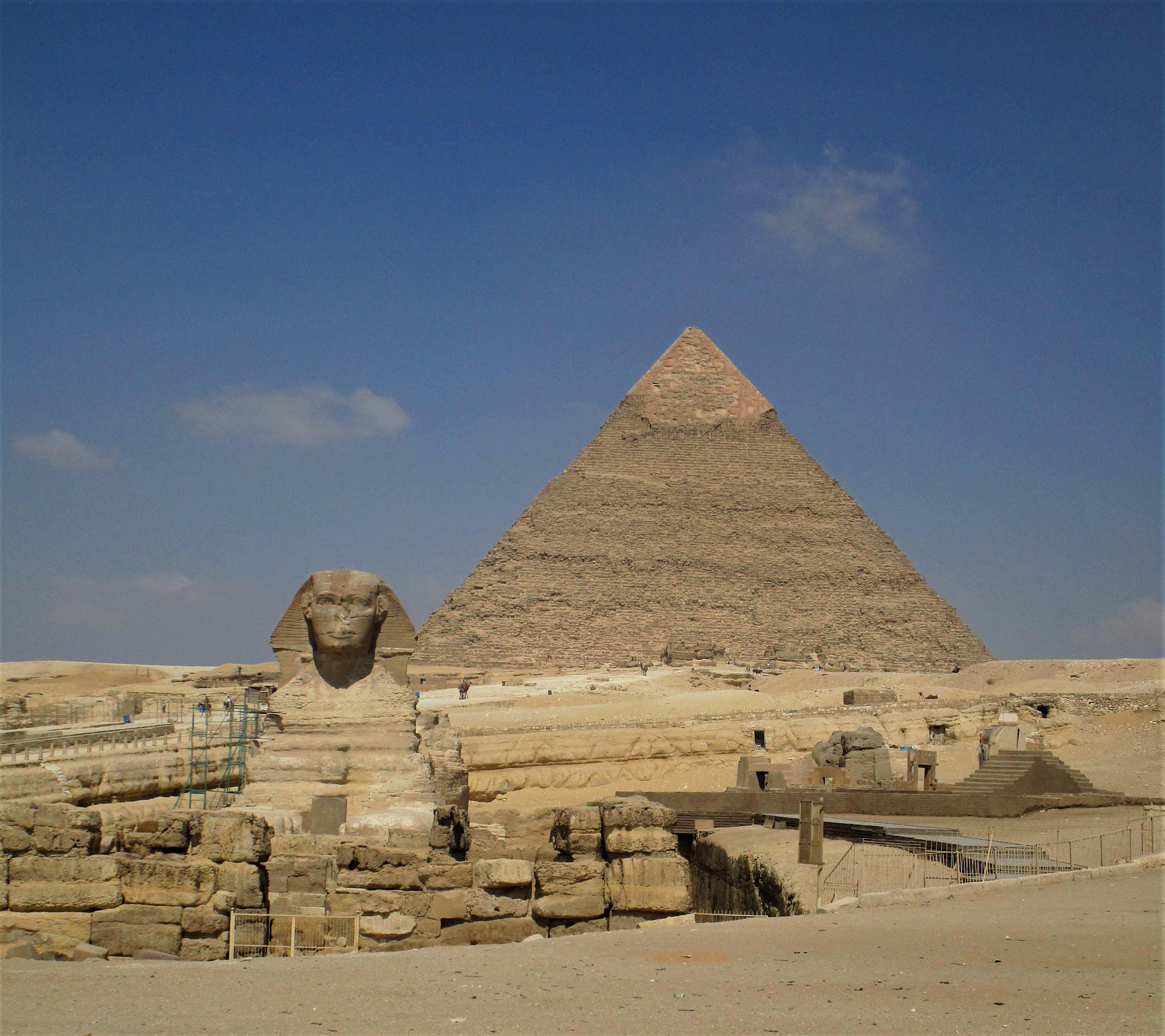 Now on with the story. We visited the pyramids of Giza built by the three pharaohs Khufu, Khafre and Menkaure. Next stop was the Sphinx.  The Sphinx was a mythical creature with the body of a lion and the head of a human. It stands in front of the second pyramid, Khafre’s, and is a likeness of him as a lion guarding the causeway into his pyramid. Originally thought to have been built around 2500 BC, new data suggests that the actual date may be closer to 7000 BC. (This would be a bit of a conflicting since King Khafre ruled Egypt from around 2575 BC.) There is nothing inside the sphinx as it is a solid piece of limestone. However, there are several tunnels located under the Sphinx that were discovered in 2019.