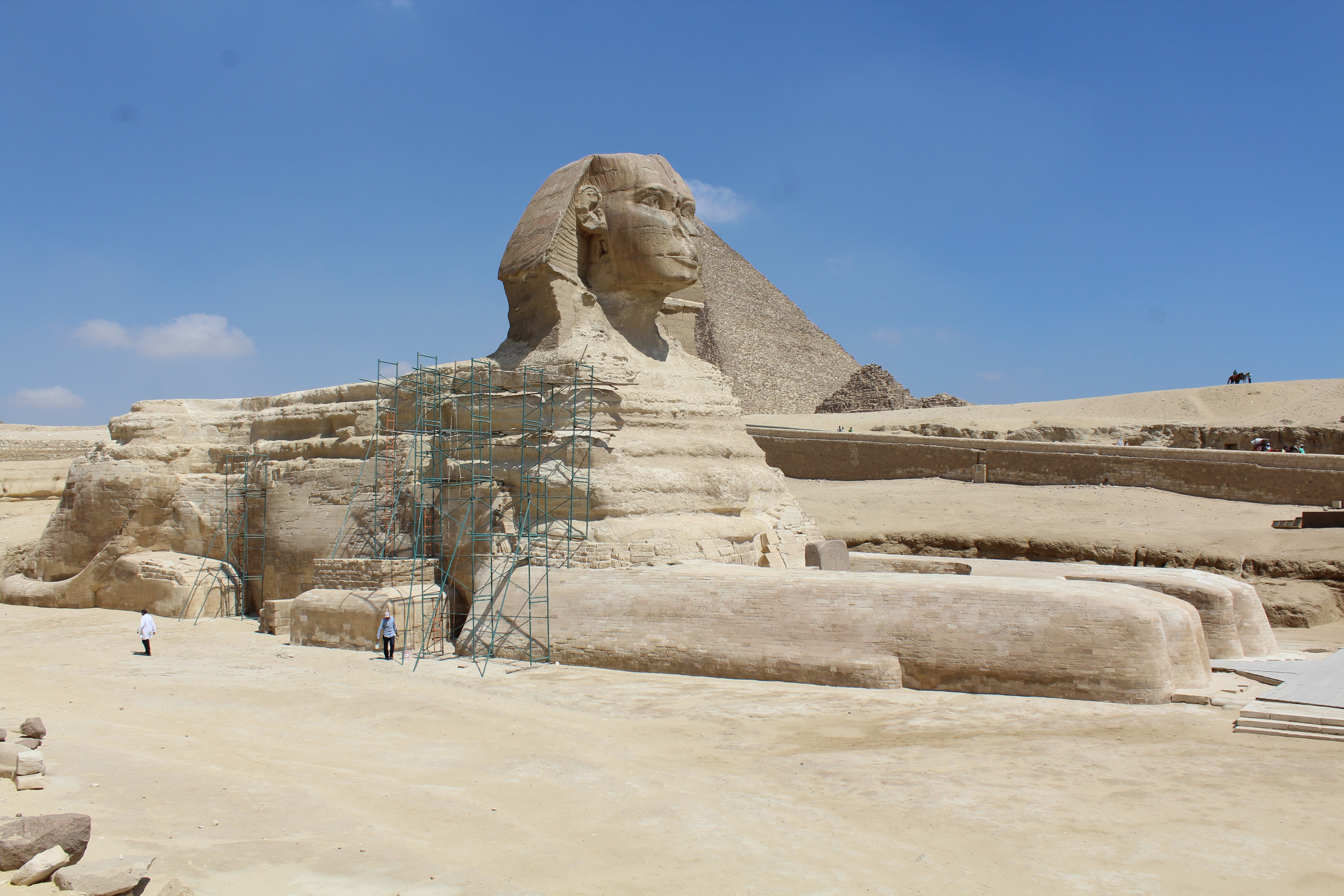 The Sphinx was part of a funerary site that began with a mummification area where the body was allowed to dry for 70 days. The body would be treated with salt, sand and placed in the sun to remove moisture. Next would be the “prep” room where the important organs, stomach, liver, lungs, and intestines, were placed in marble jars, that were placed in a marble container, to be saved for the after-life. The brain was removed through the nose or a small opening made in the back of the head and discarded. The heart was left in place as it was believed to be the center of intelligence. (Think with your heart, not your head) These areas are located directly in front of the Sphinx and connected via a covered sandstone walkway. Behind the Sphinx is the final resting grounds for the king, the pyramid.