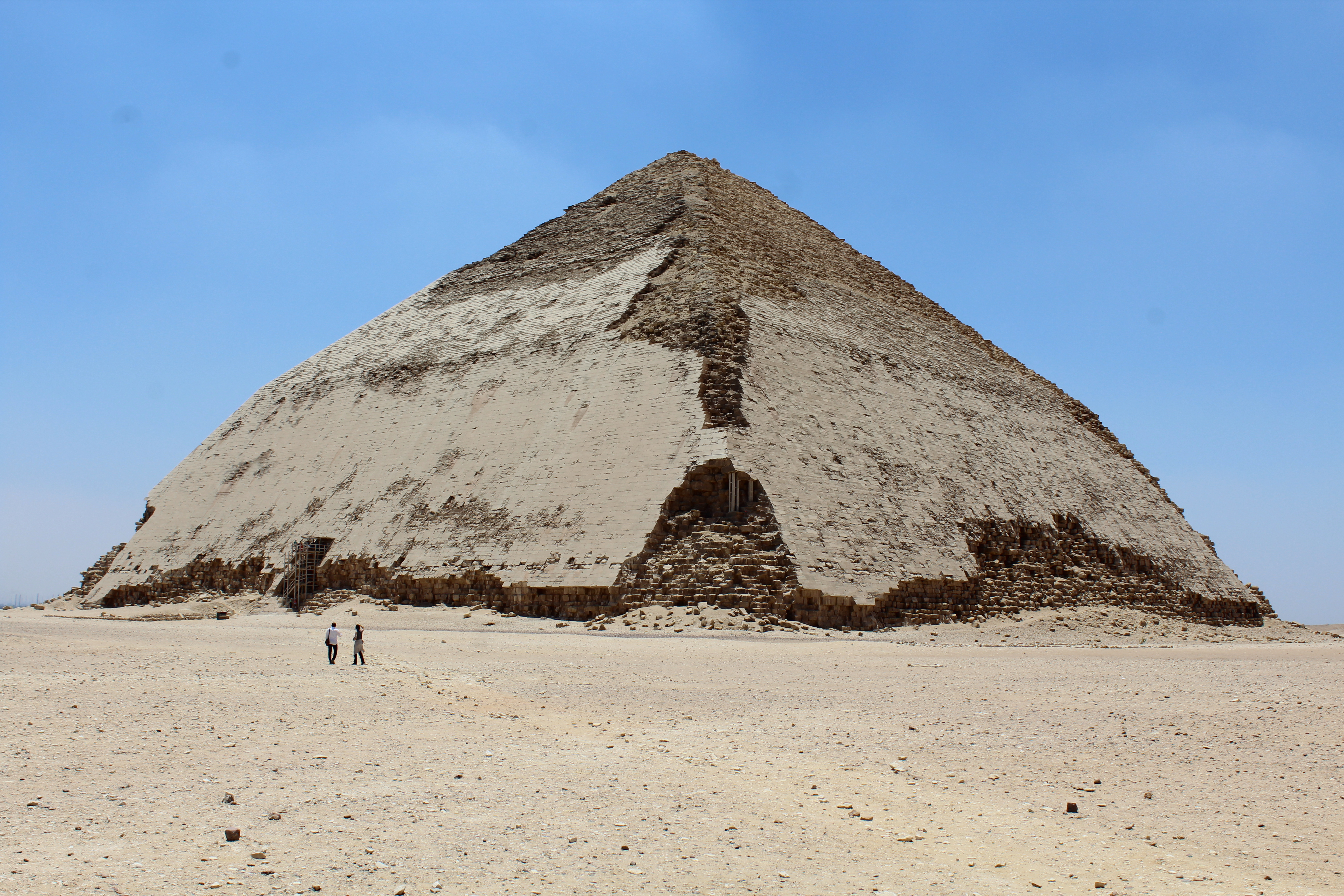 Going back still farther with Sneffy, is the Bent Pyramid. This pyramid is what happens when you plan a project and either run out of money or patience. It began as a smooth-sided pyramid with 54 degree sides, for about 165’, then for reasons unknown the angle was changed to 43 degrees to finish the build. That’s why it’s called “Bent”.