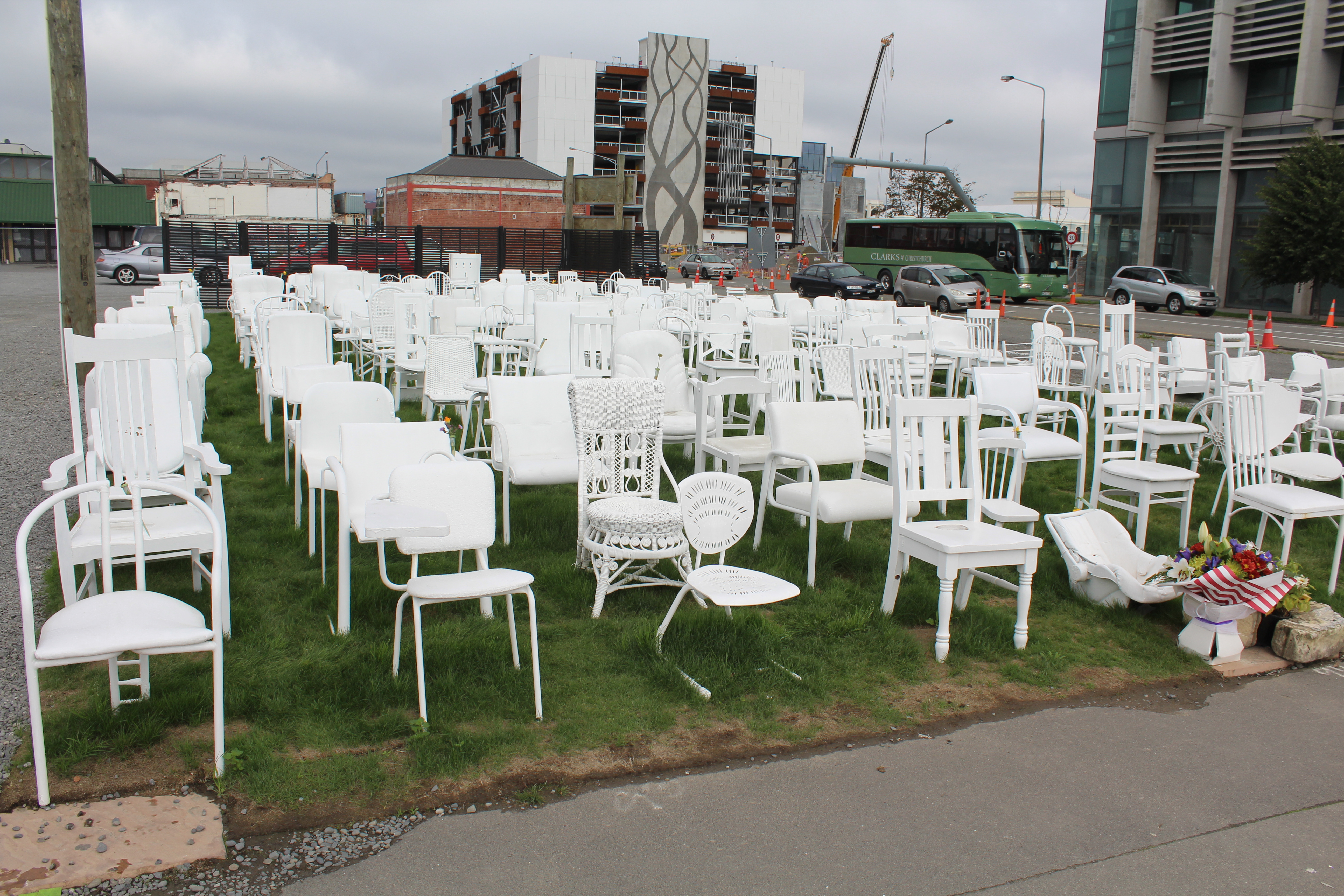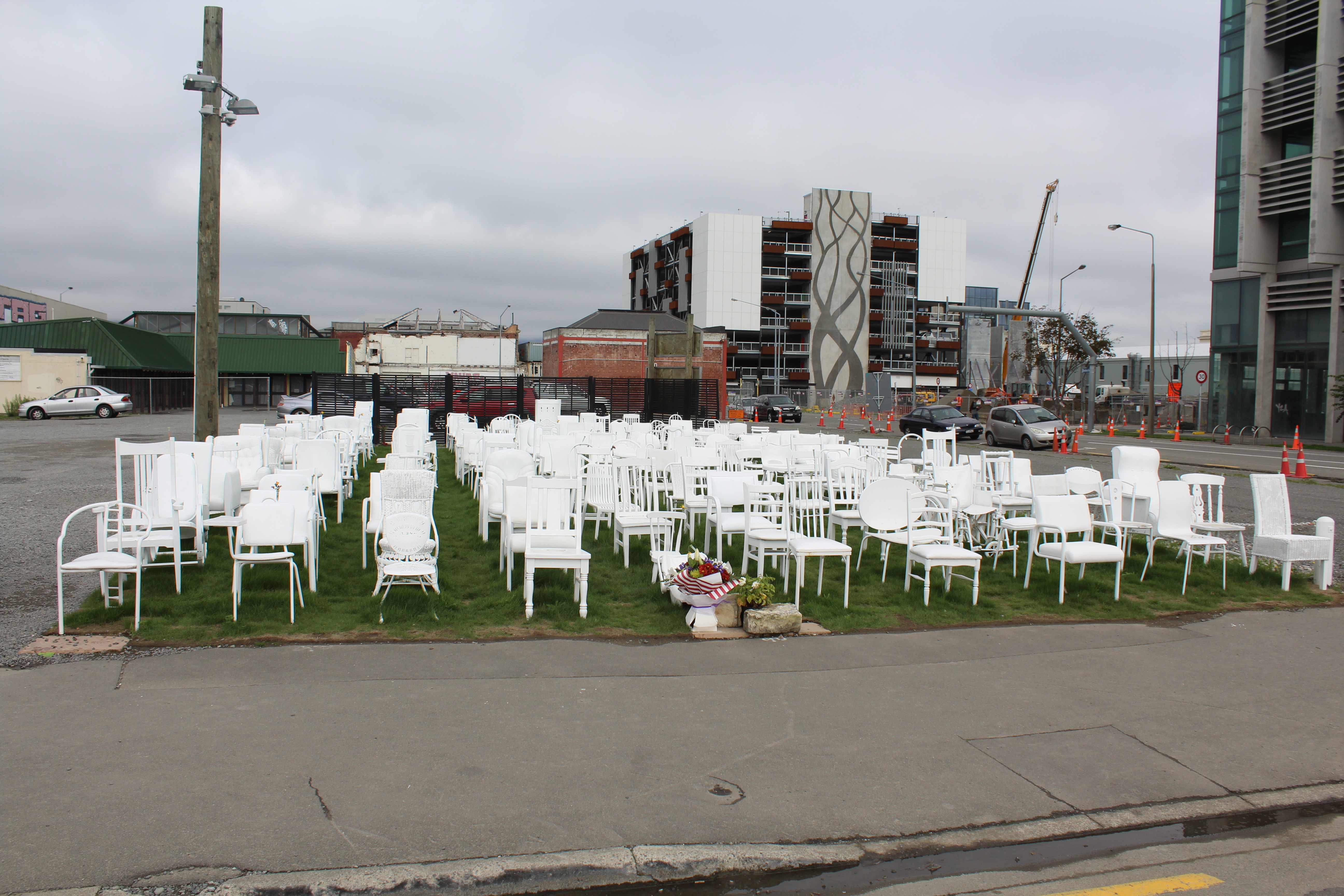 Down the street from Restart is a temporary memorial installation of 185 various chairs representing the individual’s that lost their lives in the quake.