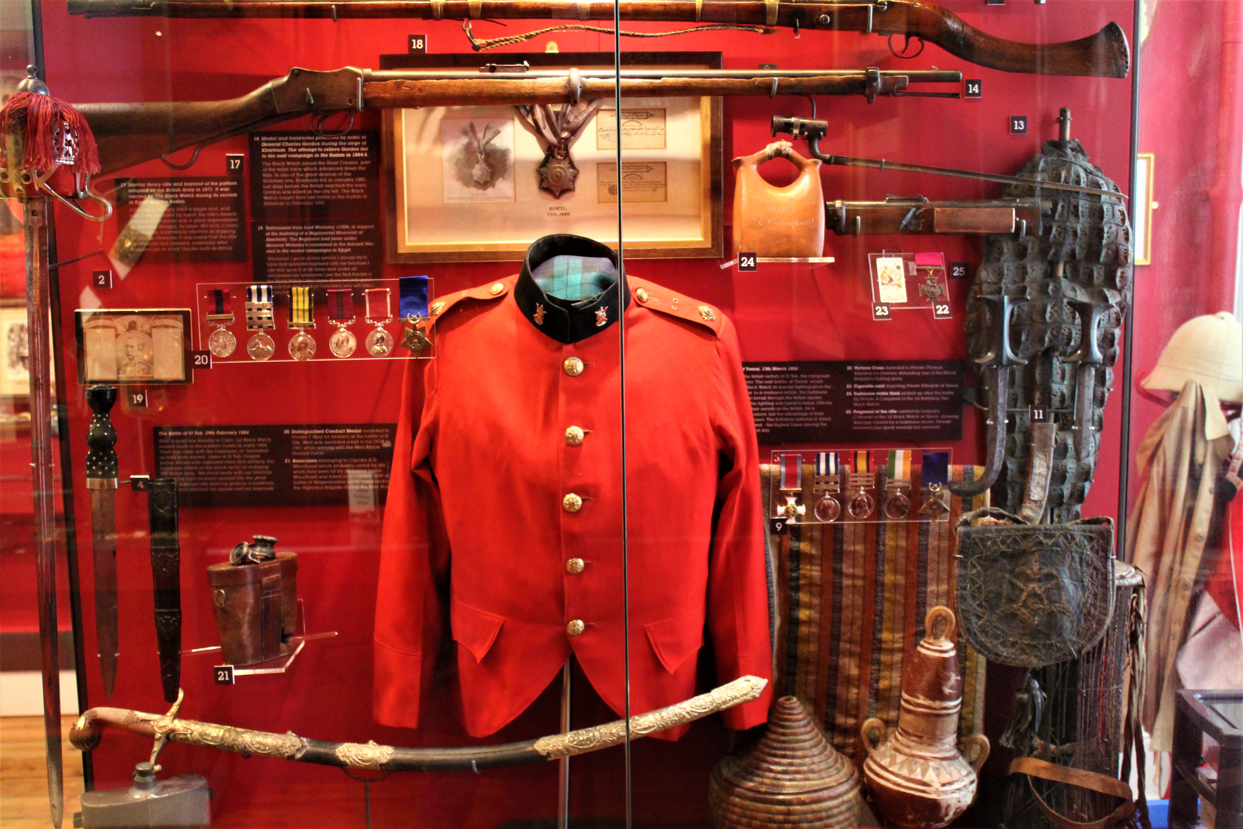 The museum is located in a rebuilt castle now called, “Balhousie Castle”.  “Rebuilt” may be a misnomer as the entire castle was “rebuilt” with a rubble wall being the only original structure remaining today. Cost was 13GBP or $15.99USD with our senior discount which gave us access to all 13 exhibit rooms. The displays included everything from early 1800 paintings and drawings of the Black Watch, to current uniforms and weapons. In all, a pretty good museum.