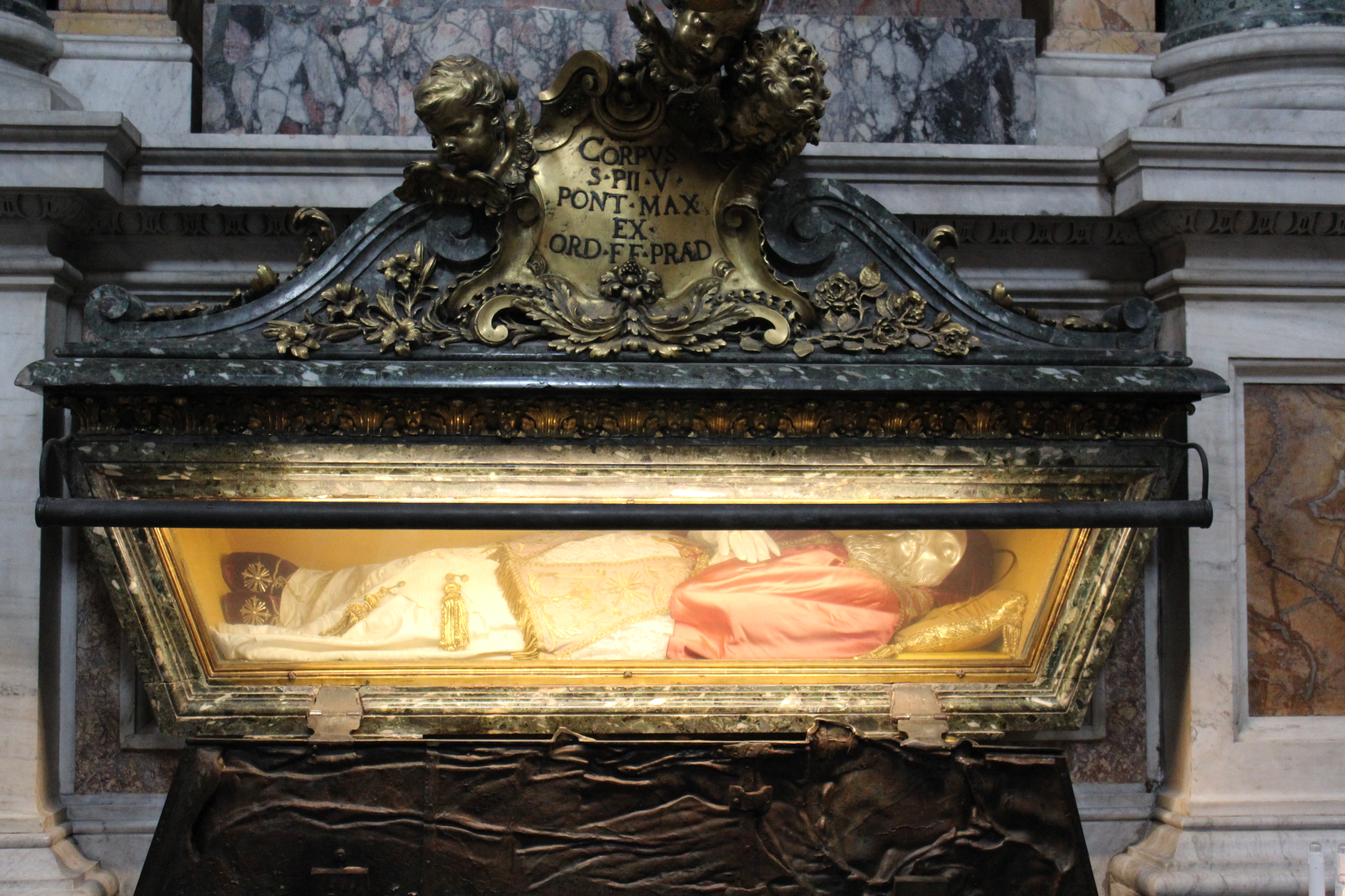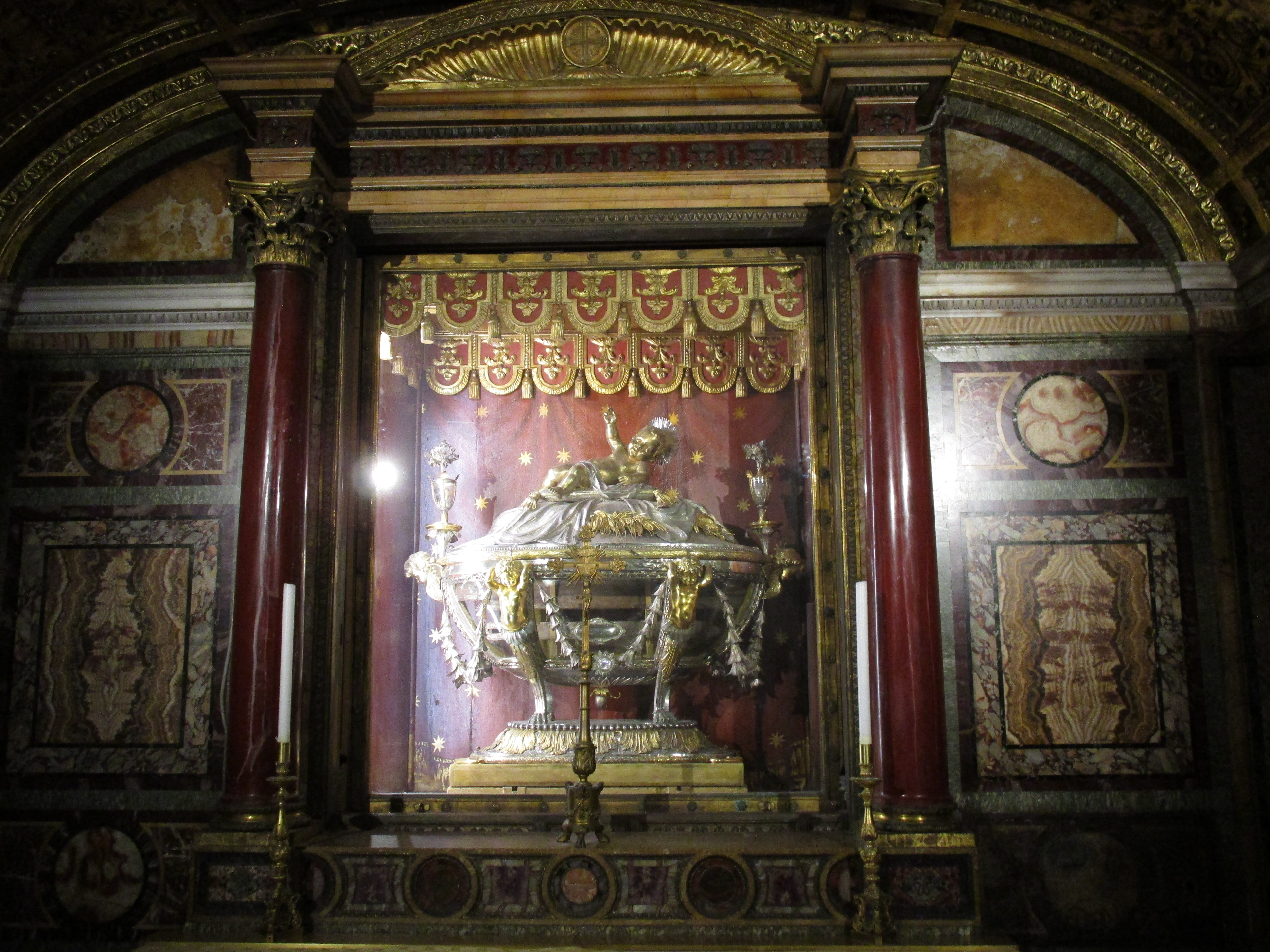 Today the church houses a celebrated relic known as the, “Holy Crib”. Under the high altar is a statue of Pope Pius IX kneeling before the crypt and the urn containing pieces of the crib that held the baby Jesus.