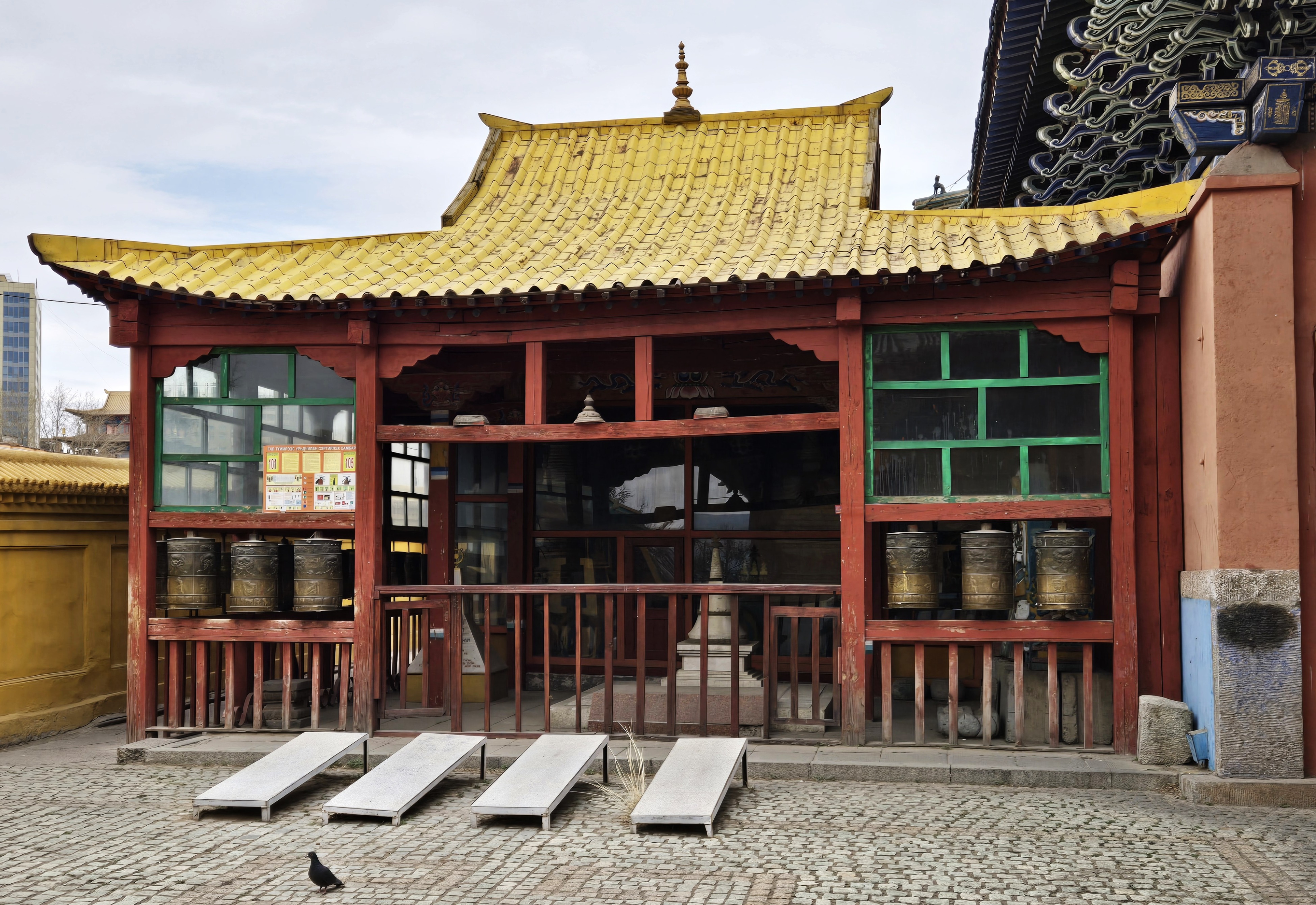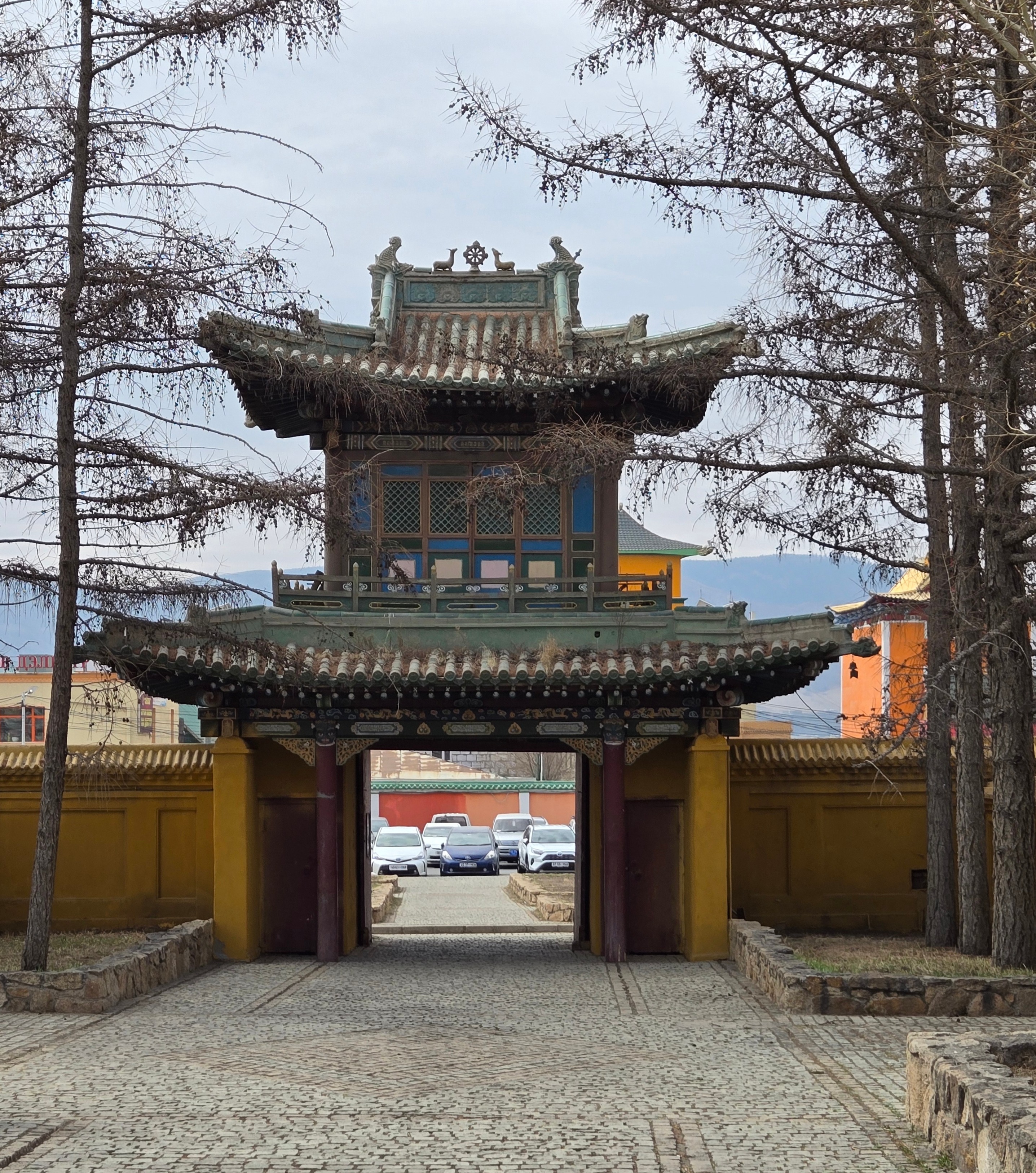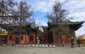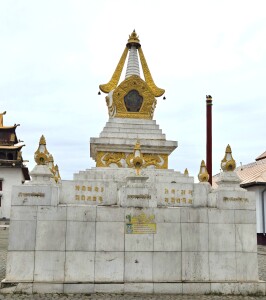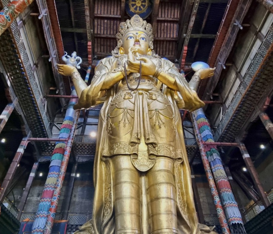 The monastery complex features traditional Mongolian architecture, with intricately designed temples, statues, and stupas. The main temple, Migjid Janraisig Sum, houses a 26.5-meter-high (87’) statue of Avalokitesvara (Buddha), adorned with gold and precious stones.