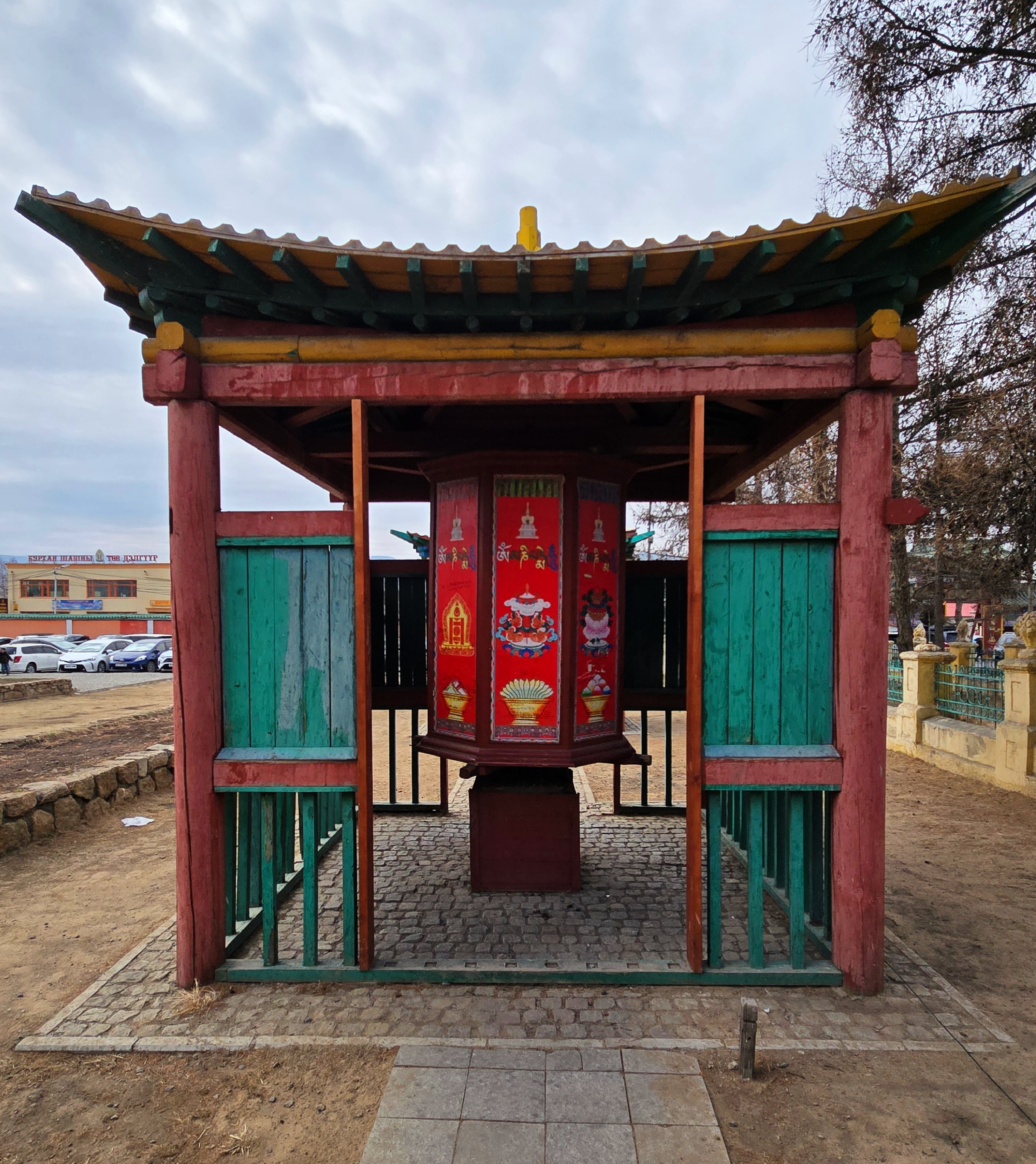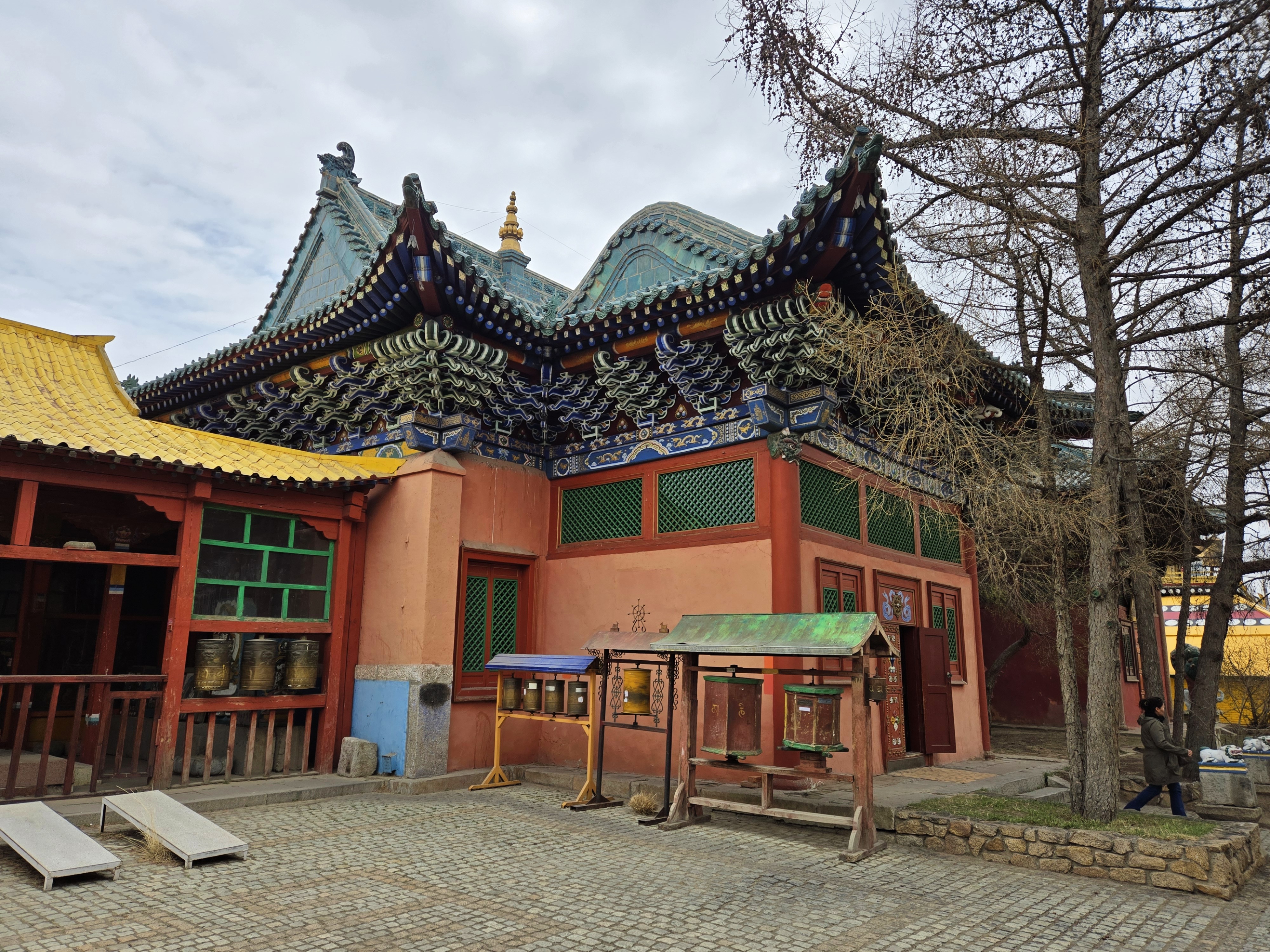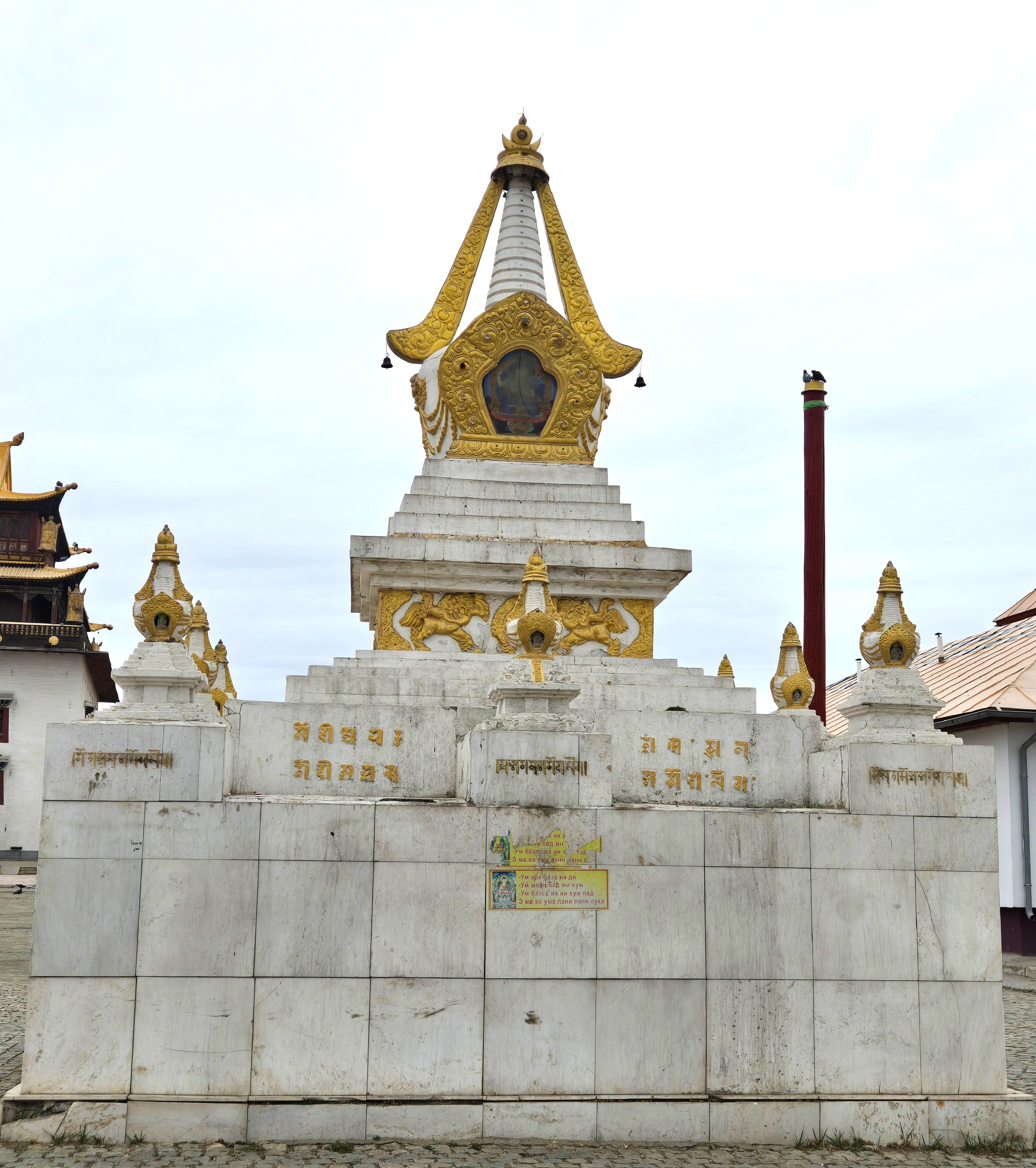The monastery complex features traditional Mongolian architecture, with intricately designed temples, statues, and stupas. The main temple, Migjid Janraisig Sum, houses a 26.5-meter-high (87’) statue of Avalokitesvara (Buddha), adorned with gold and precious stones.