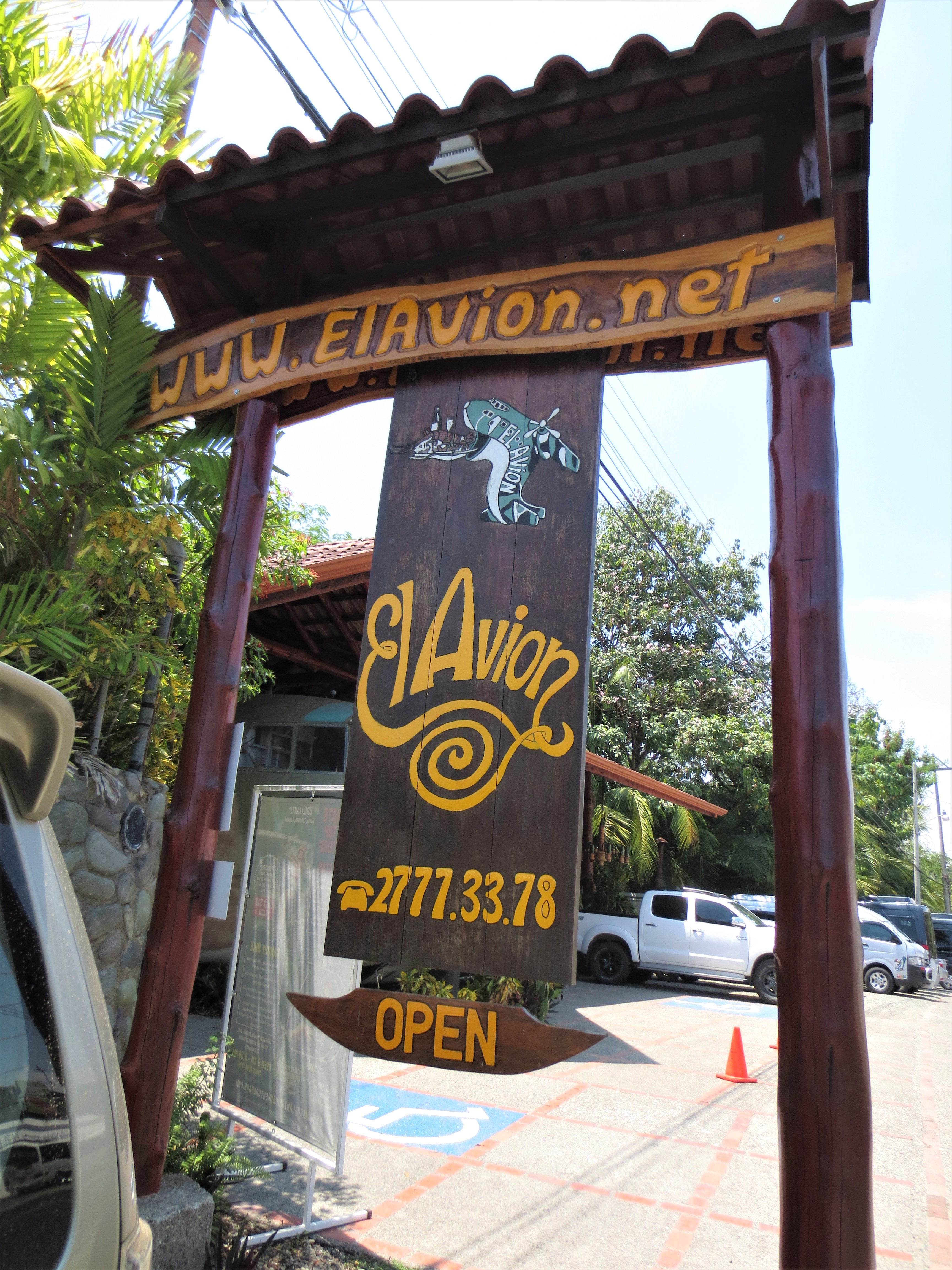 We loaded up El Haut Rod and headed off to the ferry for another easy drive. Just take highway 17, 23, 27, 34 and look for the sign, “The Falls Resort at Manuel Antonio”. Simple, but we missed it, so we decided to stop for lunch and regroup. Perfect timing, there was a restaurant immediately to our left so that’s the place. Looked kinda interesting, it was the front end of a Fairchild C123 plane sticking out from under the roof. Closer look we discovered that it was the entire airplane under the roof and the fuselage was the bar. Pretty cool!