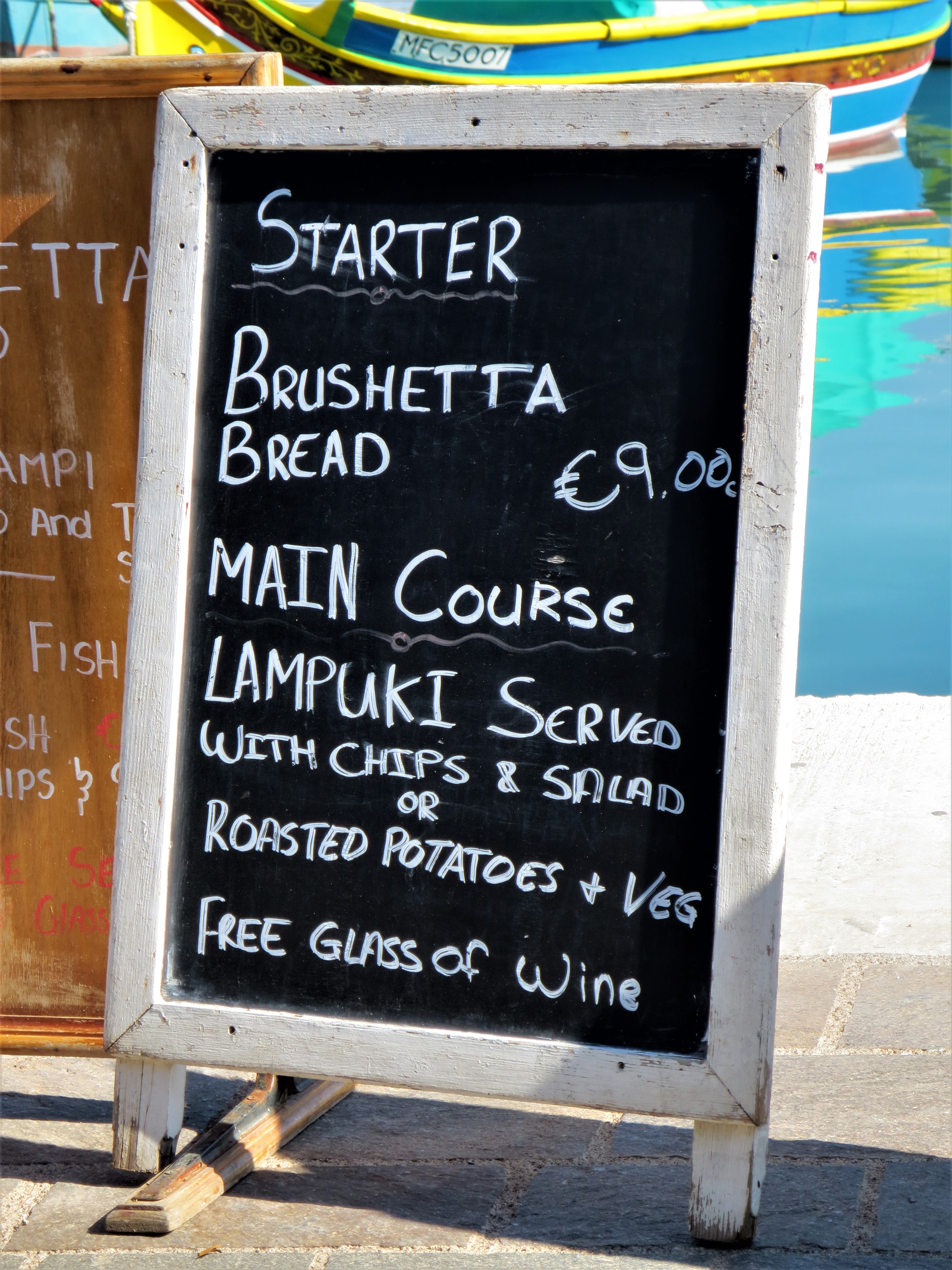 After all this riding it was time to eat once again. Marsaxlokk has a pretty good selection of seafront restaurants so this was going to be lunch. Collette still can’t pass up a good deal on local fish so it was lampuki (no I didn’t make the name up) for her and I got adventurous as well with a hamburger. Lampuki is said to be the Maltese equivalent of mahi-mahi or dorado but it didn’t look quite like that when Collette got hers. My guess would have been a large sardine but not my call. So as usual the fish arrives whole and with a pleasant looking chopped tomato and onion sauce covering the fish, yum!