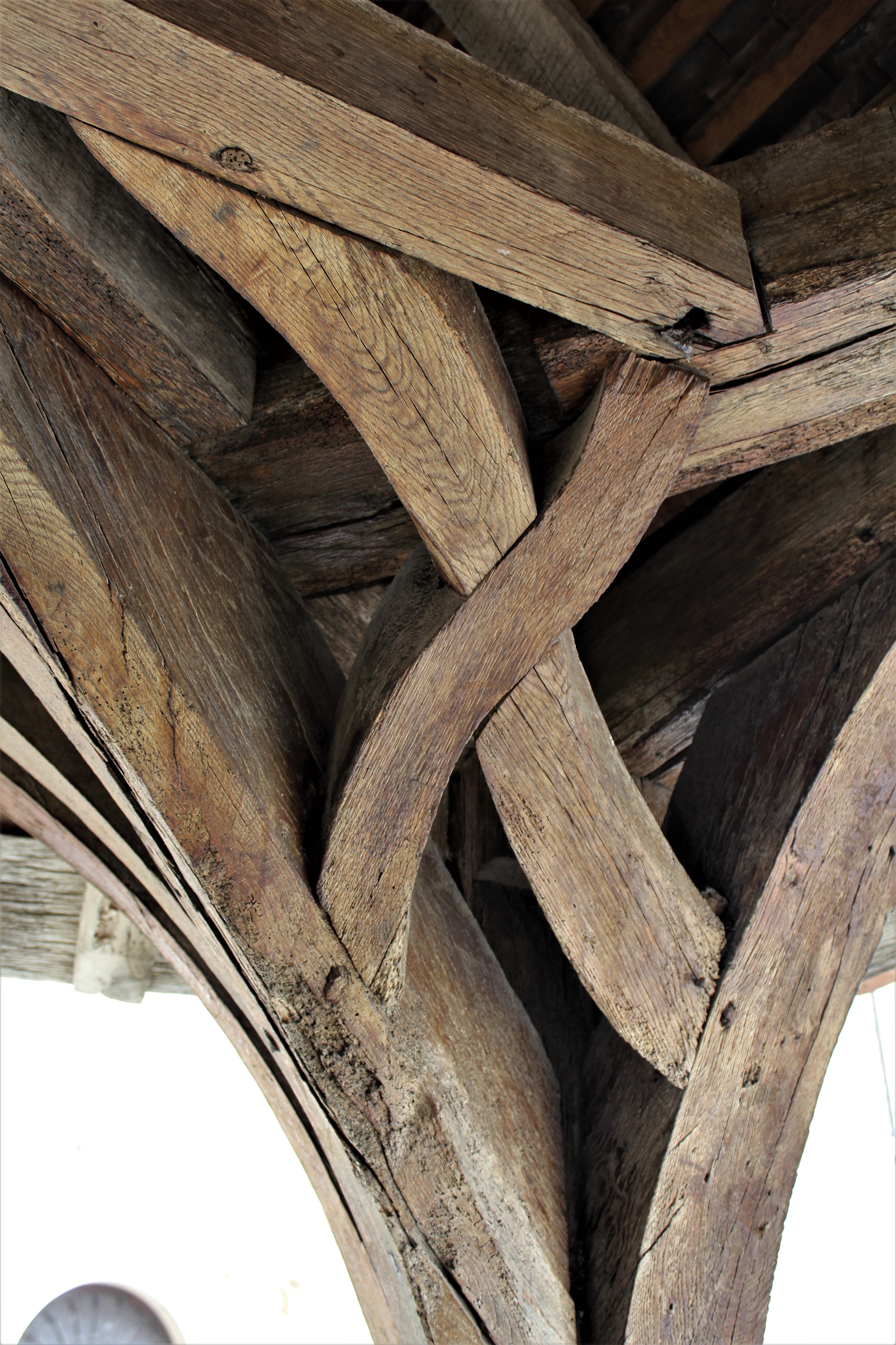 Roof support detail. The cross member is not cut and fitted in a slot, it is one solid piece weaved through the other.