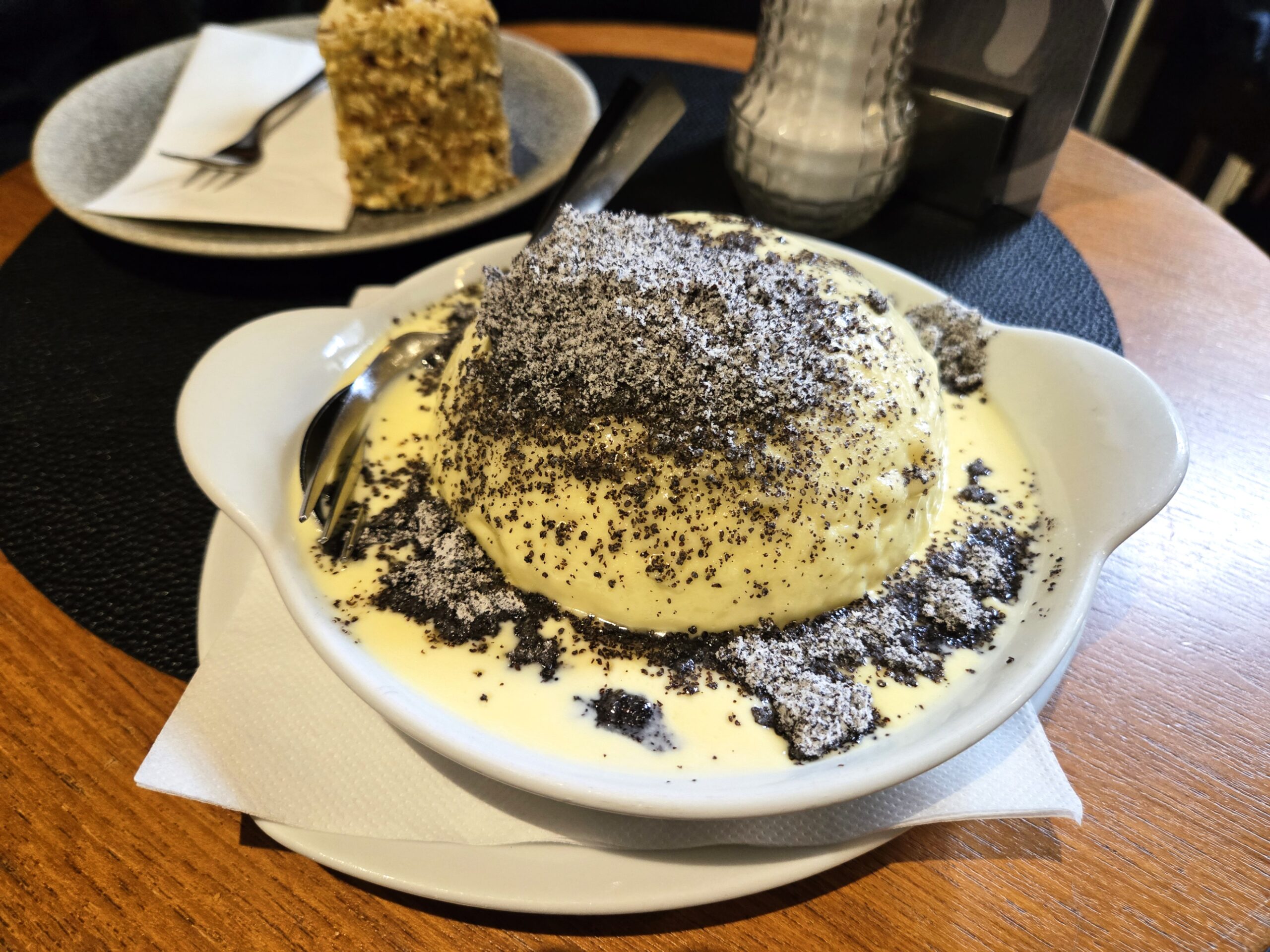 My Germknodel, yummy! Fruit filled dumpling with hot cream sauce and crushed sesame seeds and powdered sugar.